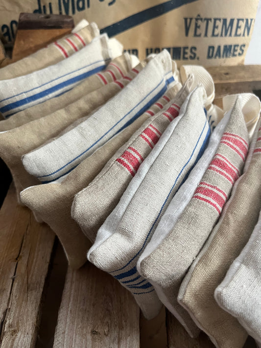 Lavendel-Trio: Große Duftkissen mit Streifen aus altem Leinen