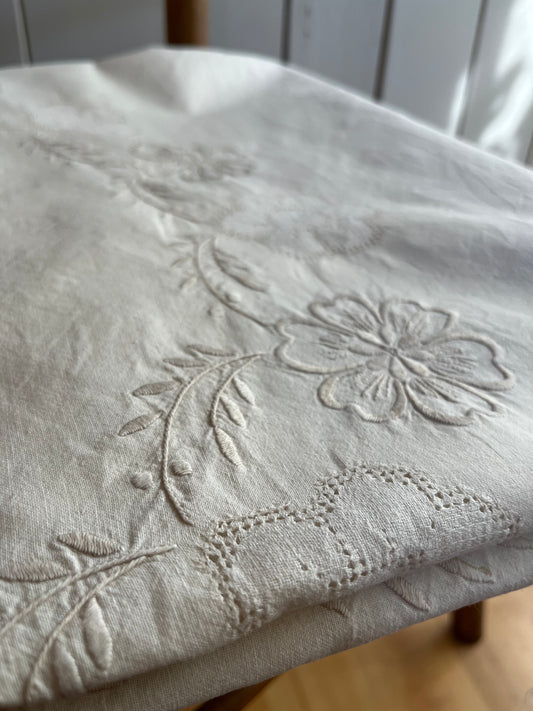 Französische Prunk-Tischdecke aus Leinen fantastische Richelieuarbeit 280 x 165