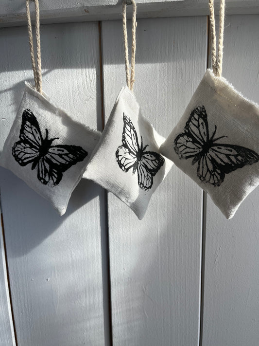 Lavendel-Butterfly: 3 große Duftkissen altes Leinen bedruckt mit Schmetterling