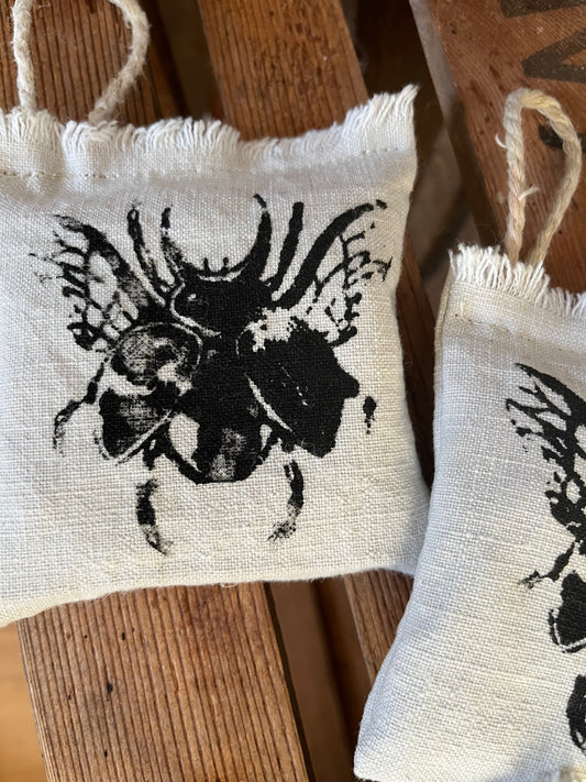 Lavendel-Käfer: 3 große Duftkissen altes Leinen bedruckt mit Käfer