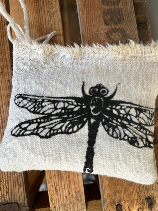 Lavendel-Libellen: 3 große Duftkissen altes Leinen bedruckt mit Libellen