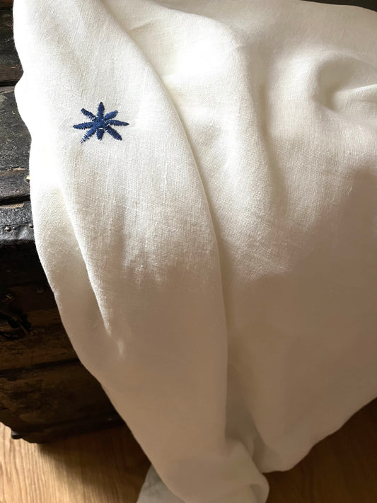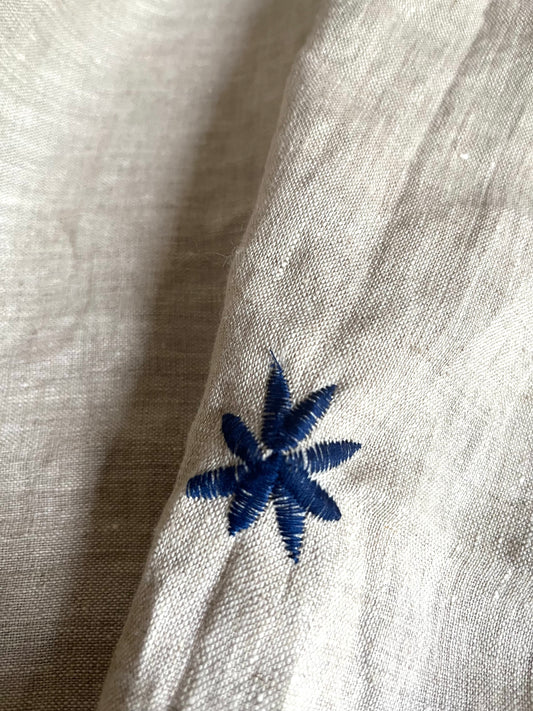 Just a Throw…Überwurf, Decke, Plaid aus naturfarbenem Leinen mit blauer Blüte