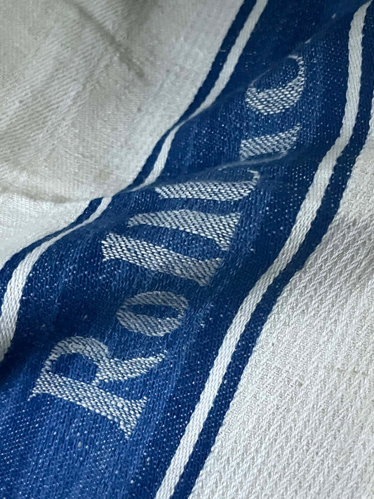 Jugendstil Mangeltuch mit blauen Streifen und Schrift 188 x 76