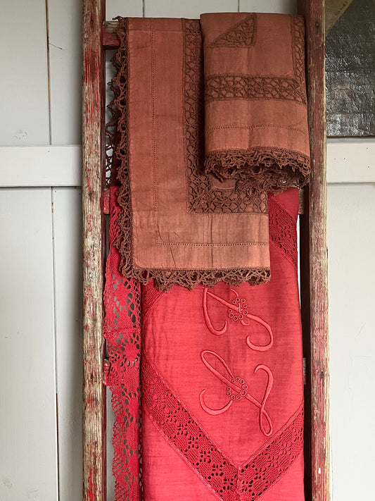 Trio: Alte französische Kissenbezüge mit Spitze, Monogramm und gefärbt