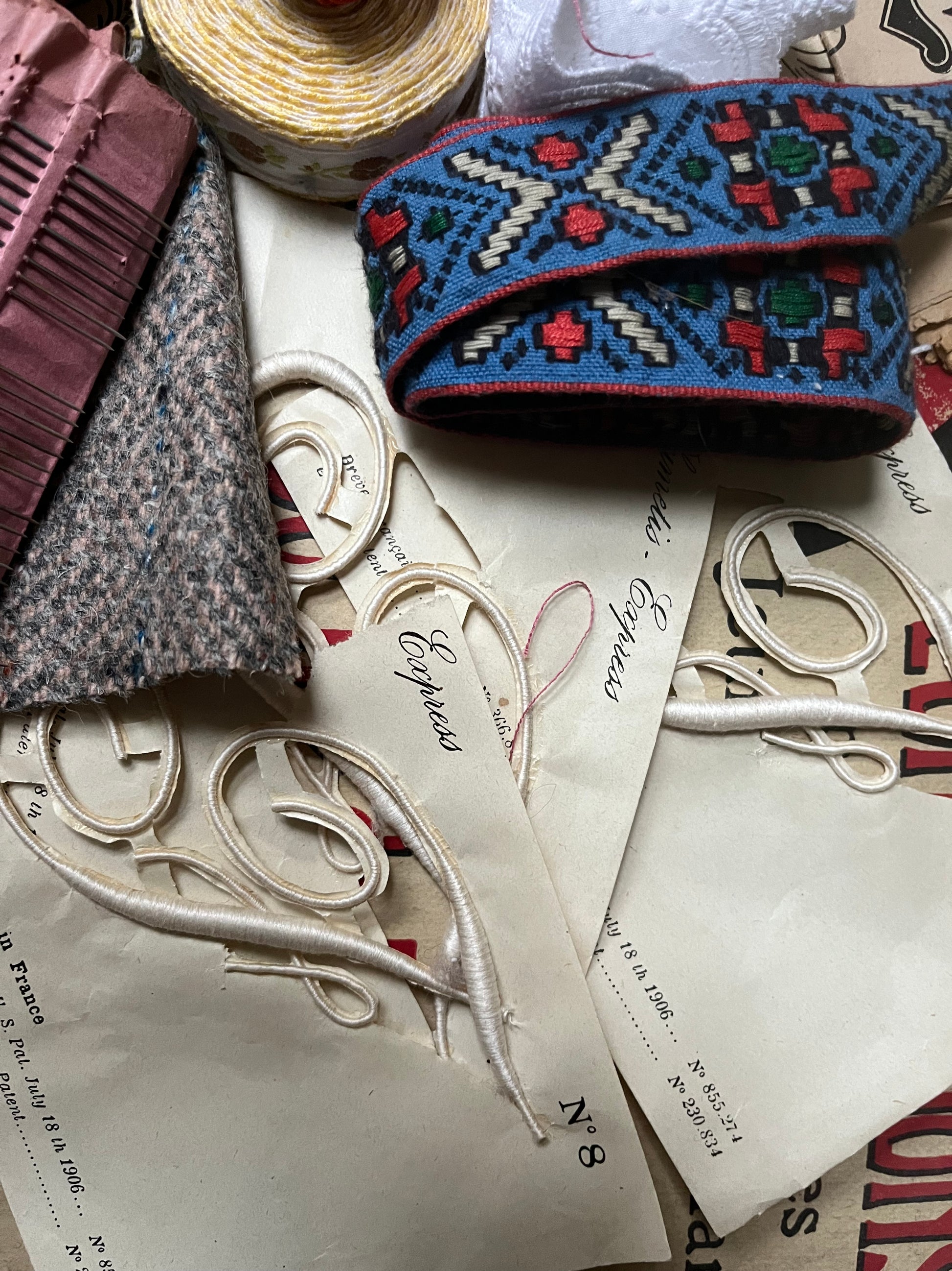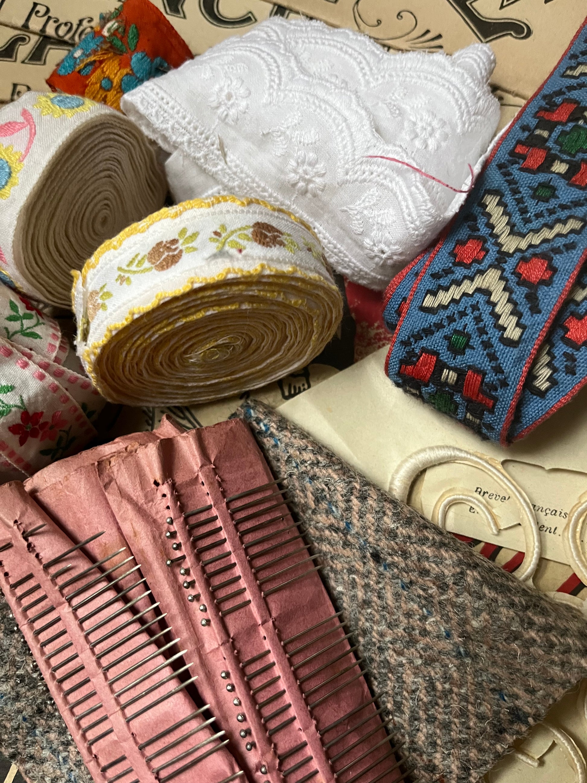 Jede Menge französische Accessoires für Näh- und Stickarbeiten. Es sind drei Hefte aus dem Jahr 1923 mit Stick-Vorlagen: „La Broderie Blanche“. Sechs verschiedene Bänder, original sehr alte Stecknadeln im Brief und drei alte Plumetis Express, Monogramme zum Aufnähen. Eine schöne Sammlung.