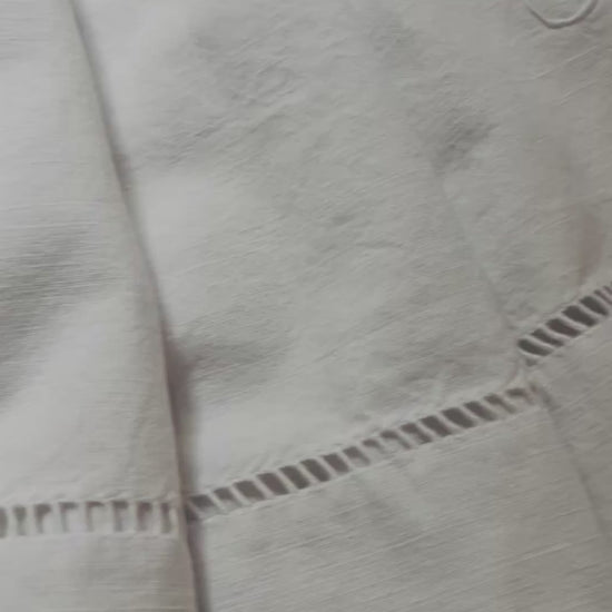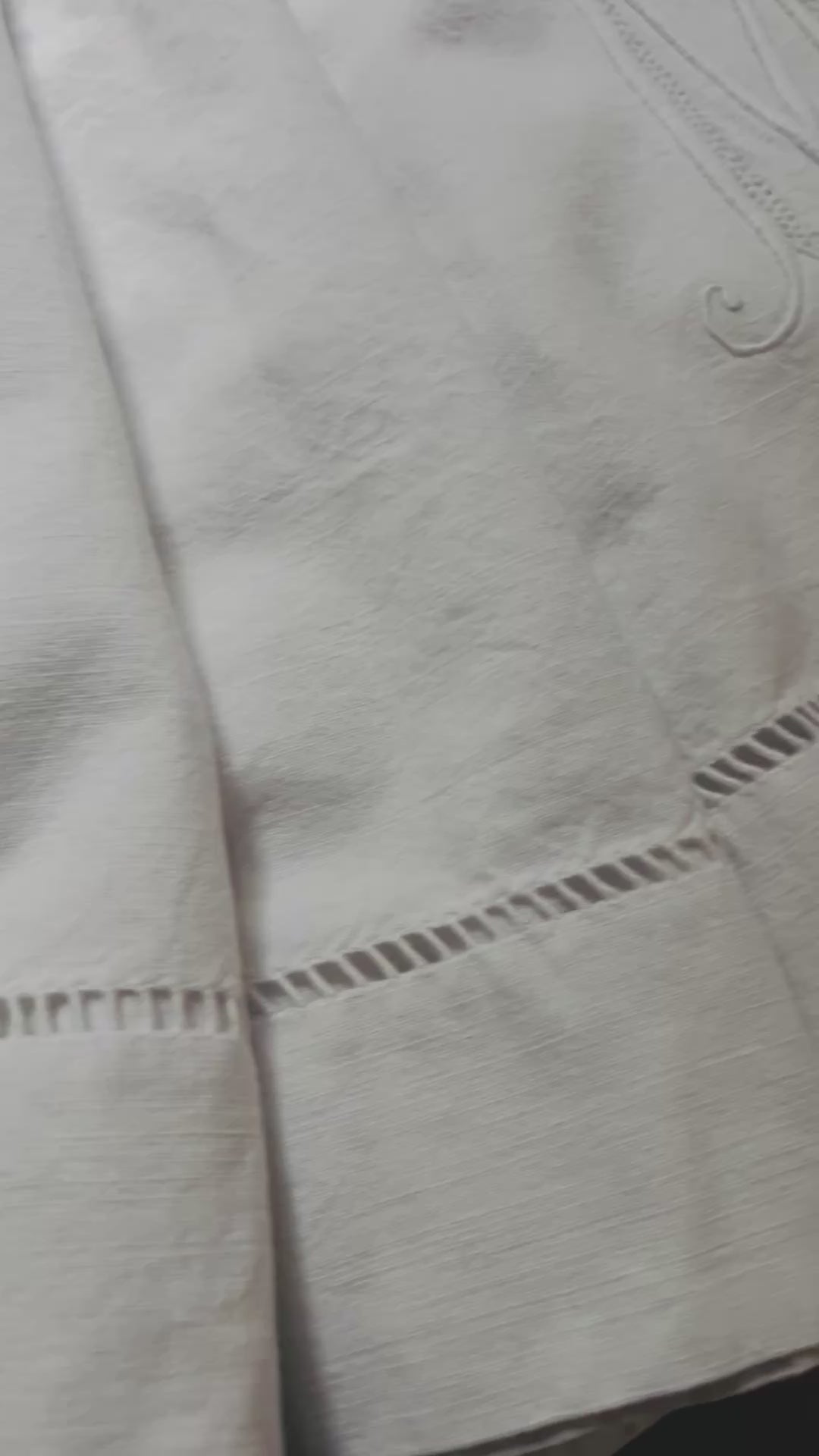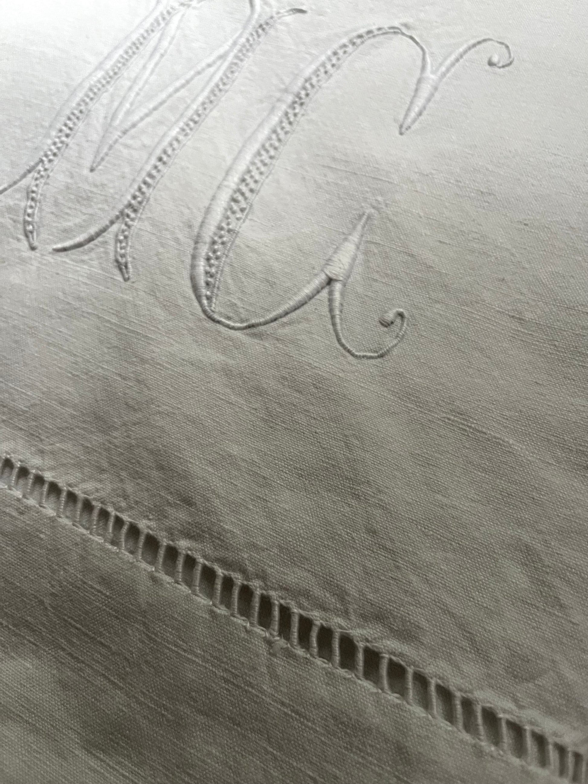 Ein großes und schweres Überschlaglaken aus Frankreich. Es gibt eine schöne breite Hohlsaumarbeit unterhalb des Monogramms, das nicht nur riesig, sondern auch detailverliebt gestickt ist. Das imposante Laken hat die Maße: 2,8 × 2 m und wiegt 1,8 Kilo. Es gibt nicht viel zu meckern, ich habe zwei minimale verblasste Lagerfleckchen gesehen am oberen Ende des Lakens. Sie fallen nicht ins Auge. Es ist gewaschen, sauber, keine Löcher. Material: dicht gewebtes Metis, Halbleinen, das in Belgien und Frankreich sehr geschätzt wird. Monogramm: MC.