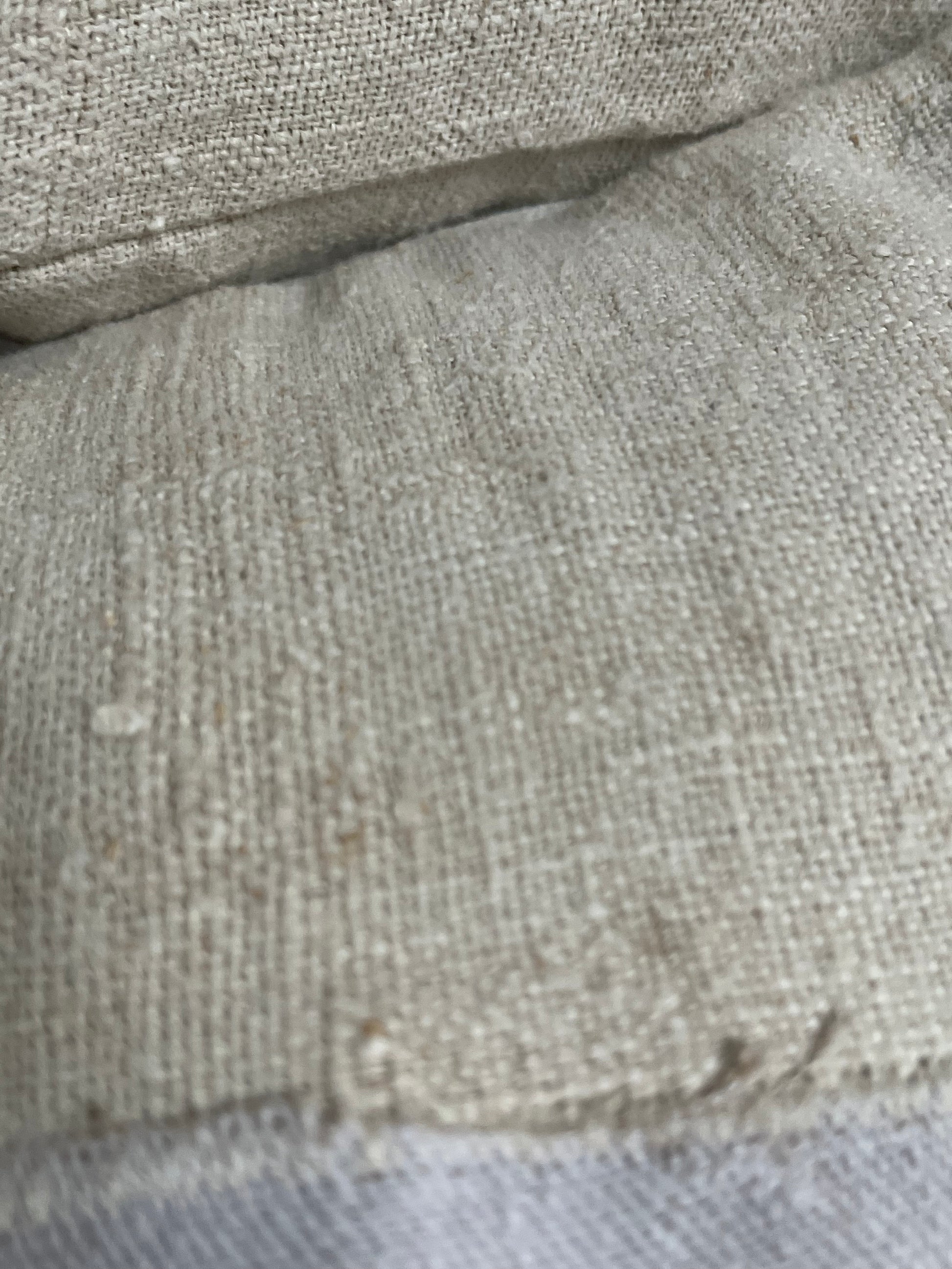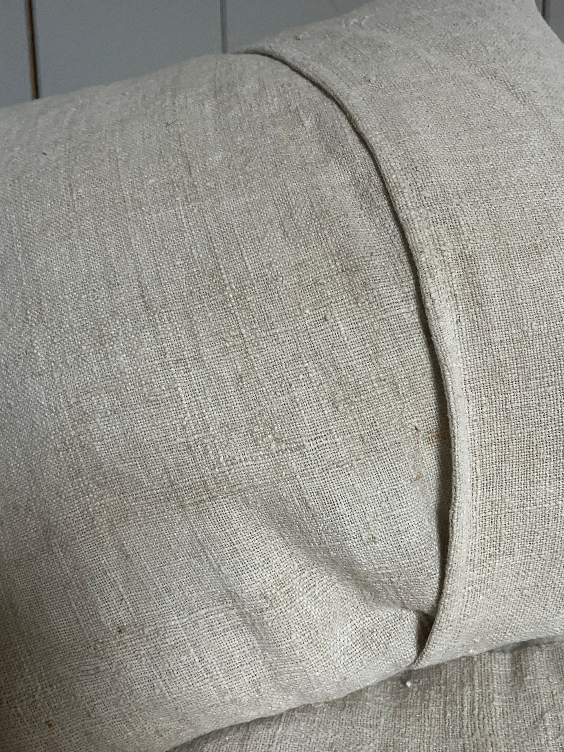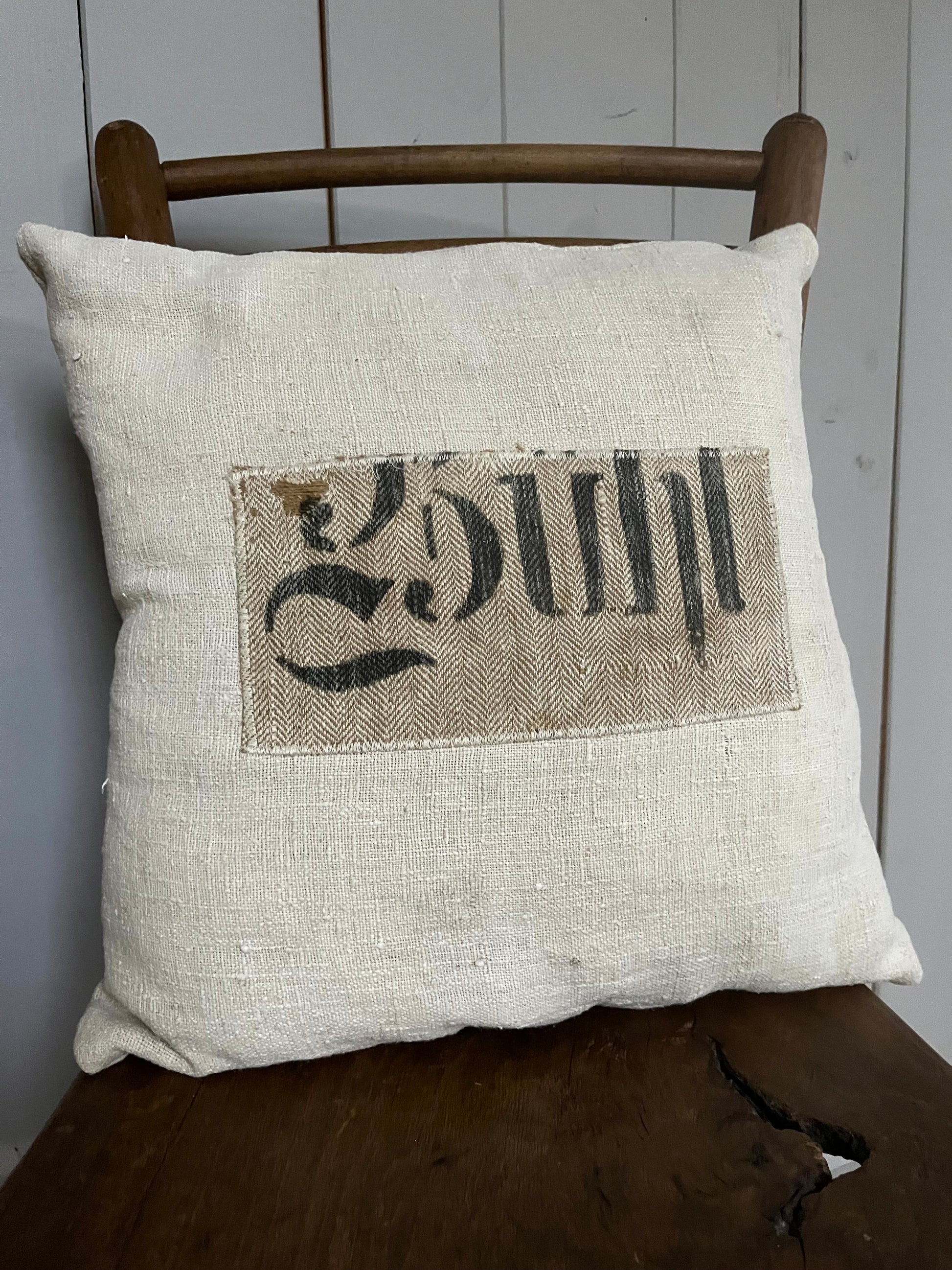 Ein Kissen aus sehr altem, von Hand gewebtem Leinen. Auf der Vorderseite eine Applikation von einem Leinensack. Rückseite Hotelverschluss. Maße: 40 × 40 cm. Das Leinen wurde gewaschen. Bitte immer bedenken: es kann kleine Zeitzeichen geben, das macht den Charme der alten Stücke aus. Es ist keine Fabrik-Neuware. Bezug kommt ohne Füllung.