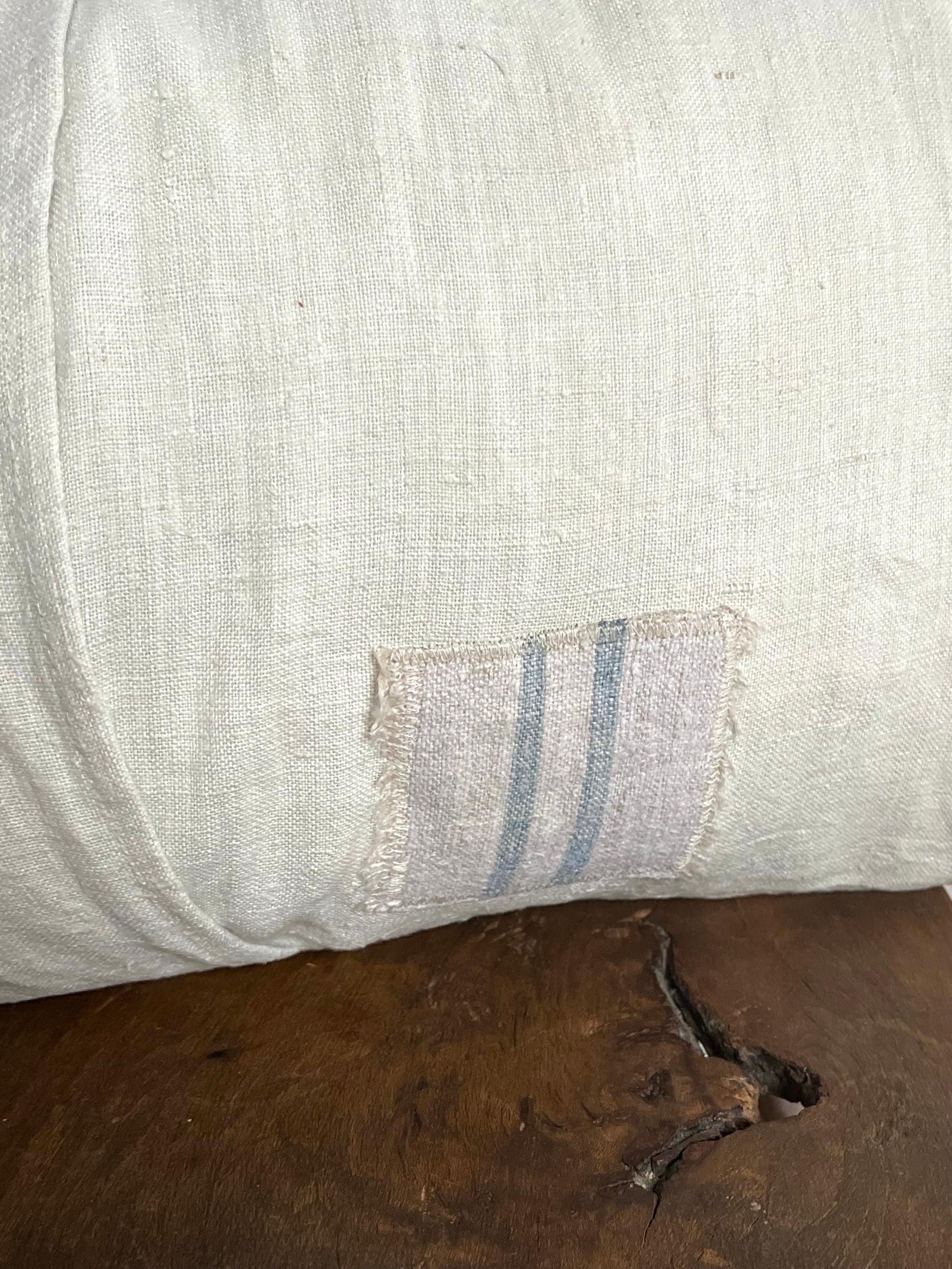 Großes Kissen aus sehr altem, von Hand gewebtem Leinen. Auf der Vorderseite eine Applikation von einem Leinensack. Rückseite kleiner Flicken auf antikem Leinen. Hier mit Hotelverschluss. Maße: 60 × 40 cm. Bezug kommt ohne Füllung.