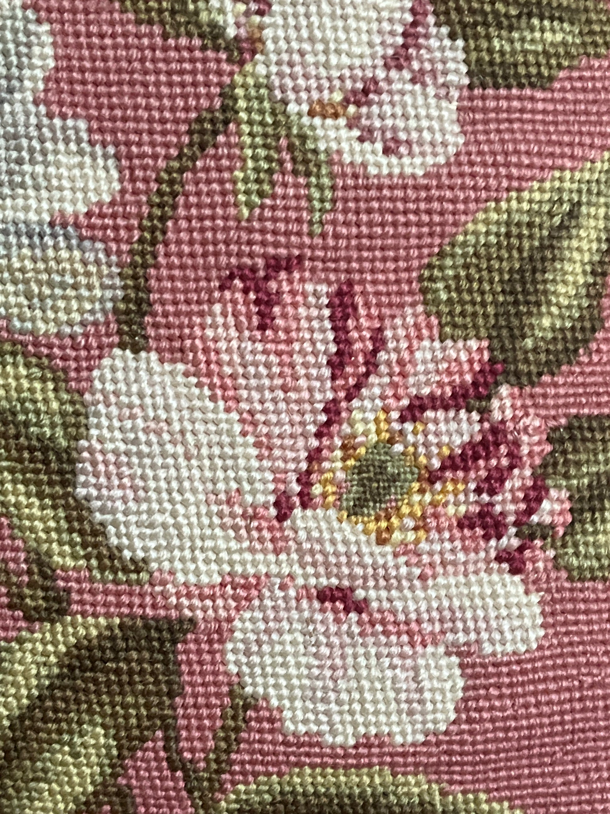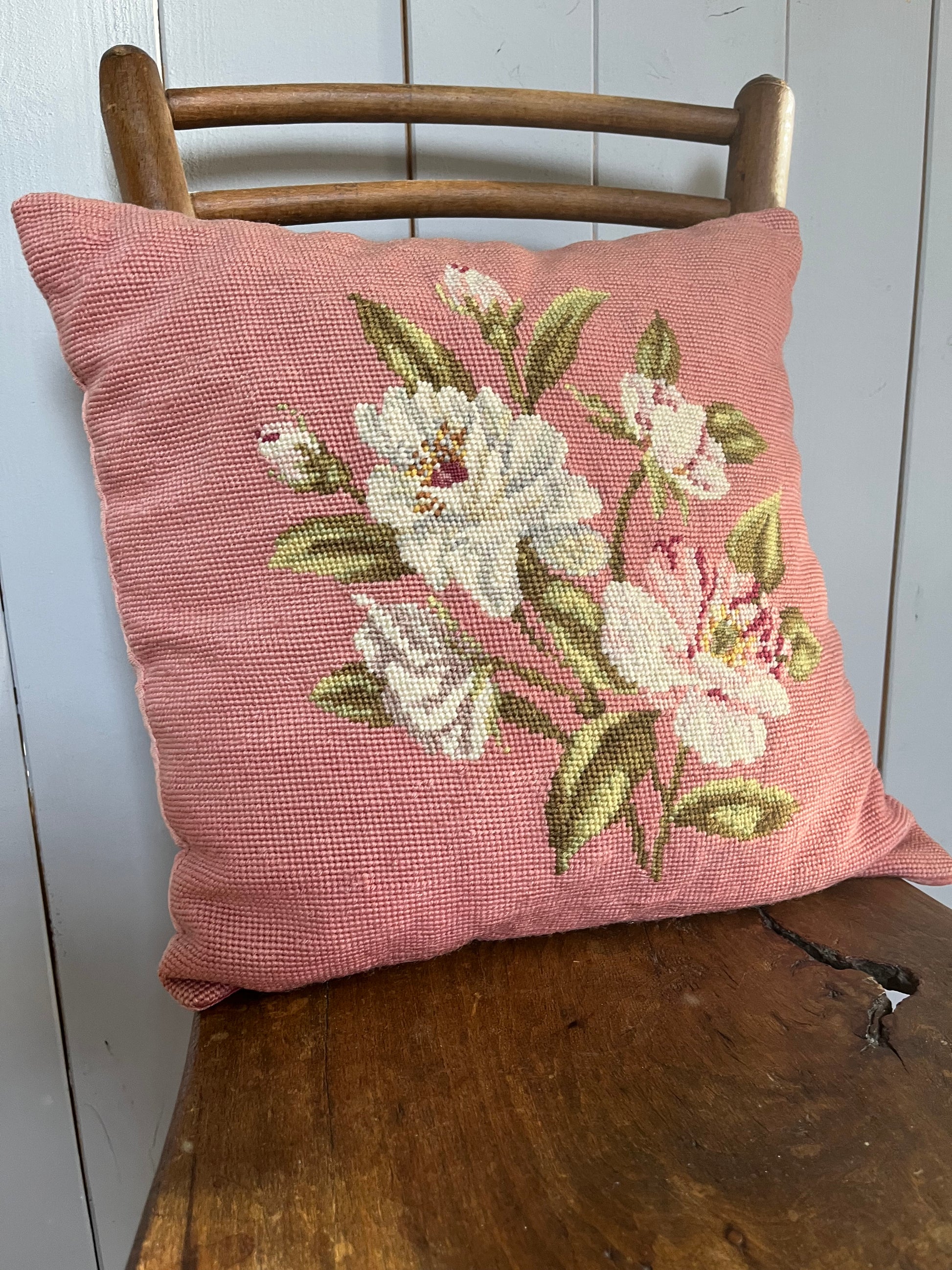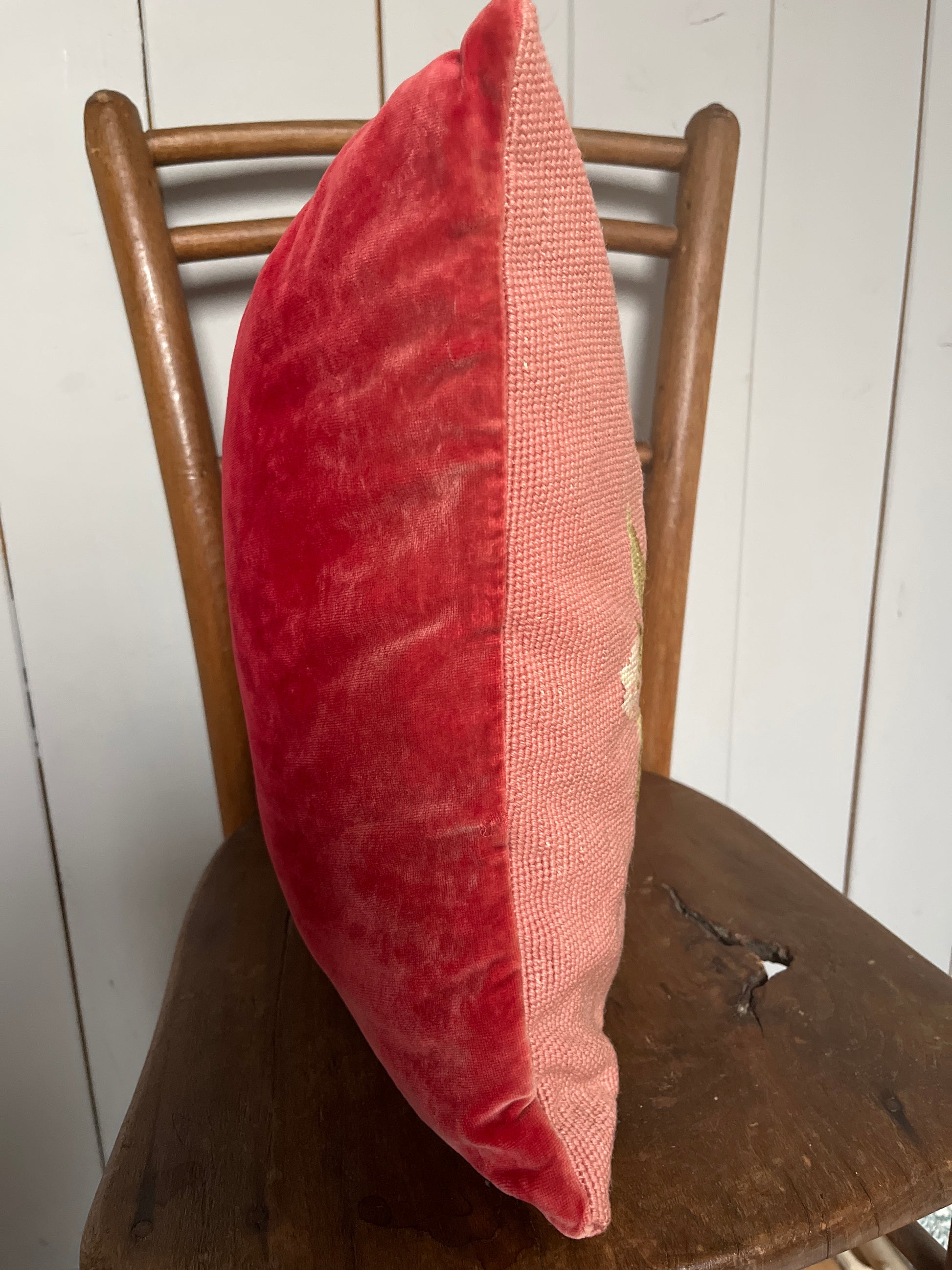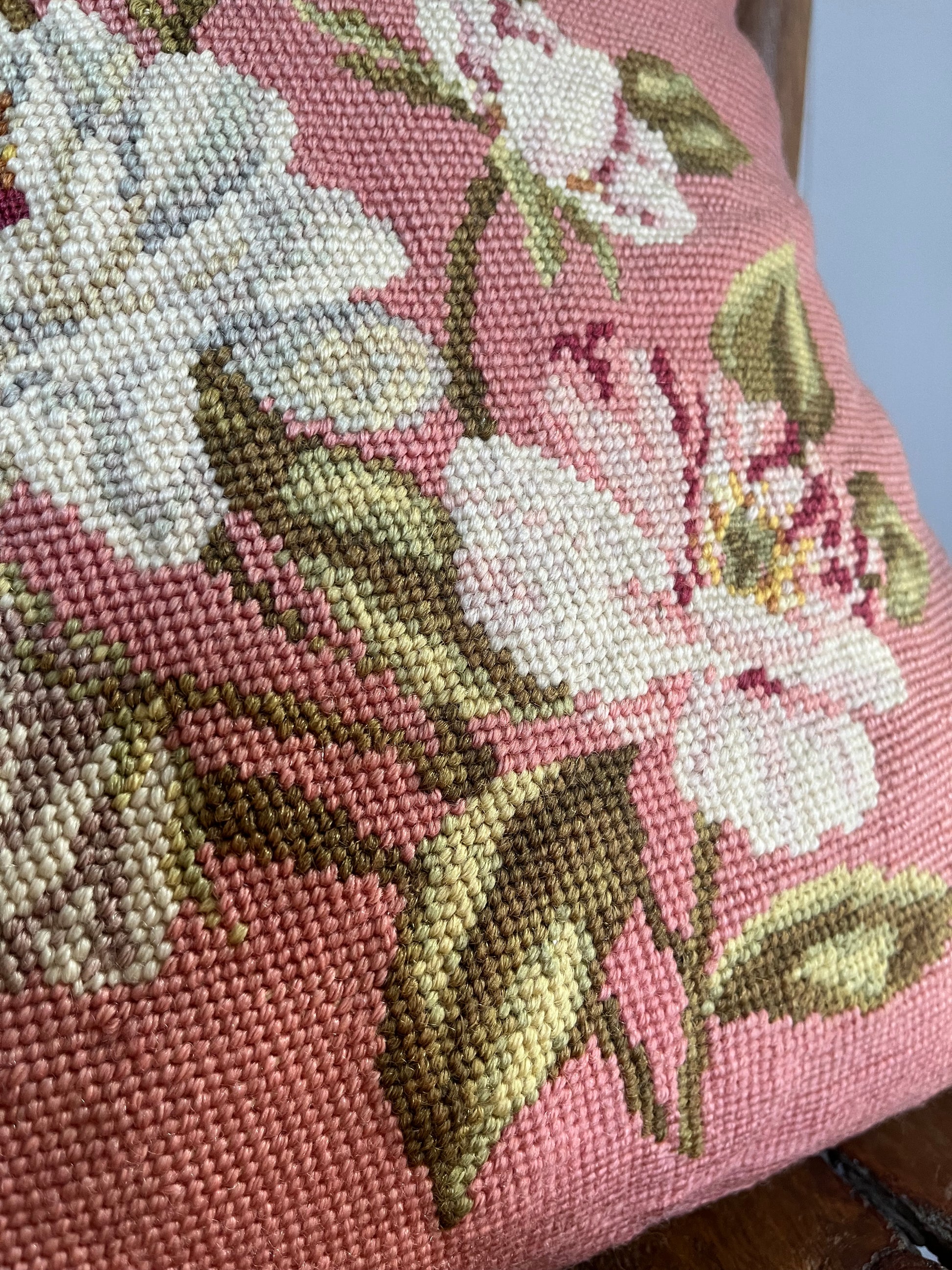 Hier steckt viel Arbeit drin. Dieses schöne Kissen stammt aus Frankreich, es ist von Hand gefertigt. Die Vorderseite zeigt eine akkurate und intakte Stick-Arbeit, Petitpoint. Es sind große Blüten auf rosefarbenem Hintergrund. Die Rückseite ist hochwertiger Samt in dunkelrot. Das Kissen wurde zusammengenäht von Hand und ist geschlossen. Die Füllung ist mir nicht bekannt, es fühlt sich an wie eine Füllung aus Stoffresten. Recht schwer, aber weich. Man könnte das Kissen auftrennen, einen Reißverschluss einnähen und mit einer herkömmlichen Füllung versehen. Maße etwa 40 × 40 cm. Ein prächtiges Stück Handarbeit.