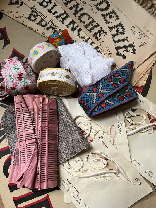 Sammlung Bänder, Stickhefte von 1923, Nadeln und Plumetis Monogrammei