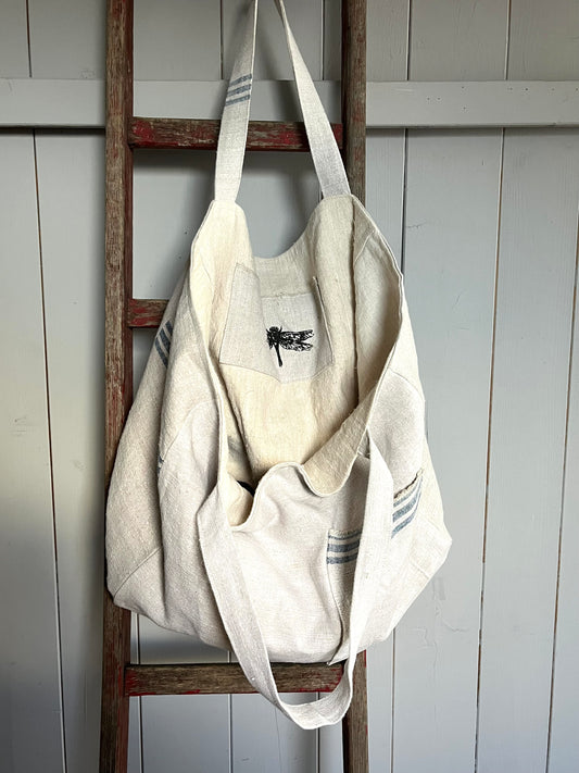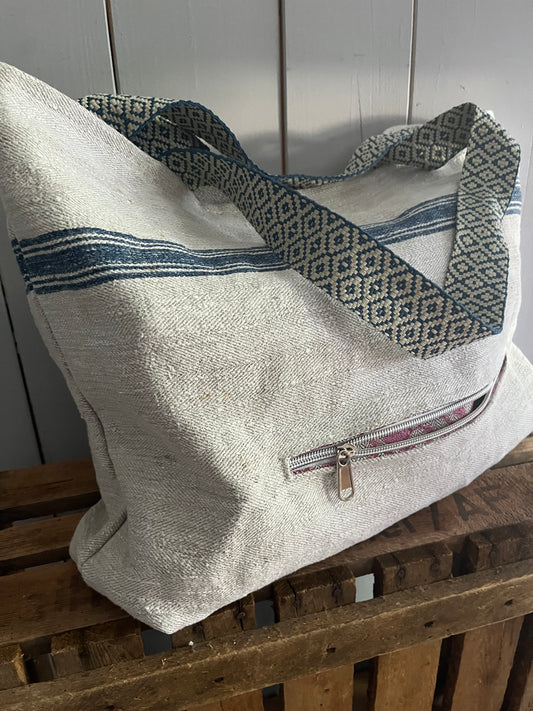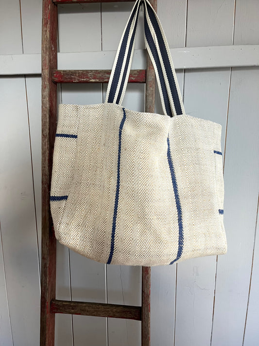 Blau gestreift: große Tasche aus kräftigem altem Leinensack