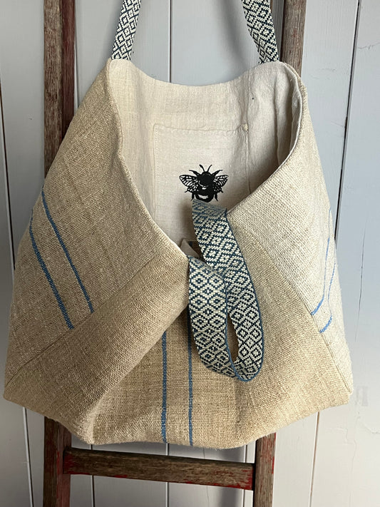 Blue stripes: große Tasche aus kräftigem altem Leinensack