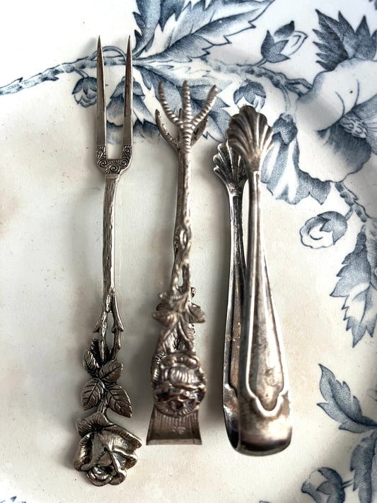 2 alte Zuckerzangen und 1 Gabel versilbert