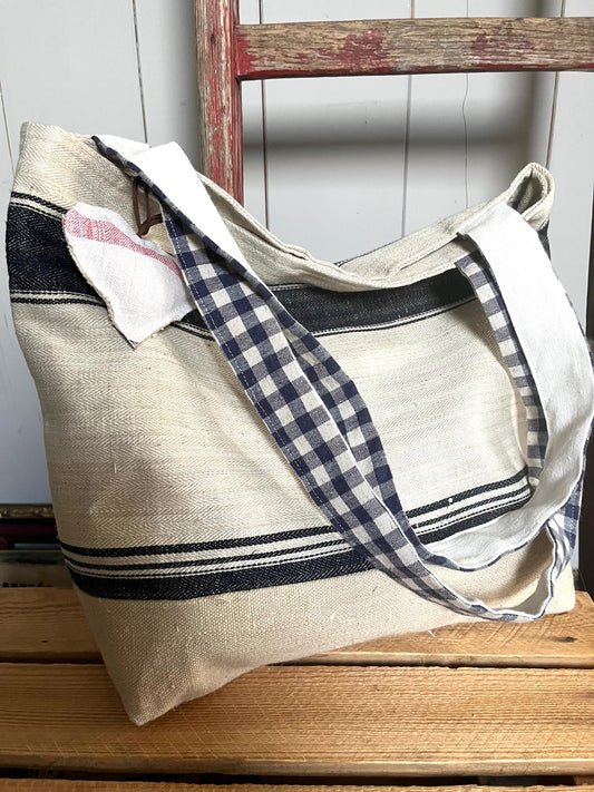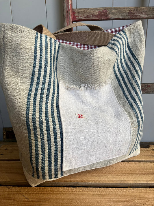 Blau gestreift: große Tasche aus kräftigem altem Leinensack