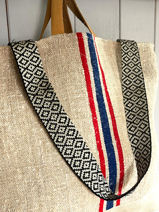 Rot/Blau gestreift: Große Tasche aus altem Hanfstoff
