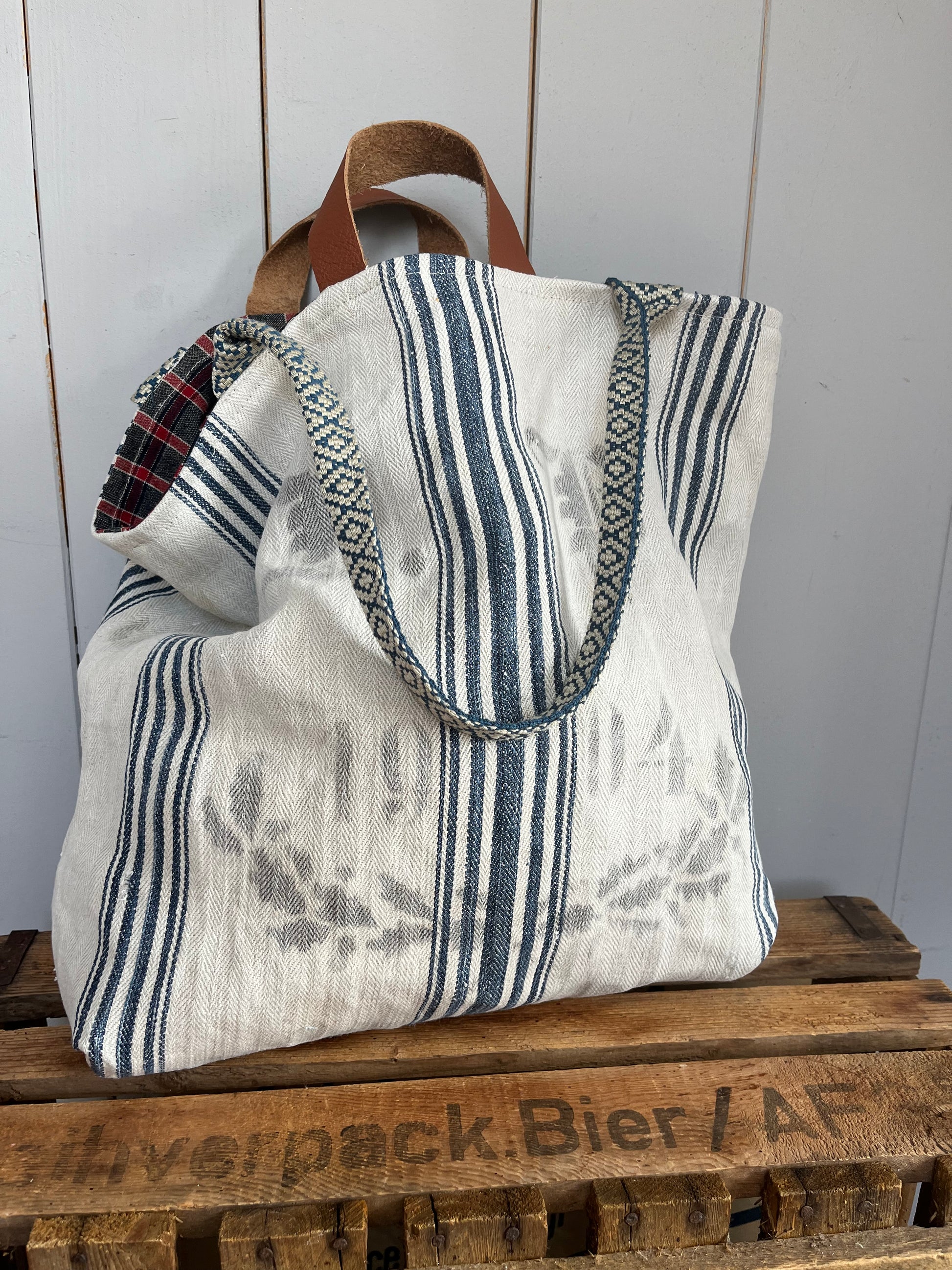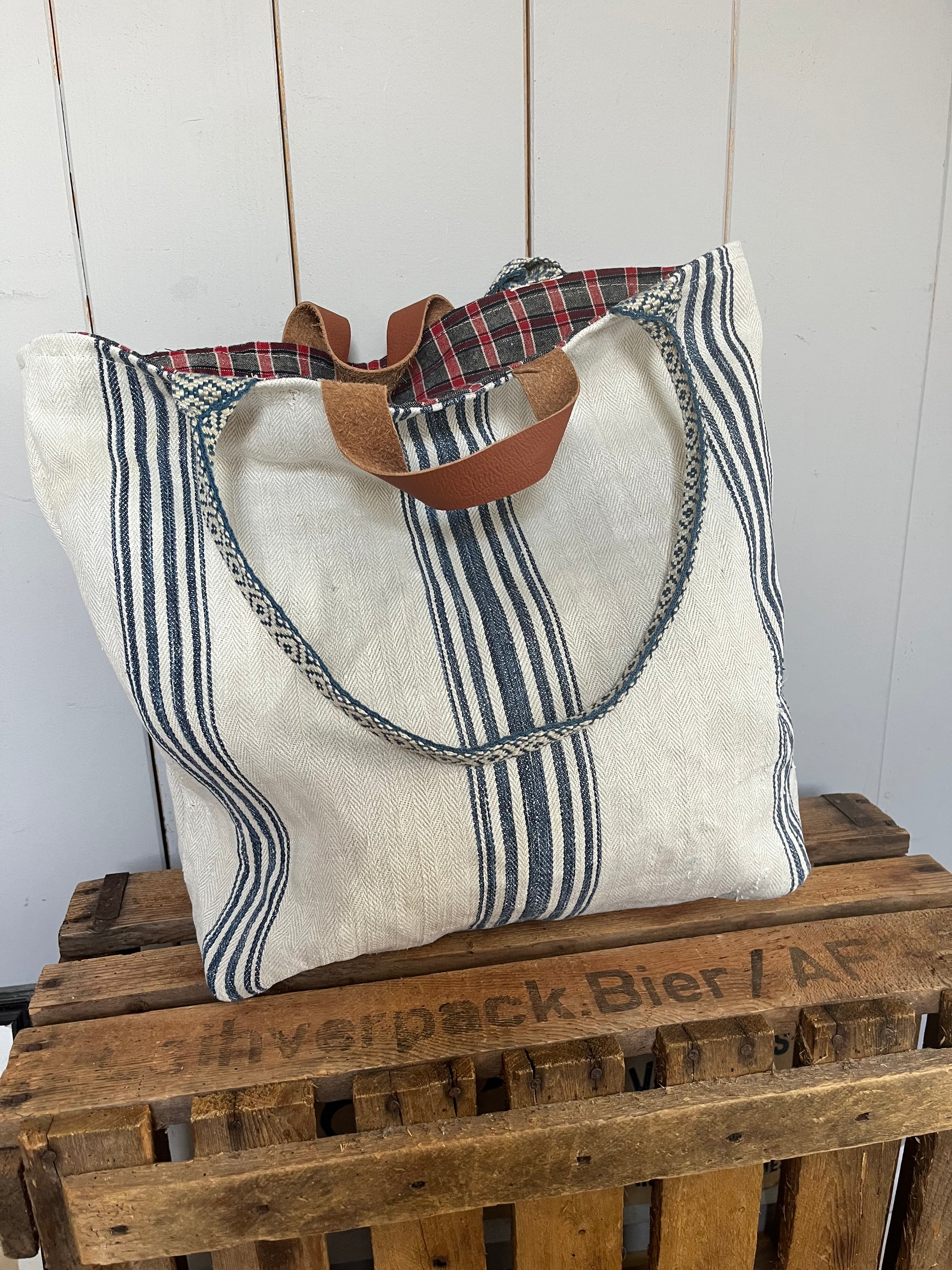 Große Tasche aus einem alten, kräftigen Kornsack aus dem Jahr 1904. 120 Jahre altes, kräftiges Leinen! Der Sack ist gut erhalten, wurde gewaschen. Und hat eine wunderbare Aufschrift auf der Vorderseite. Auf der Rückseite blaue Streifen. Innen gefüttert mit altem Karoleinen, handgewebt aus Bayern. Es gibt lange Schulterhenkel aus Canvas und Ledergriffe. Aufgesetzte Innentasche. Jede Tasche ist handgefertigt und ein Unikat. Das Leinen wurde gewaschen, ist sauber. Wenn man in ihr nicht gerade Ziegelsteine transportiert, macht die Tasche jedes Shopping tapfer mit! Maße: Breite etwa 45 cm. Höhe ohne Henkel ca. 42 cm.