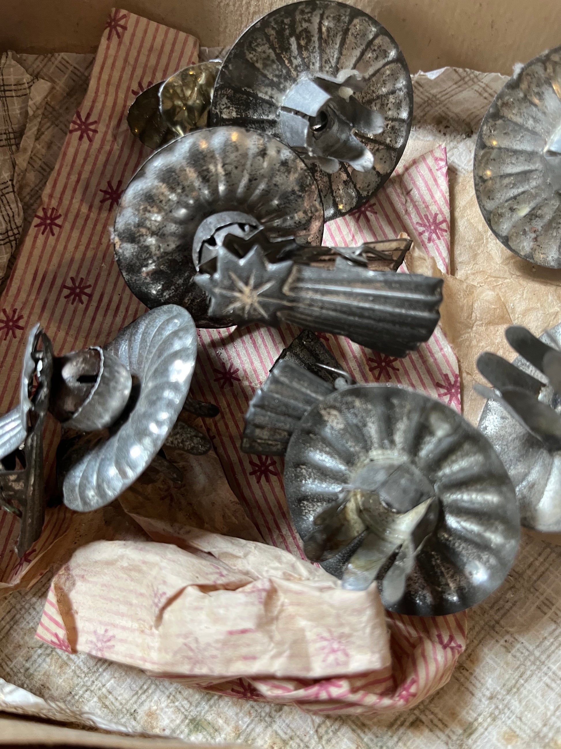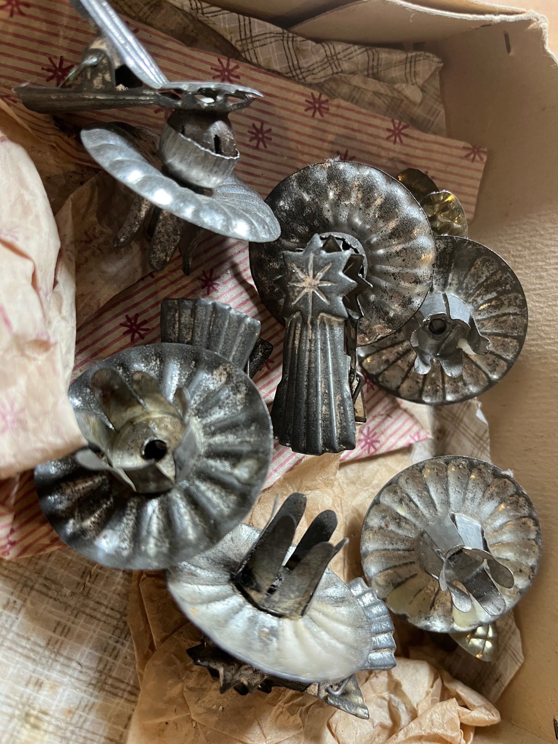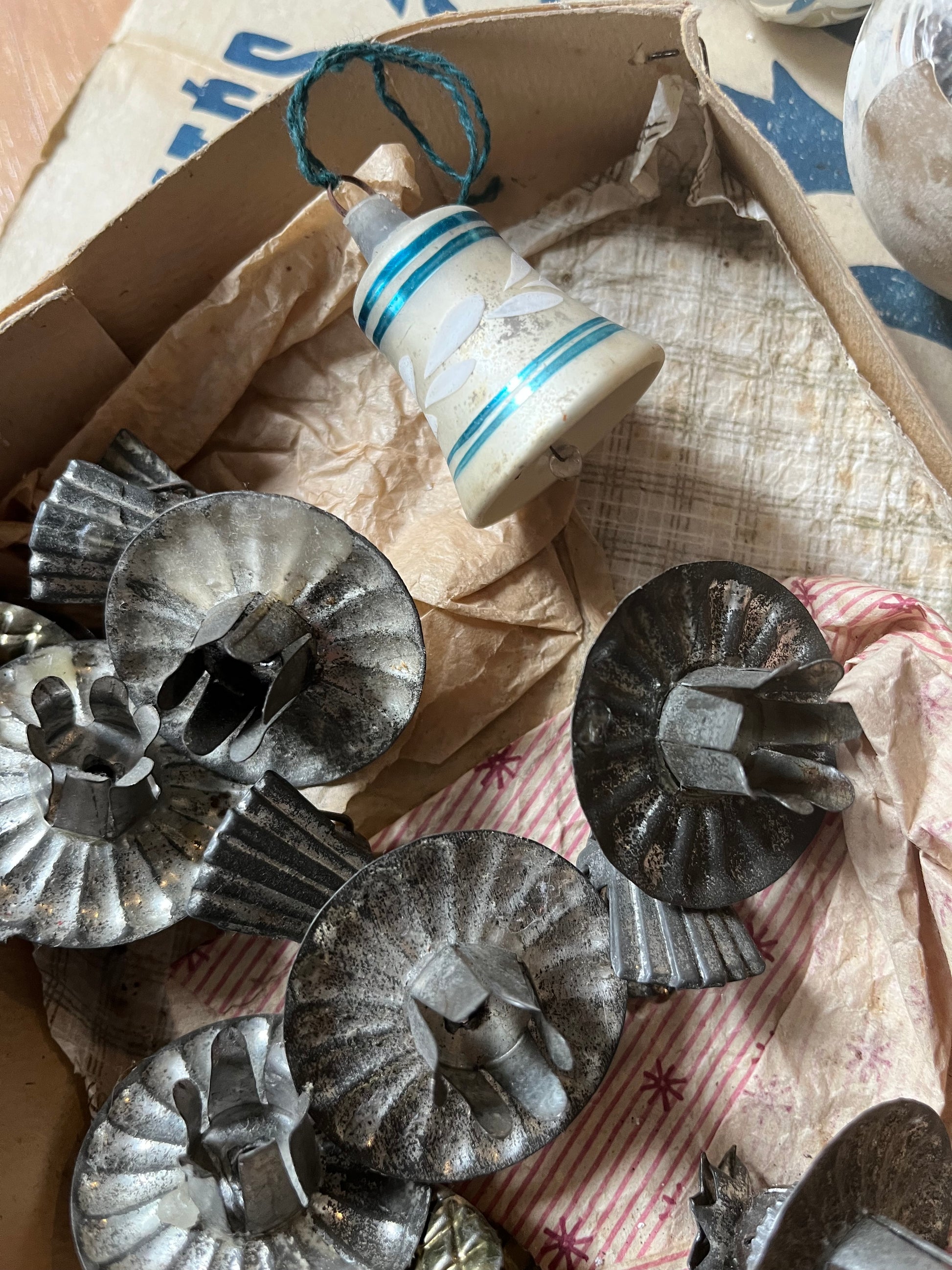 Ist schon wieder soweit? Für Weihnachtsschmuck ist doch eigentlich immer Zeit. In diesem Karton liegt alter Baumschmuck: Weihnachtskugeln, Zapfen und Glocke . Sie sind intakt, haben ein bisschen Patina. Und freuen sich auf den Tannenbaum. Da sie nicht schlecht werden, kann man sie auch jetzt schon einlagern. Dazu kommen 6 original alte Kerzenhalter mit wunderschönen Greifern.