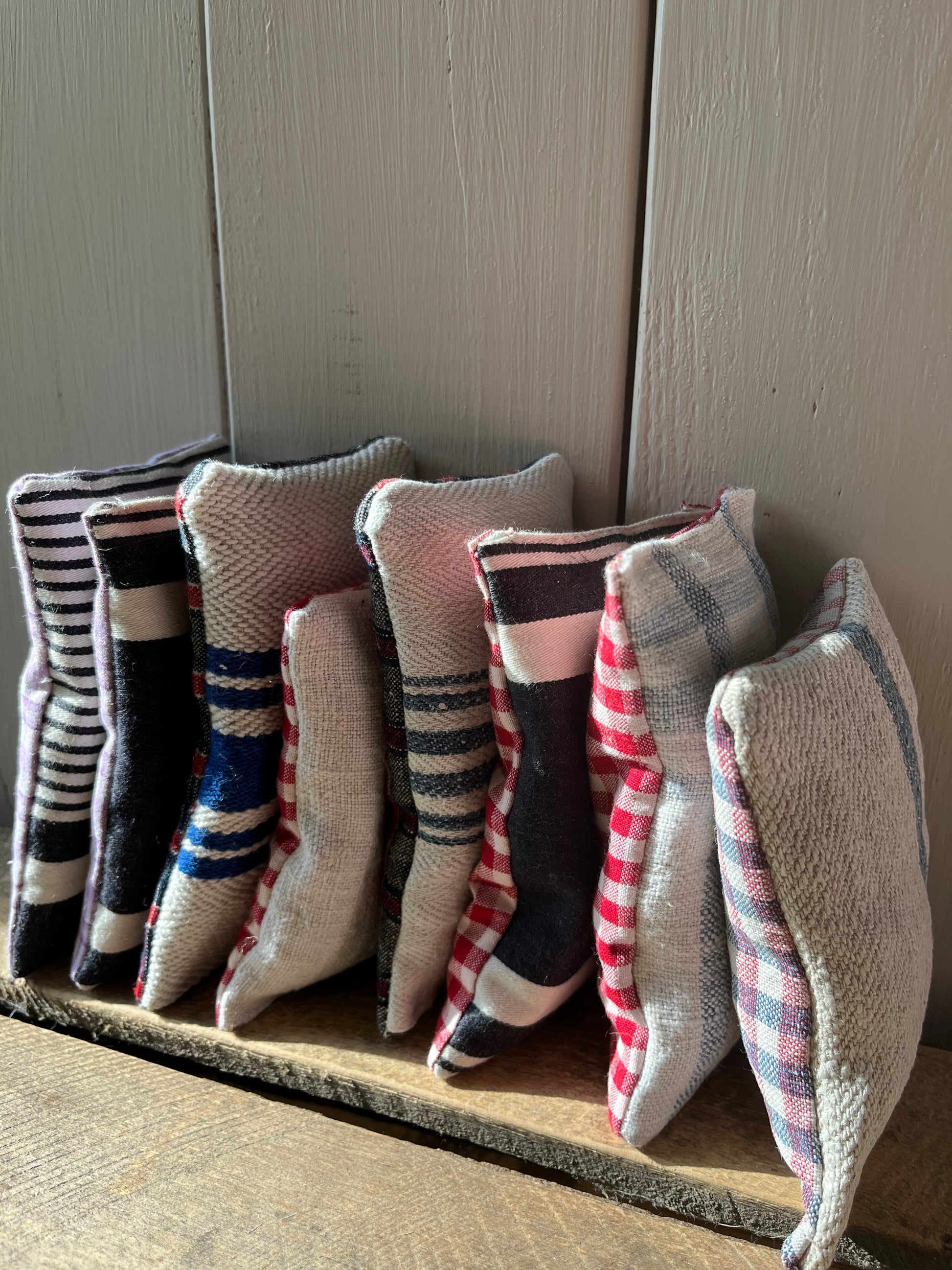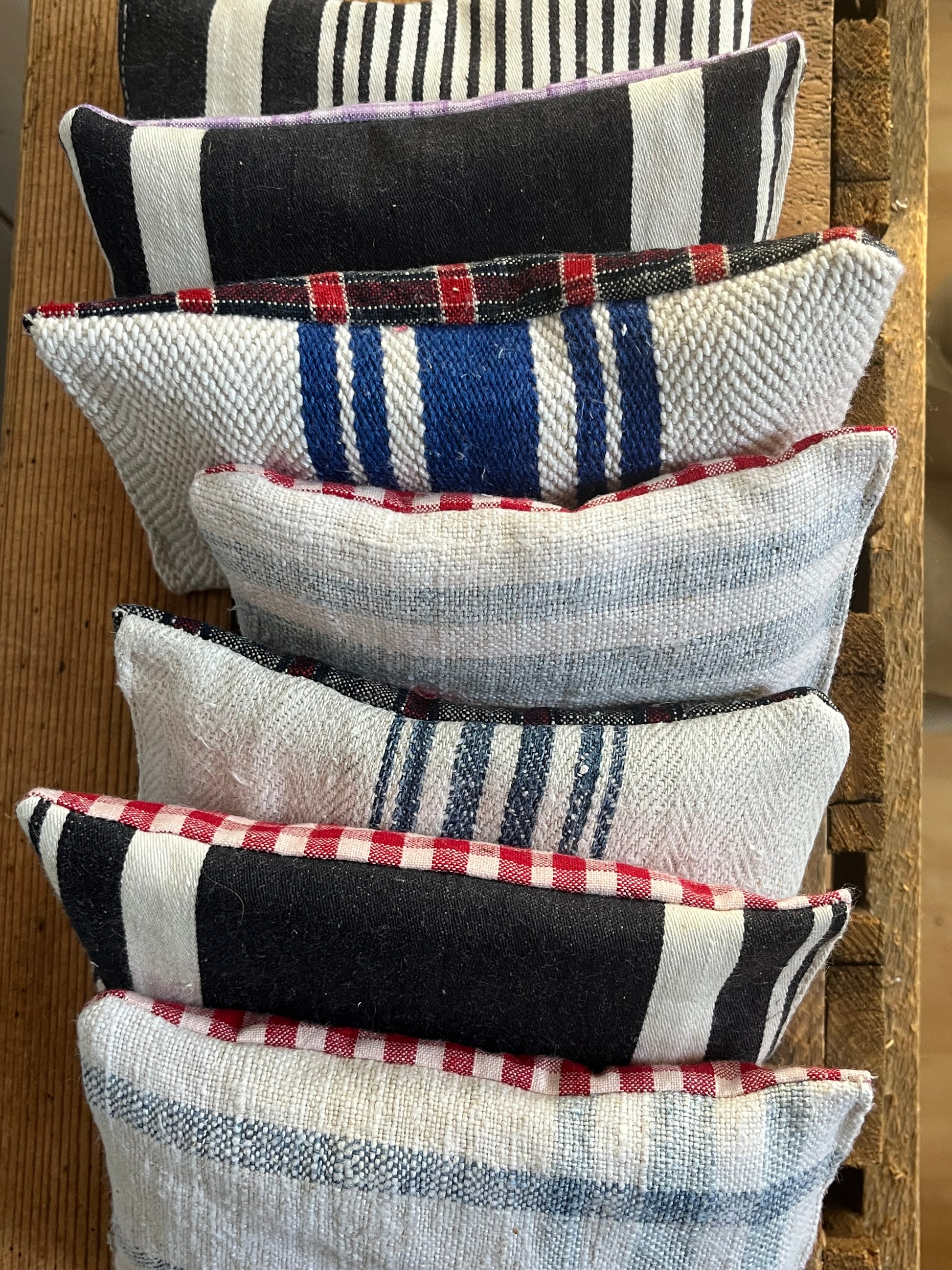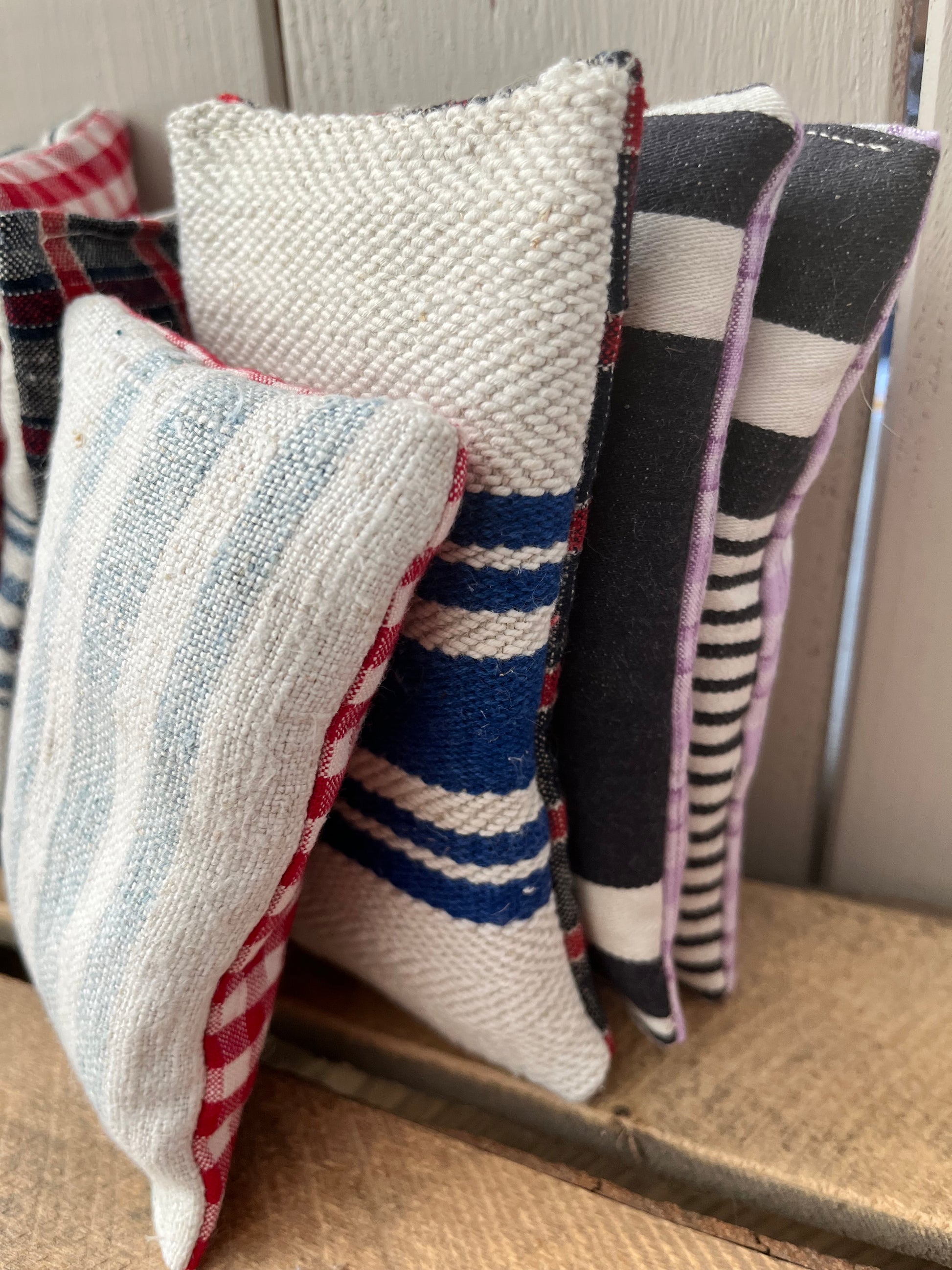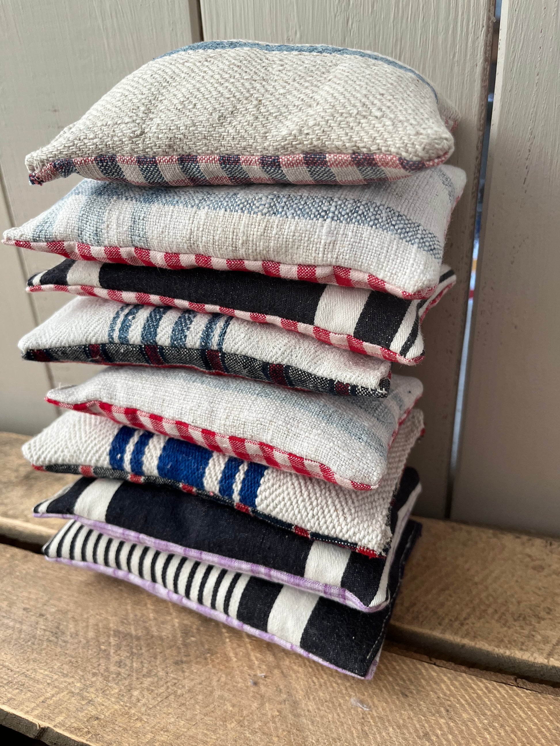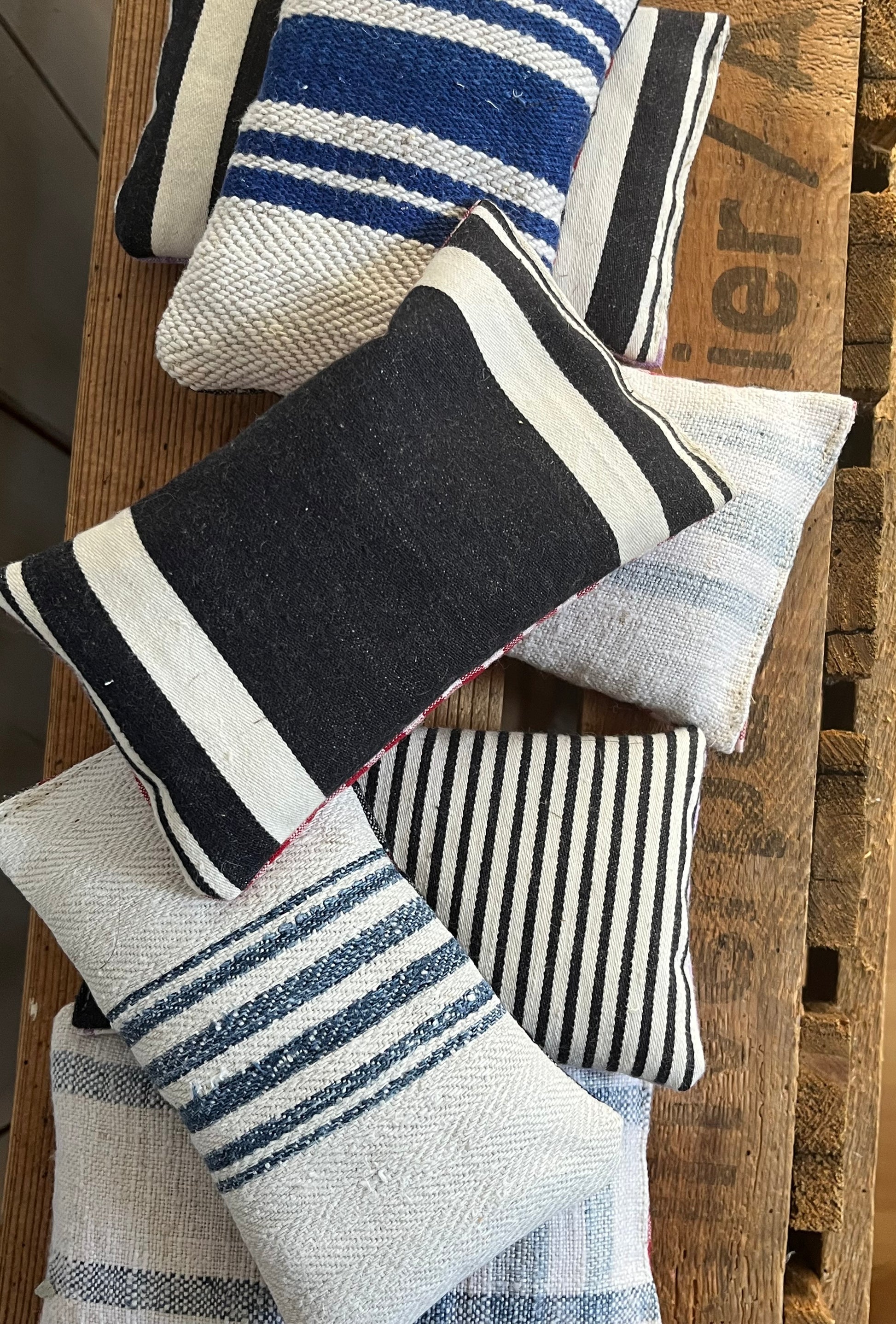 Dreimal guter Duft! In diesen Säckchen aus altem Leinen mit blauen Streifen steckt Lavendel. Jedes Säckchen ist prall gefüllt. Das Leinen ist immer ein bisschen unterschiedlich, es ist teilweise über 100 Jahre alt. Und weil nichts verschenkt werden soll, wist hier im Atelier mit jedem Stückchen Stoff genäht. So sind die Duft-Säckchen entstanden. Sie sind sauber, von Hand genäht und sorgen nicht nur für ein angenehmes Aroma, sie halten Motten und sogar Spinnen und Mücken fern. Neben dem Kopfkissen wirken sie nach einem anstrengenden Tag besänftigend. Der Lavendel stammt aus der Provence.