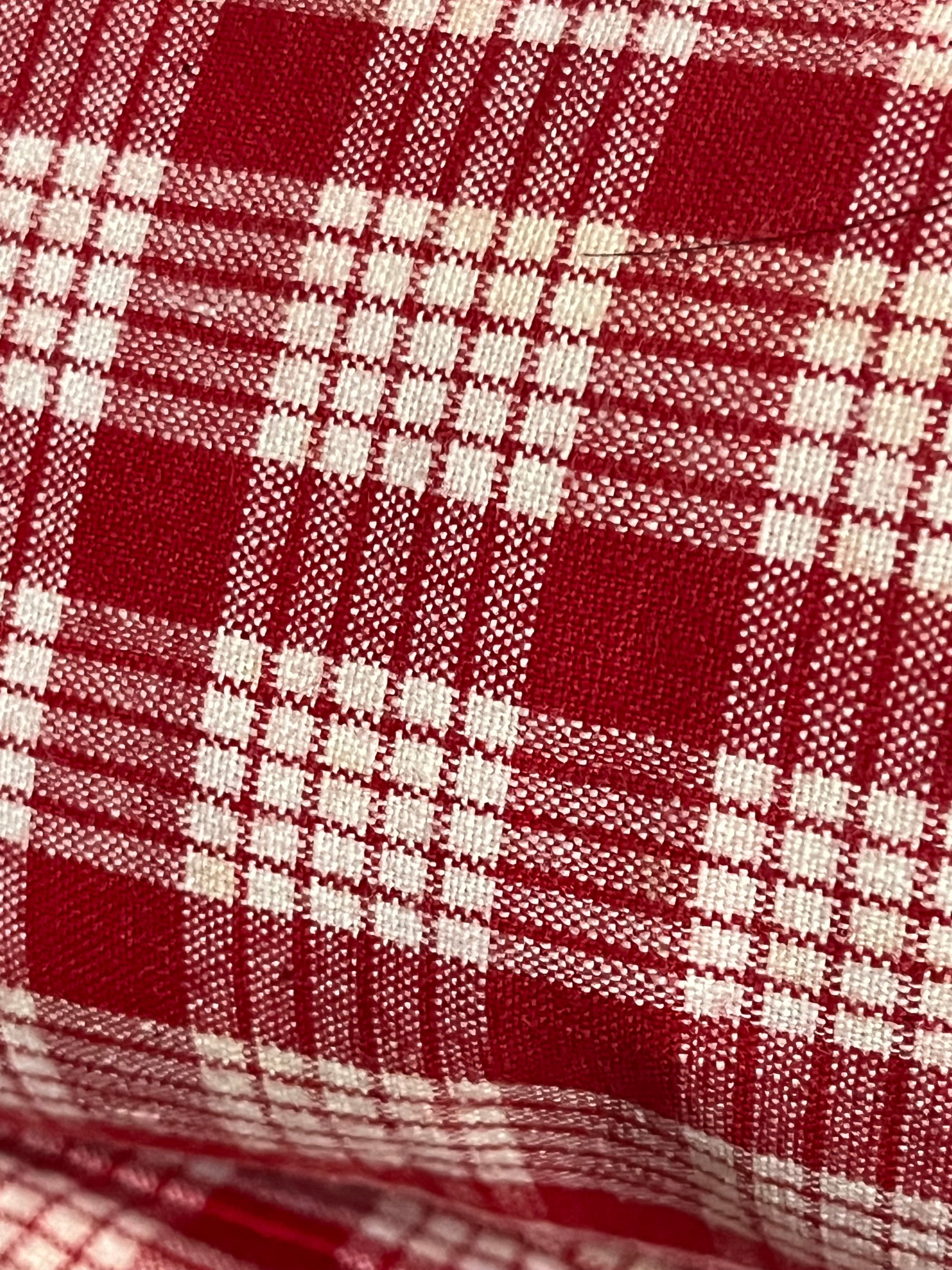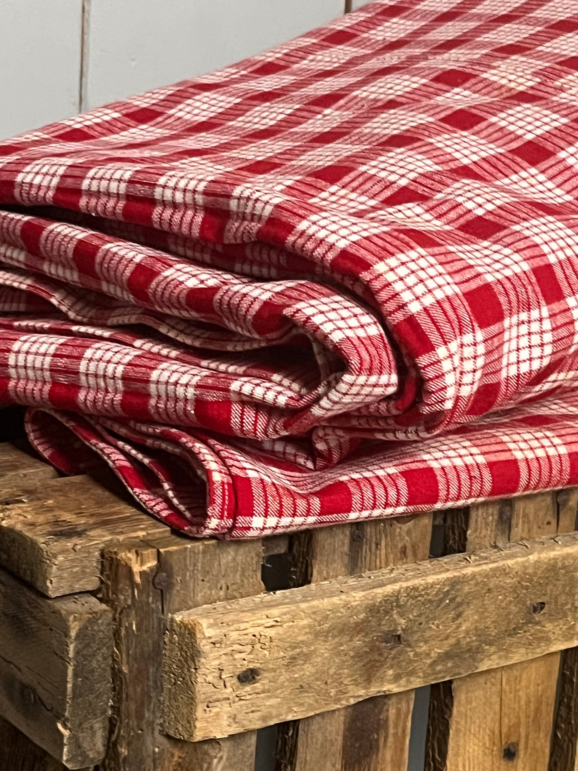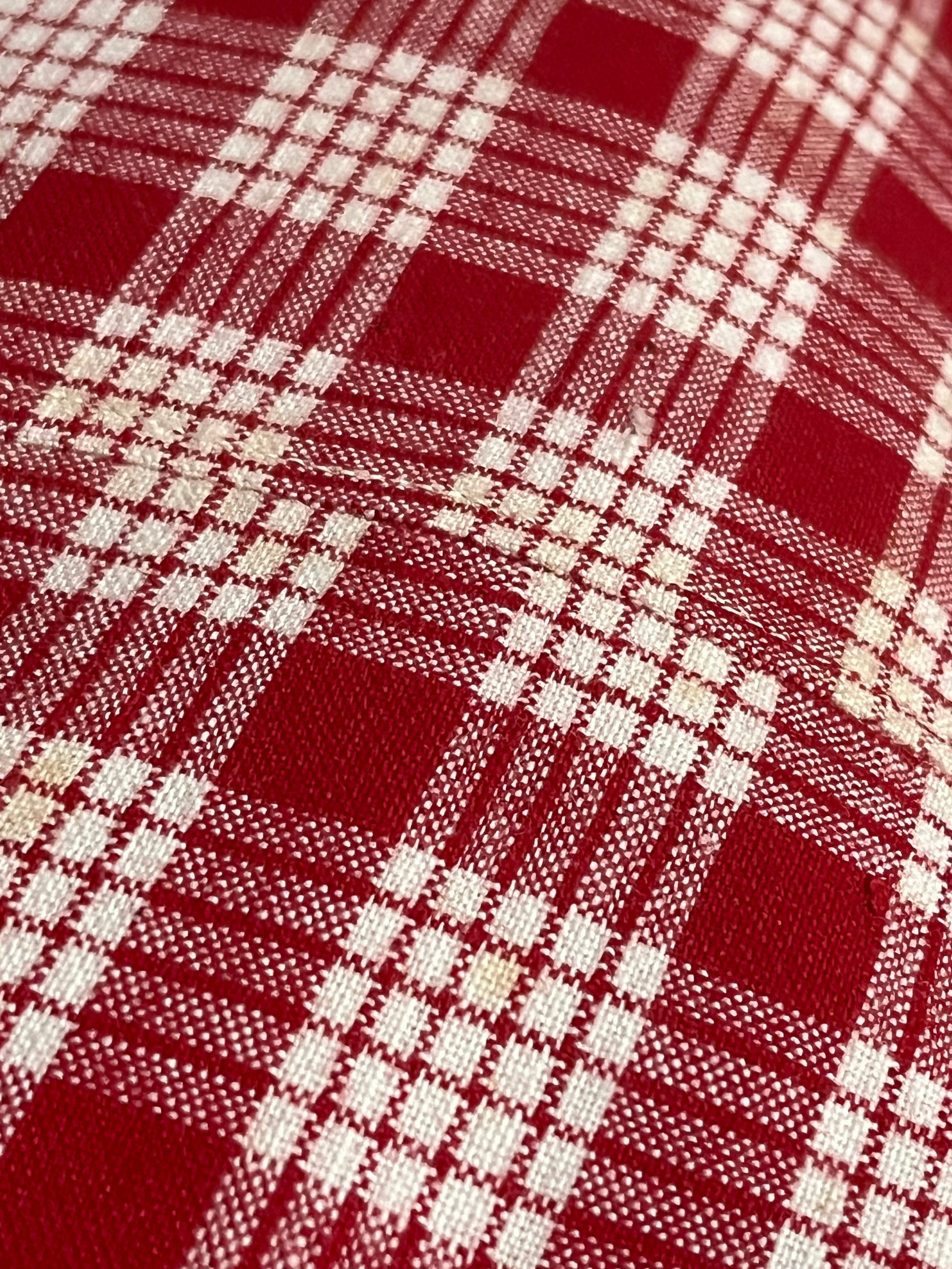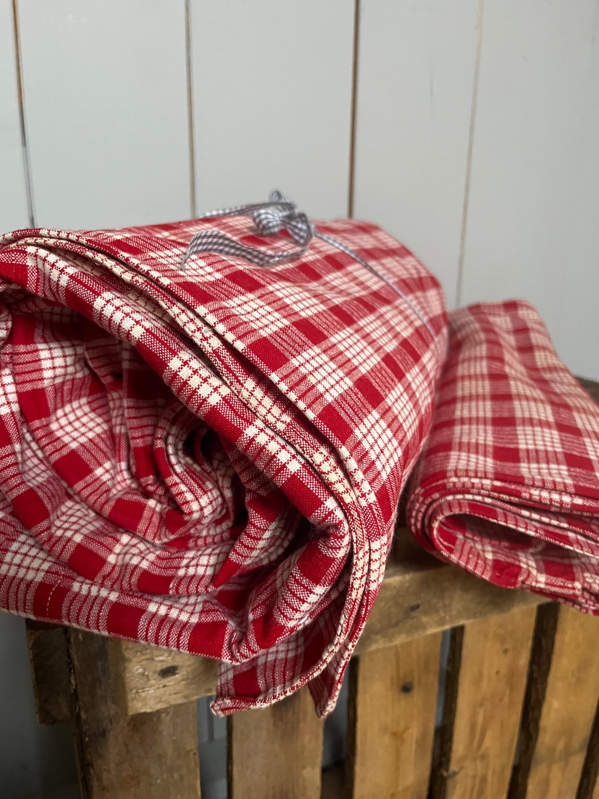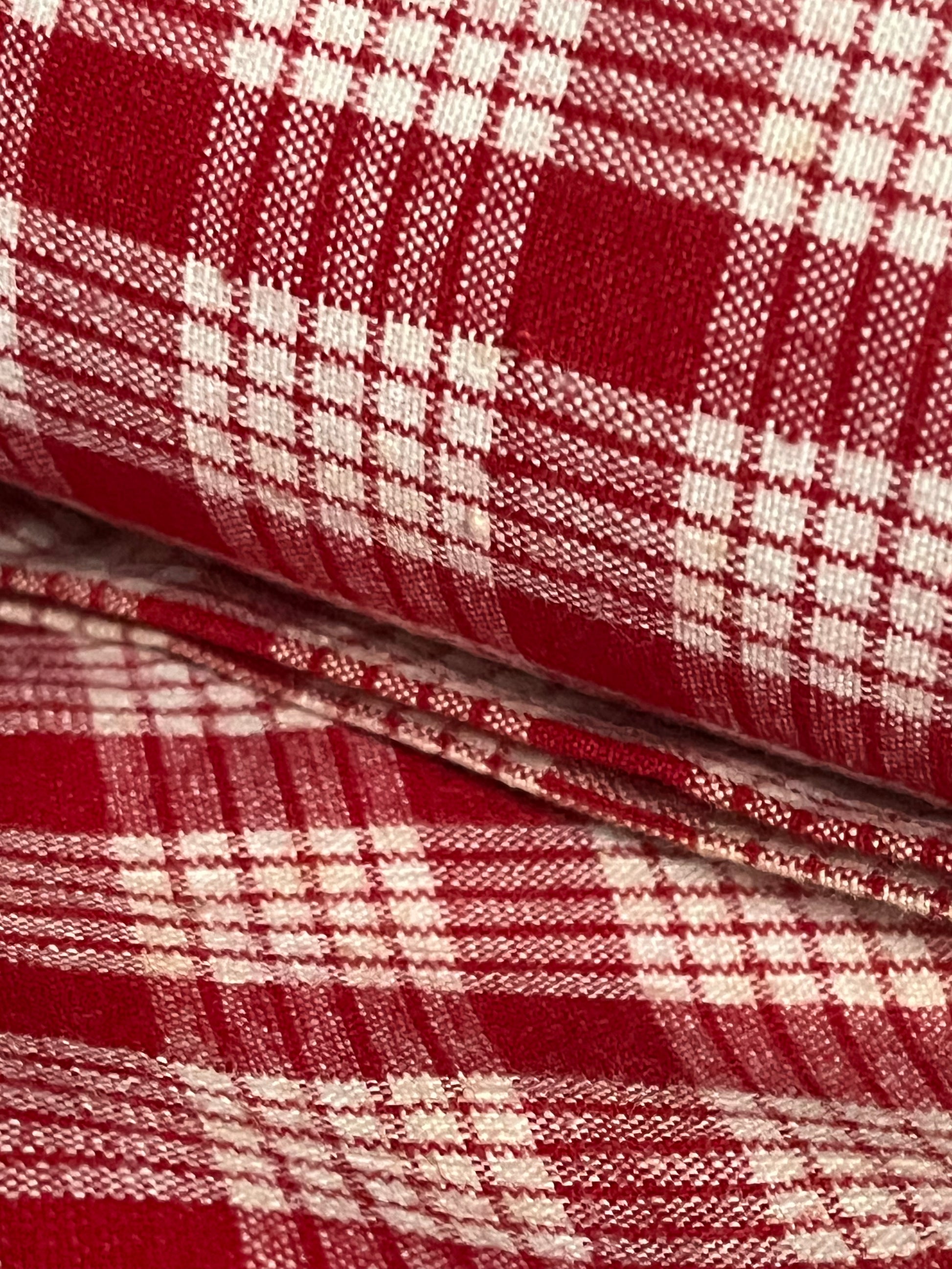Vermutlich nicht benutzt und nur aufbewahrt: ein schwerer Bettbezug mit passendem Kissenbezug aus Bauernleinen. Rot/Weiß kariert. Die alten Bezüge haben meist andere Maße als unsere heutigen Bettdecken. Dieses Set ist groß. In das Kissen passt eine 80 x 80 cm Füllung. Und der Deckenbezug entspricht ungefähr dem heutigen Maß für Bettdecken. Er wurde wie früher oft üblich, aus zwei Bahnen zusammengesetzt. Es ist jede Menge hochwertiger Stoff! Kommt im Originalzustand. Gut erhalten, einmal waschen nach der langen Lagerung. Keine Knöpfe.