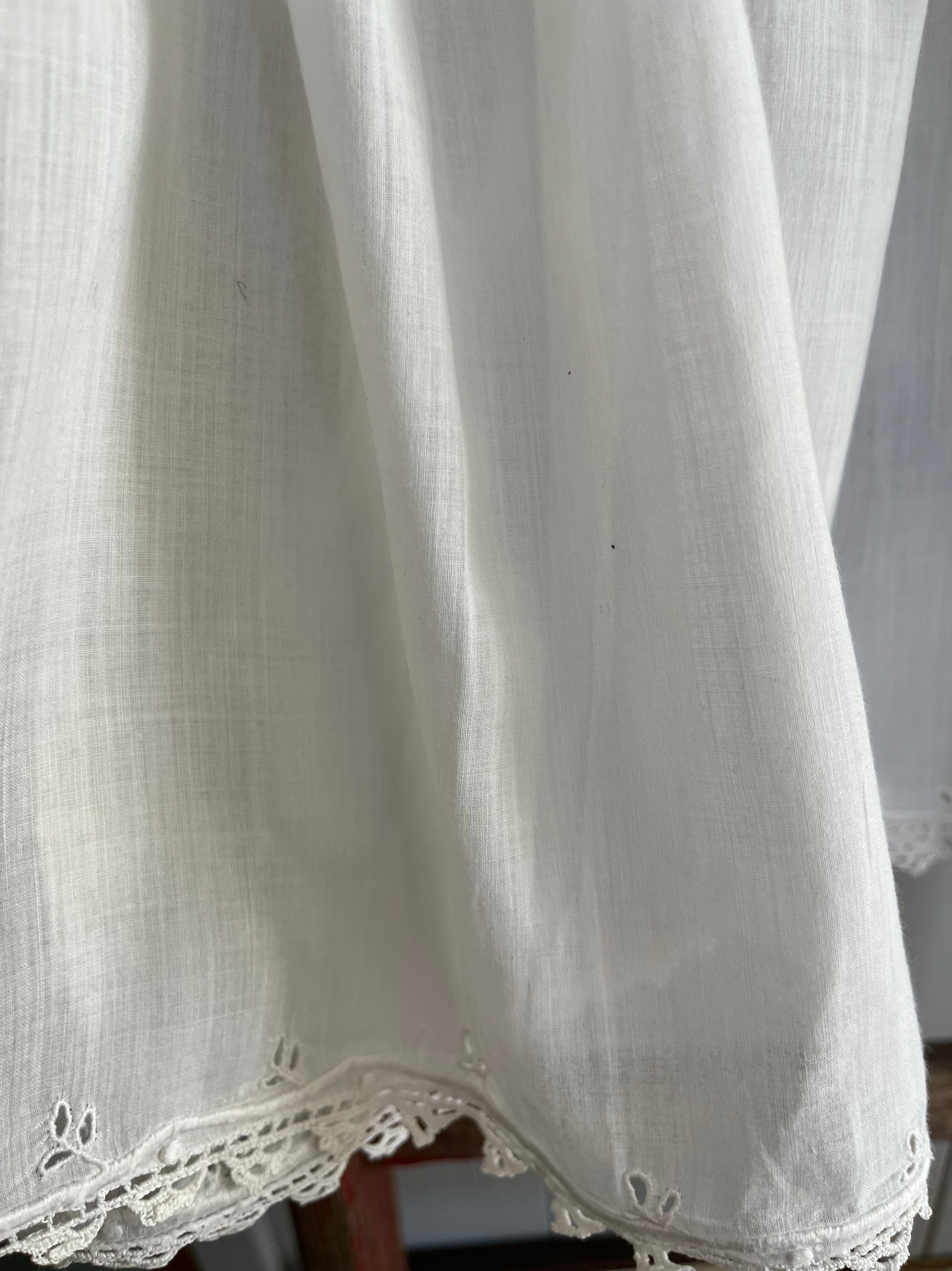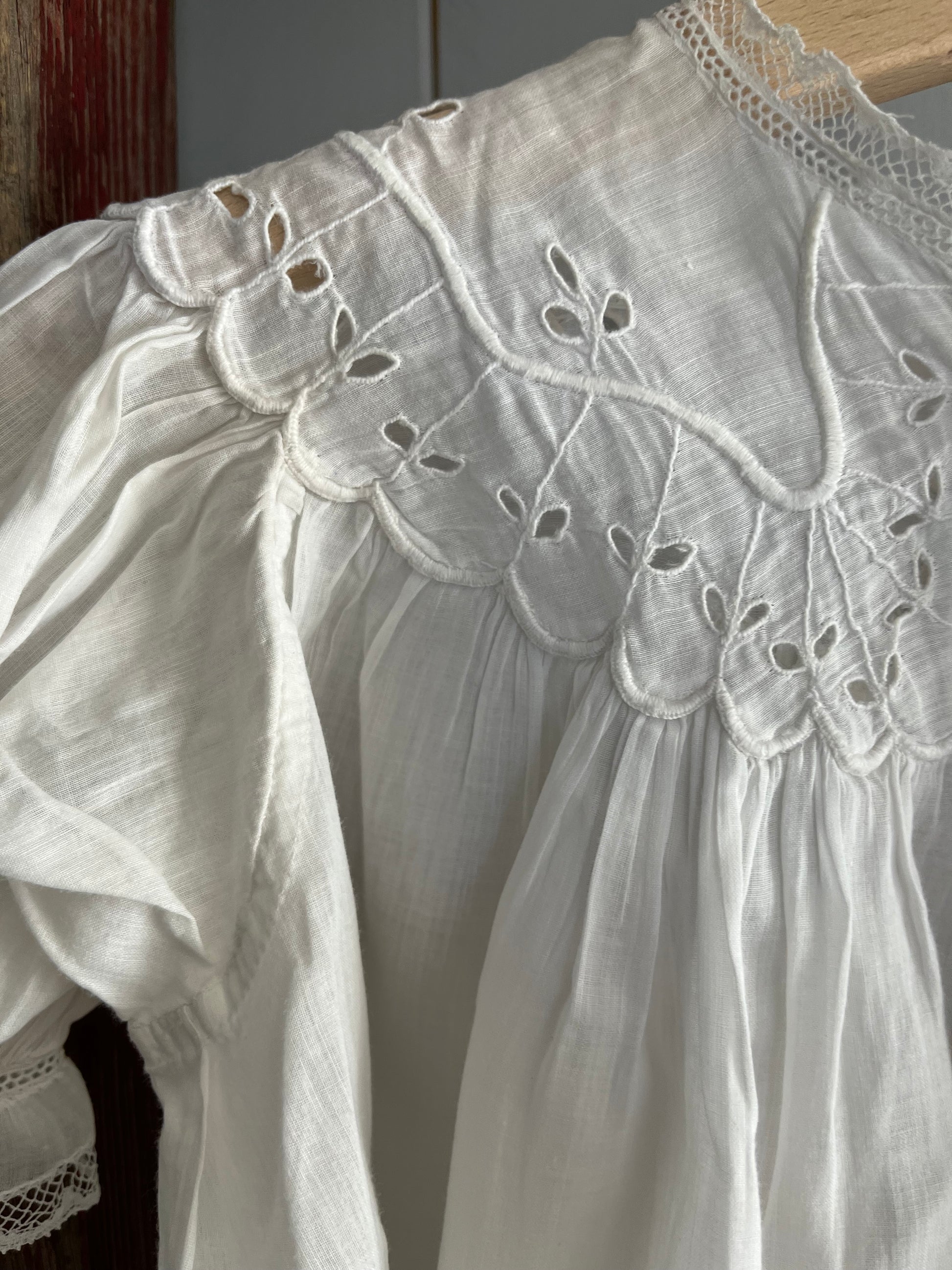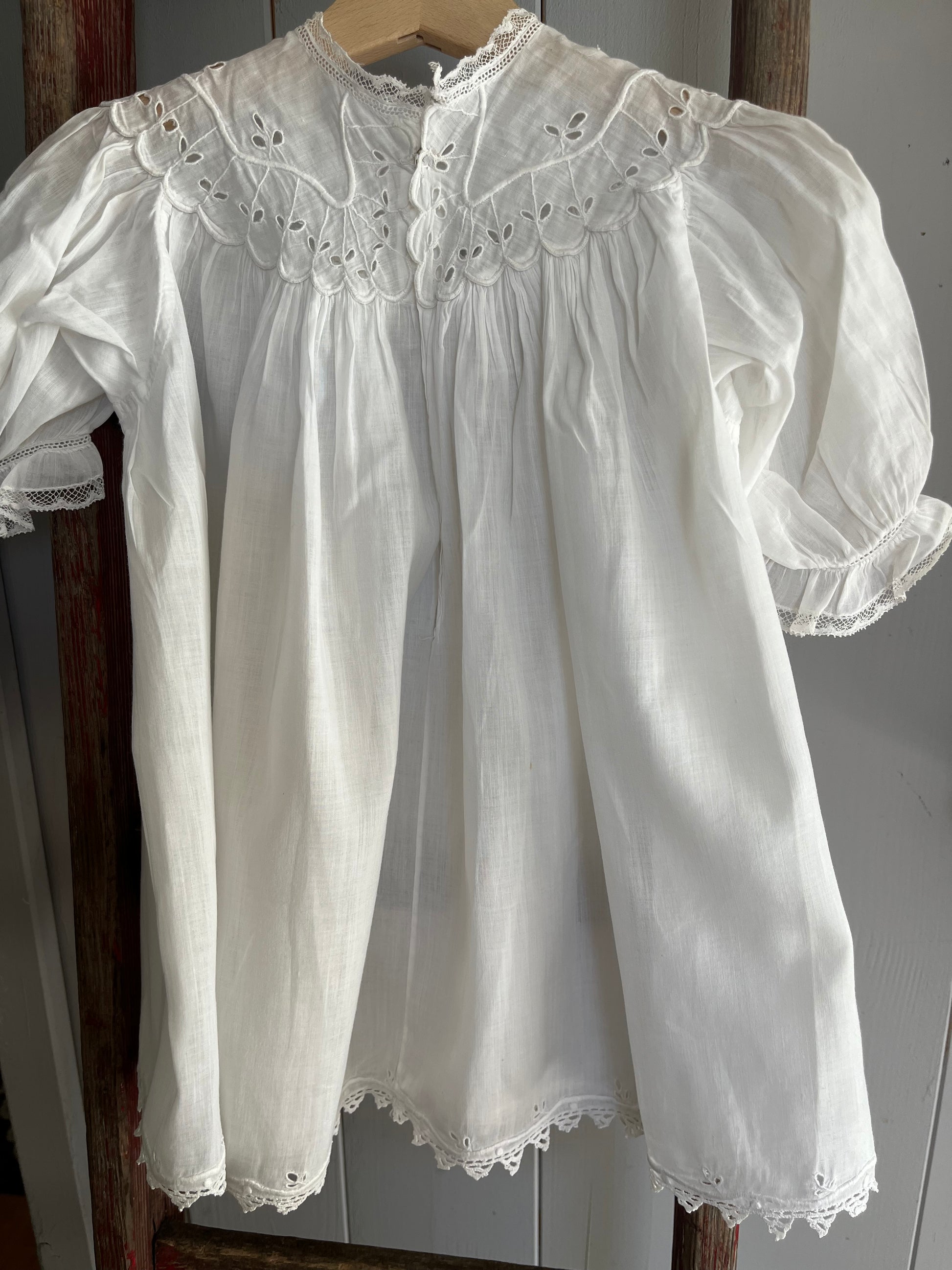 Eine Rarität, etwa 100 Jahre alt: ein sehr feines Kleid für Mädchen mit bester Spitze. Es ist zarter Baumwollvoile, luftig und leicht geschnitten. Kleine Ärmel. Hinten wird das Kleid geknöpft. Dieses wunderschöne, antike Stück ist in einem tollen Zustand. Miniminimale Zeitspuren, die kaum nennenswert sind. Natürlich nicht neu, aber für sein Alter fantastisch erhalten.
