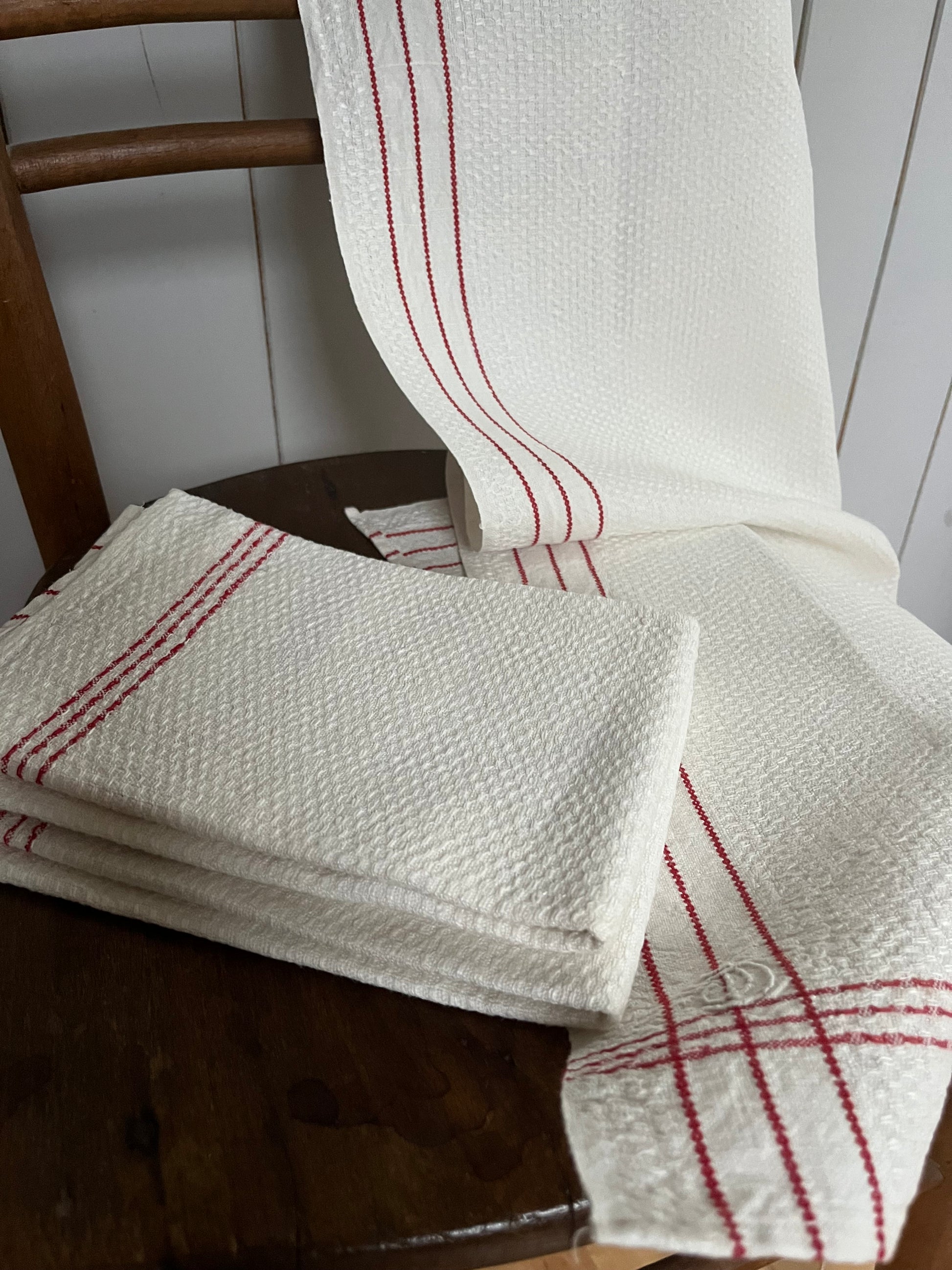 Tuch oder schon Tischläufer? Beides ist möglich. Mit den Maßen 100 x 43 cm kann man dieses Tuch vielfältig einsetzen. Es ist aus kräftigem, wunderschönem alten Bauernleinen genäht. Das Leinen wurde von Hand gewebt. Es hat eine Struktur, ähnlich Waffelmuster, einen Aufhänger und rote Streifen. Es stammt aus den 1940er Jahren und wurde nie benutzt, nur verwahrt. Ist toll erhalten, braucht vor dem ersten Einsatz einen Waschgang. In diesem Tuch ist die Flachfaser wunderbar zu erkennen. Es ist chemisch unbehandelt, reines Leinen, über 100 Jahre alt.