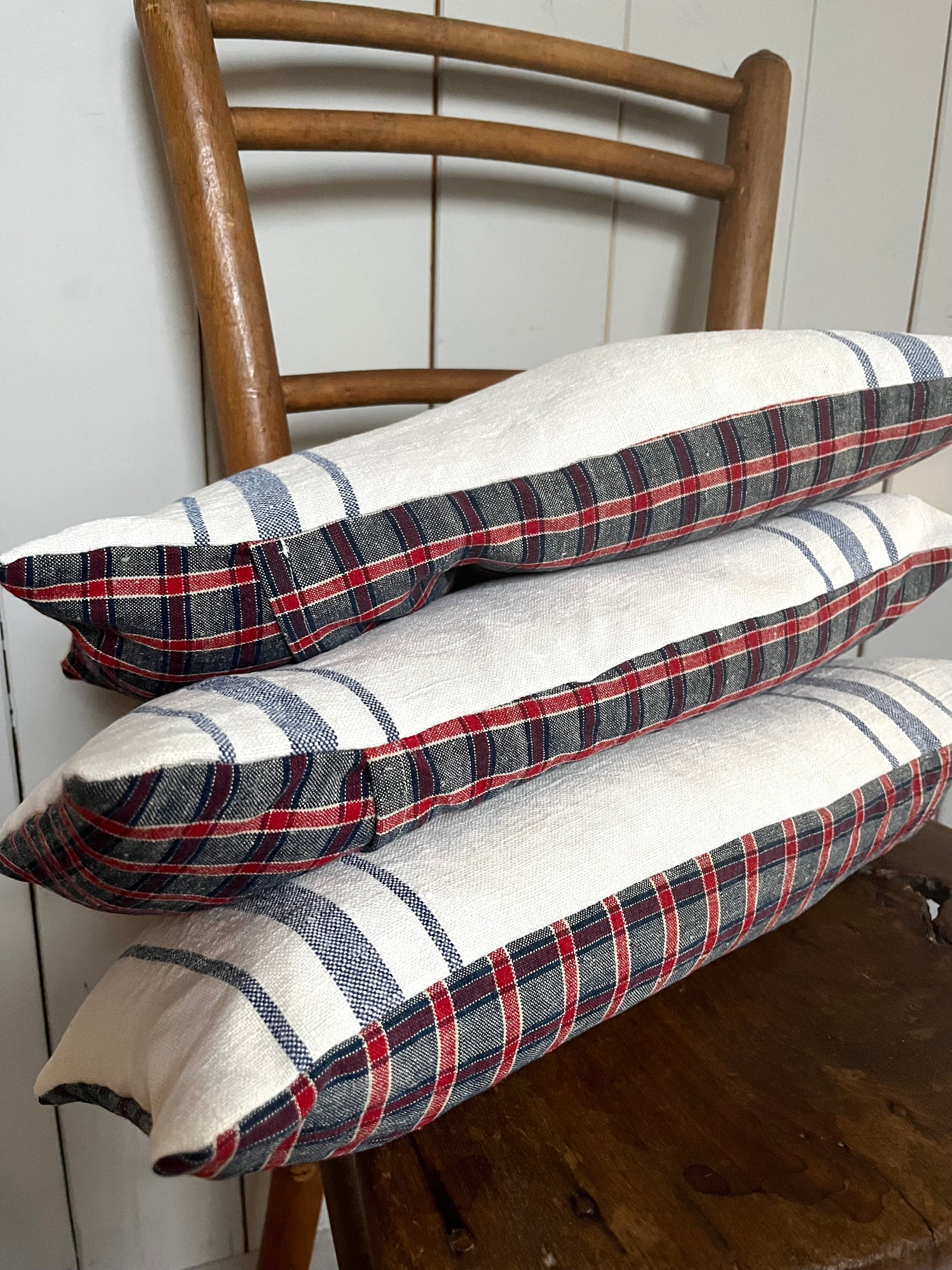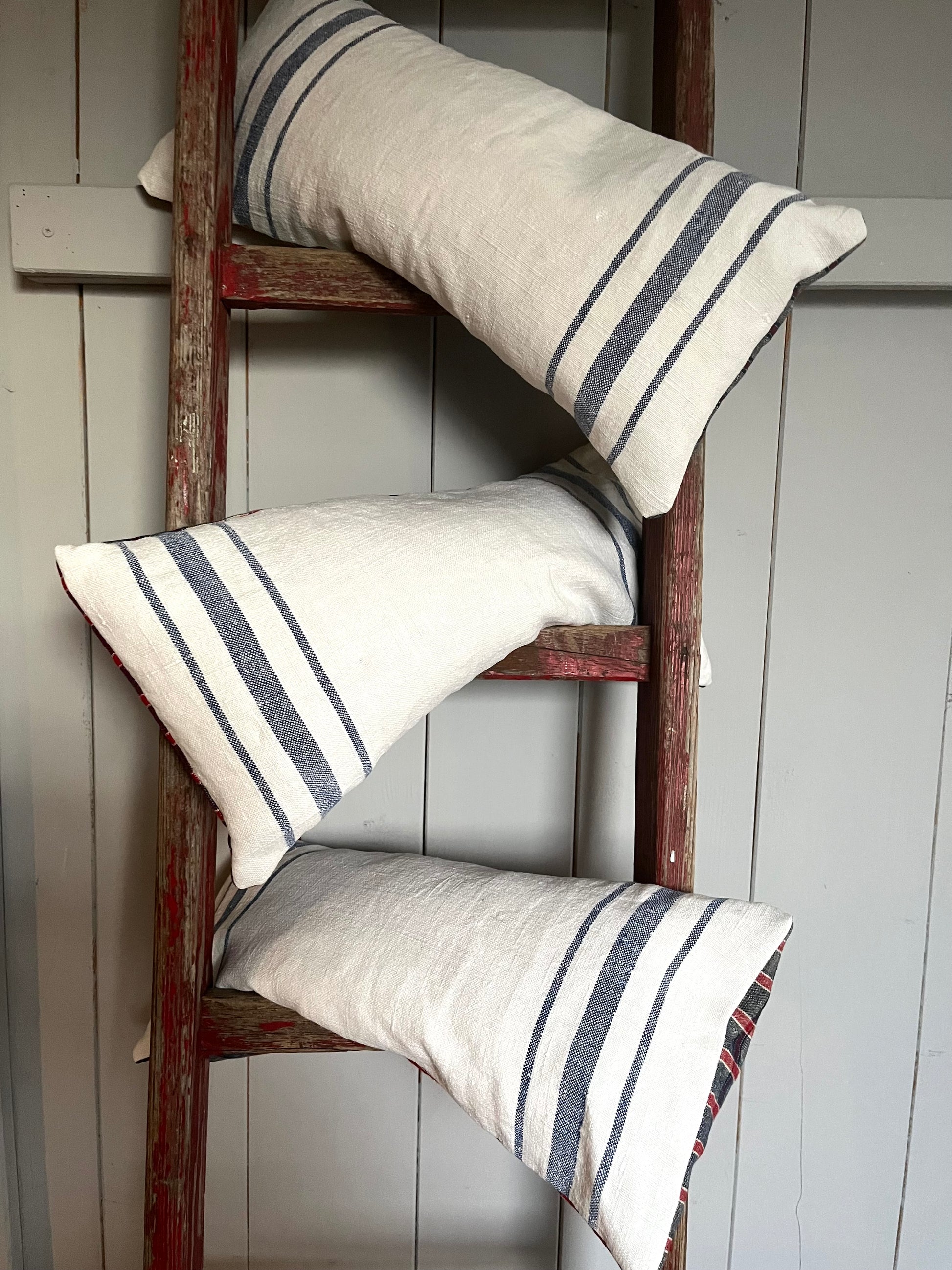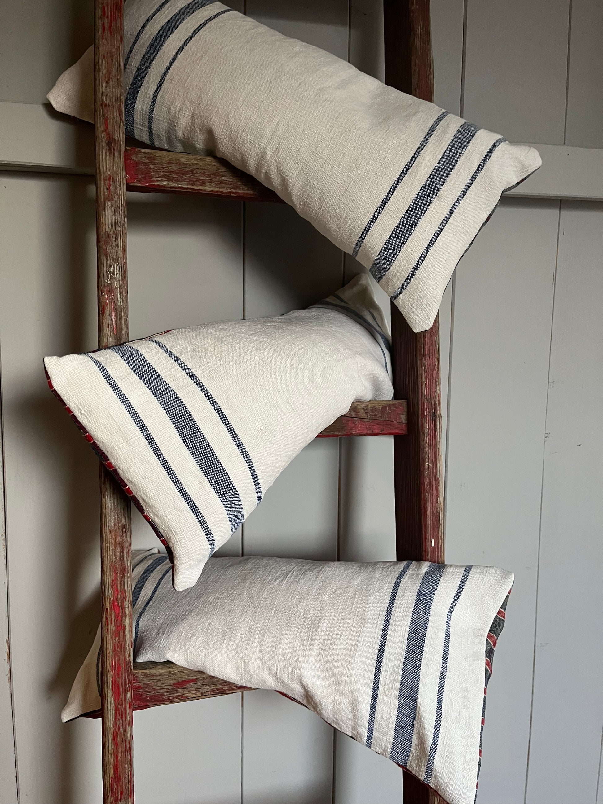 Sehen gut aus, tun gut im Nacken, im Rücken, überall da, wo man ein bisschen Unterstützung braucht.Kissen aus altem Leinensack. Die Vorderseite hat blaue Streifen. Die Rückseite ist aus altem Bauernleinen rot/blau kariert. Es wurde gewaschen und ist sauber. Aber immer bedenken: es ist ein Vintage Kissen, das Material hat gelebt! Das macht den Charme dieser alten Stücke aus. Es ist gefüllt mit einem Dinkelkissen. Der Spelz duftet gut, lässt sich aber auch wunderbar formen, so dass das Kissen im Nacken oder im Rücken wie eine Stütze wirkt. Der Bezug ist abnehmbar und kann bei 40° gewaschen werden. Nicht in den Trockner geben.