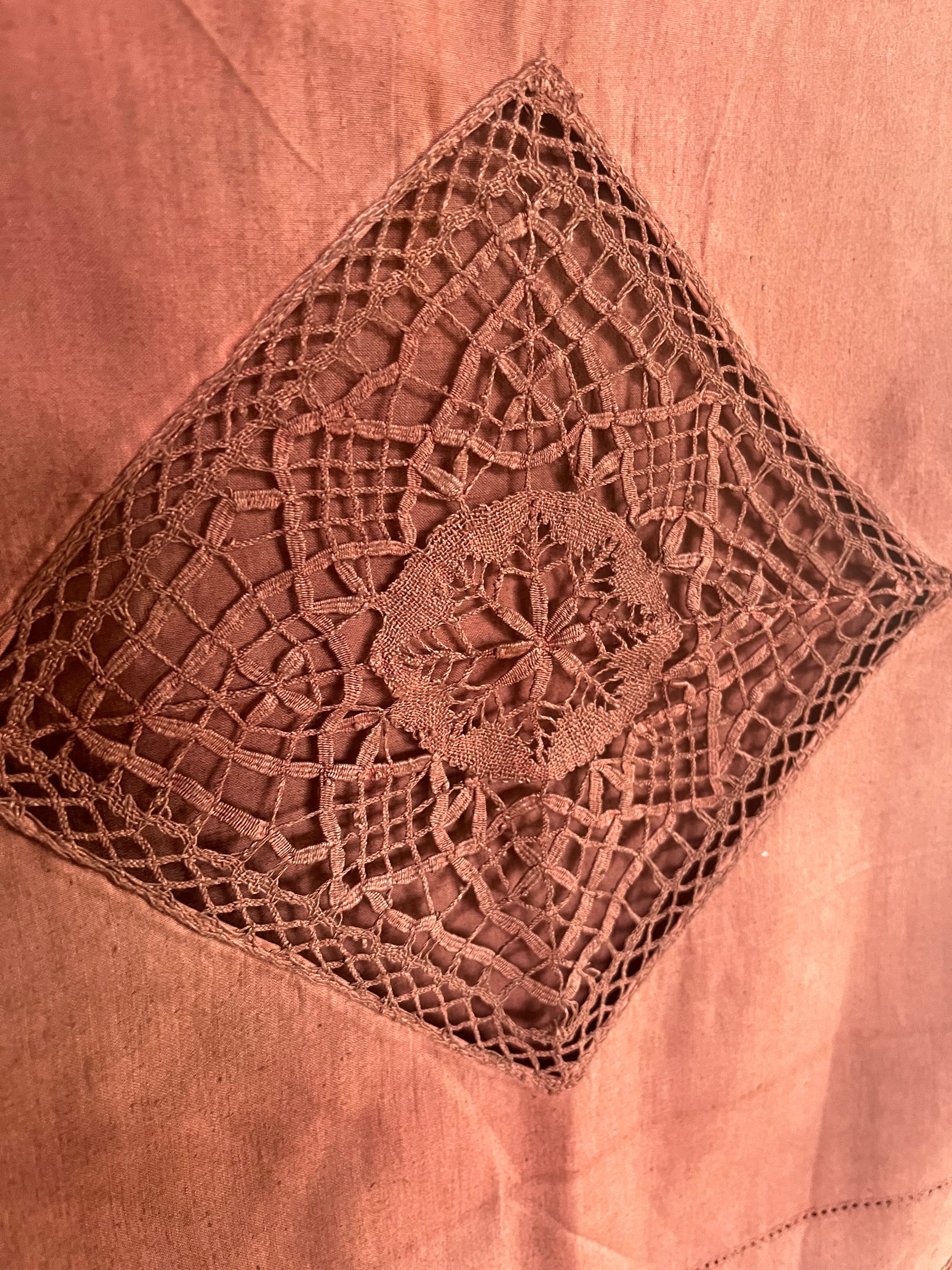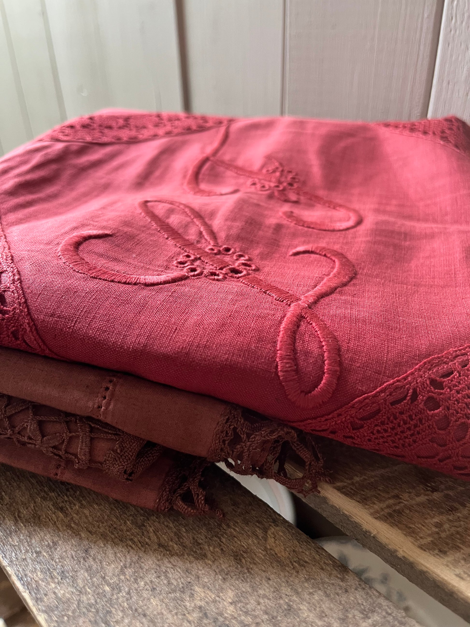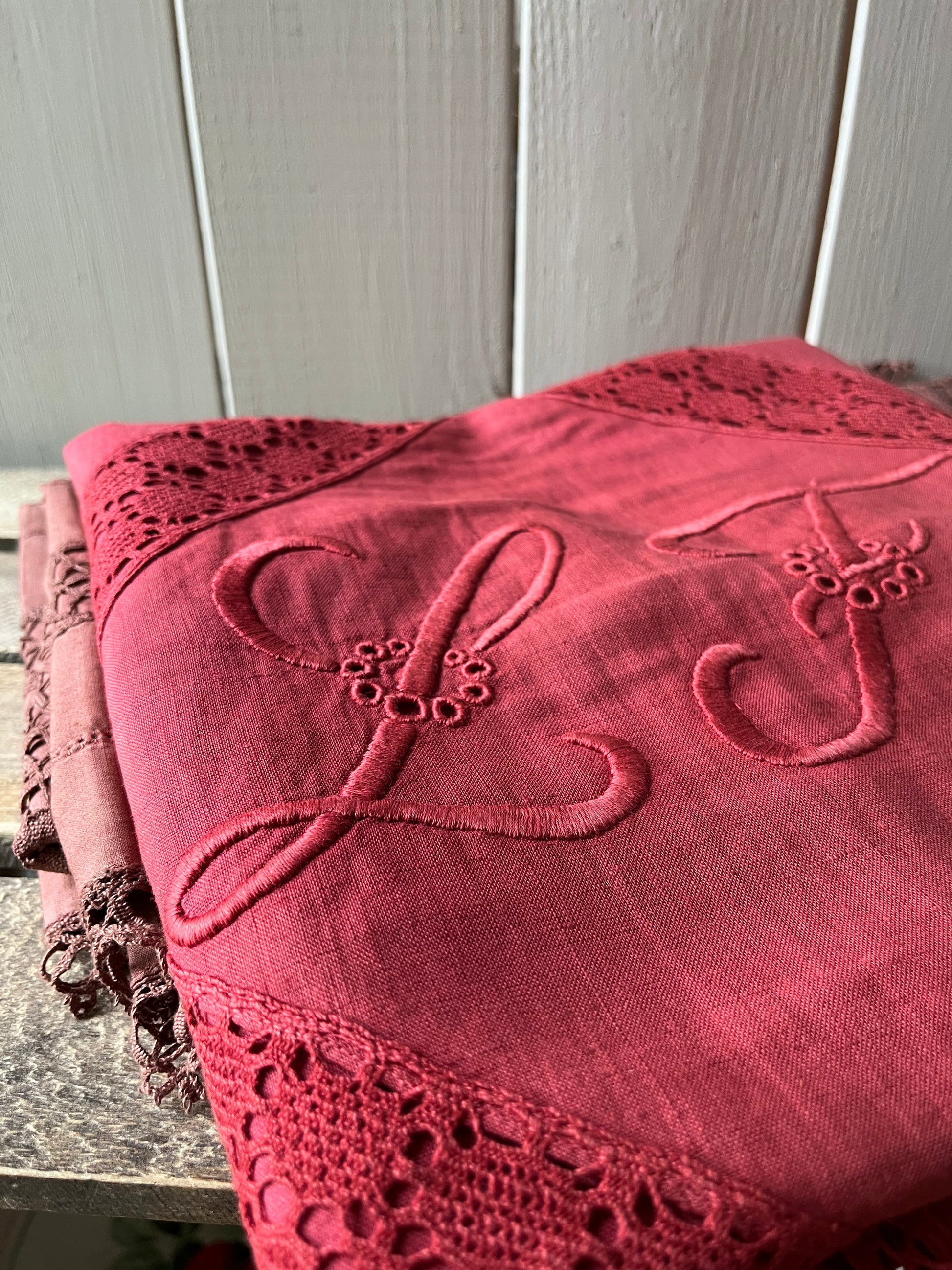 Drei außergewöhnliche Kissenbezüge aus Frankreich. Sie sind alt, reich mit Handarbeit versehen. Ein Kissen hat in der Mitte ein großes Monogramm: L F. Es ist weinrot gefärbt, die zwei anderen Kissen haben in der Mitte eingesetzte Filetarbeit und sind schokoladenbraun gefärbt. Das rote Kissen misst etwa 74 × 78 cm, die zwei anderen 66 × 70 cm. Sie bieten aLe einer nicht so üppigen 80 × 80 cm Füllung Platz. Das Trio kommt im Set. Toll erhalten. Lediglich die Knöpfe wurden erneuert. Material ist feines Halbleinen.