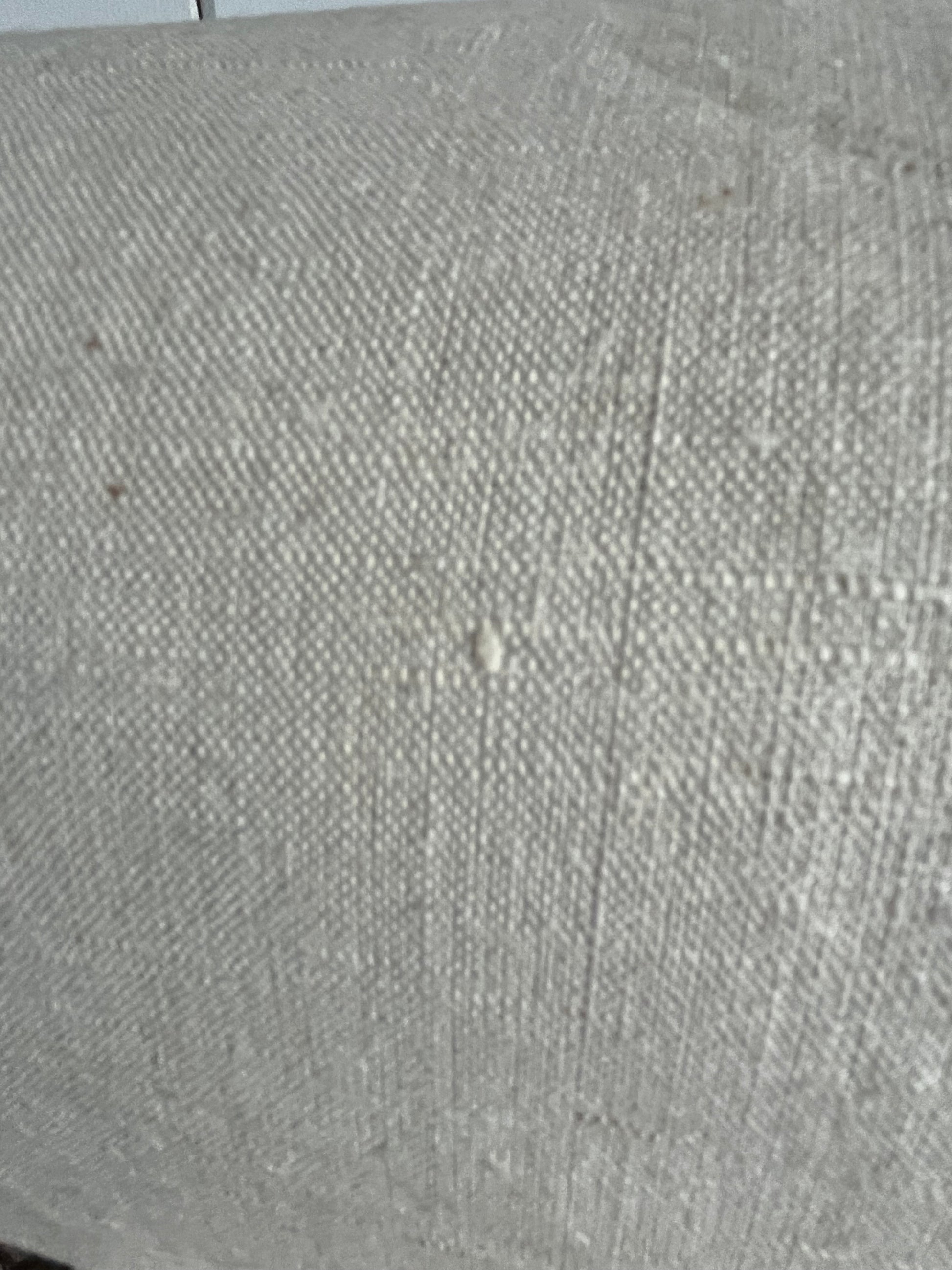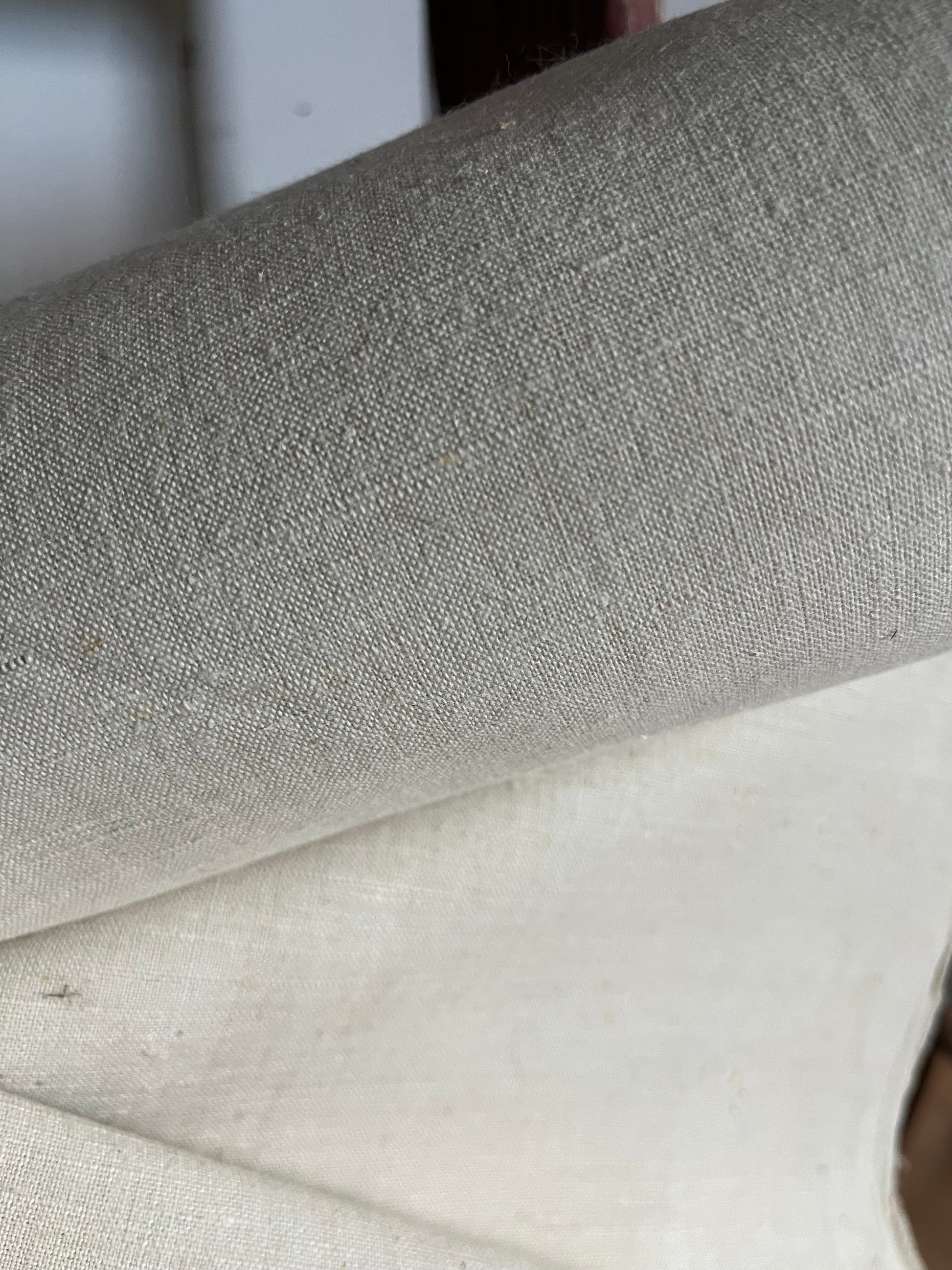 Ein ordentlich dicker Ballen altes Leinen. Es stammt etwa aus den 1940er Jahren. Im Ballen stecken rund 11 Meter in der Länge, die Breite beträgt 74 cm. Das ist sehr viel Stoff. Das Leinen ist dicht und kräftig gewebt. Der ganze Ballen wiegt 2 Kilo. Er ist insgesamt toll erhalten, bis auf eine Staubspur und vielleicht hier und dort im Knick kleine Lagerspuren, ist das Leinen schön sauber. Es hat einen Naturton, ist mittelgrob, Tendenz glatt gewebt. Man sieht die Flachspflanzenstruktur. Aus diesem Leinen lassen sich Kleidung und Haushaltstextilien nähen. Ein toller, alter Stoff.