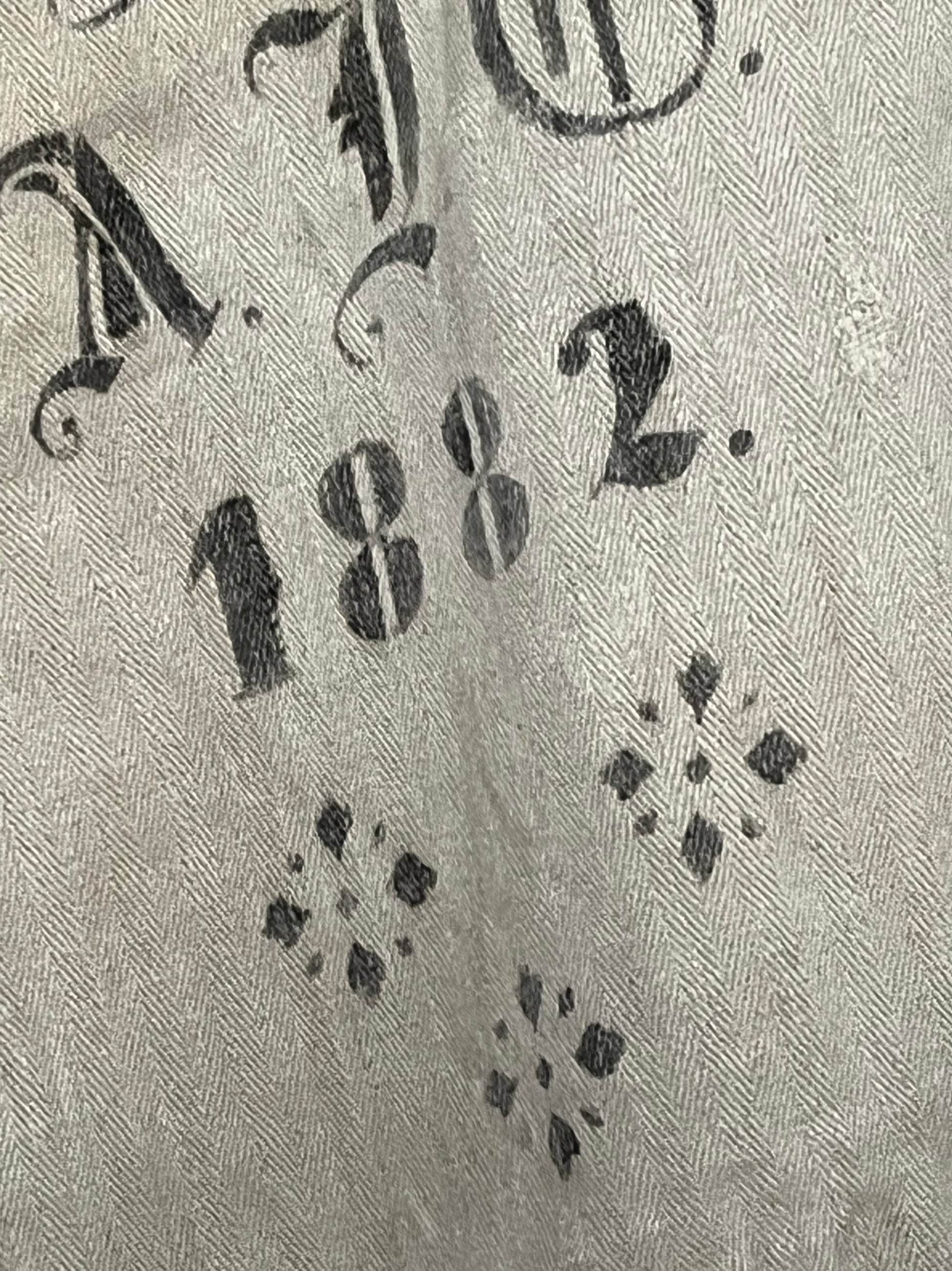 Groß, besonders alt (1888) und bildschön ist dieser Sack. Er diente früher der Aufbewahrung von Mehl oder Körnern. Der Aufdruck ist original und stammt vom Bauern. Das Leinen ist kräftig und hat Fischgrätwebung. Farbe: Natur-Leinen und darauf der dunkle Aufdruck. Maße: 128 × 50 cm. Es gibt keine Löcher. Er hat die Jahre gut überstanden, zeigt wenige Zeitzeichen, vorne ein bisschen Lagerschmutz, hinten ein Fleck. Immer bedenken: das macht den Charme der vintage Stücke aus. Er lässt sich zu Kissen, Taschen, Rollos, Teppichen vernäht. Das Leinen ist kräftig und schwer.