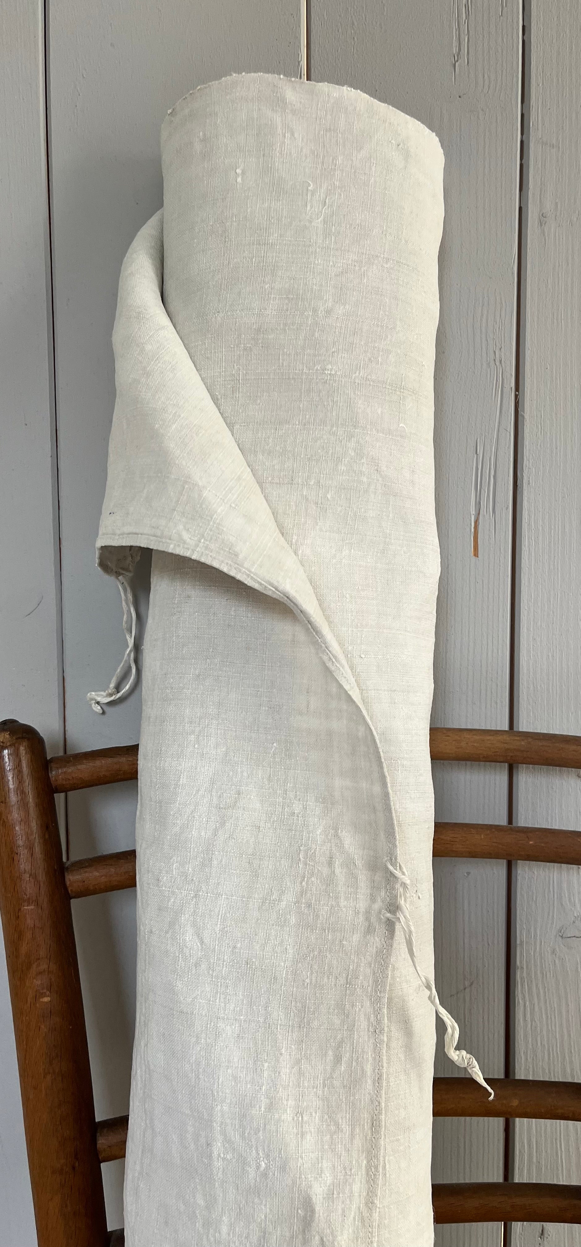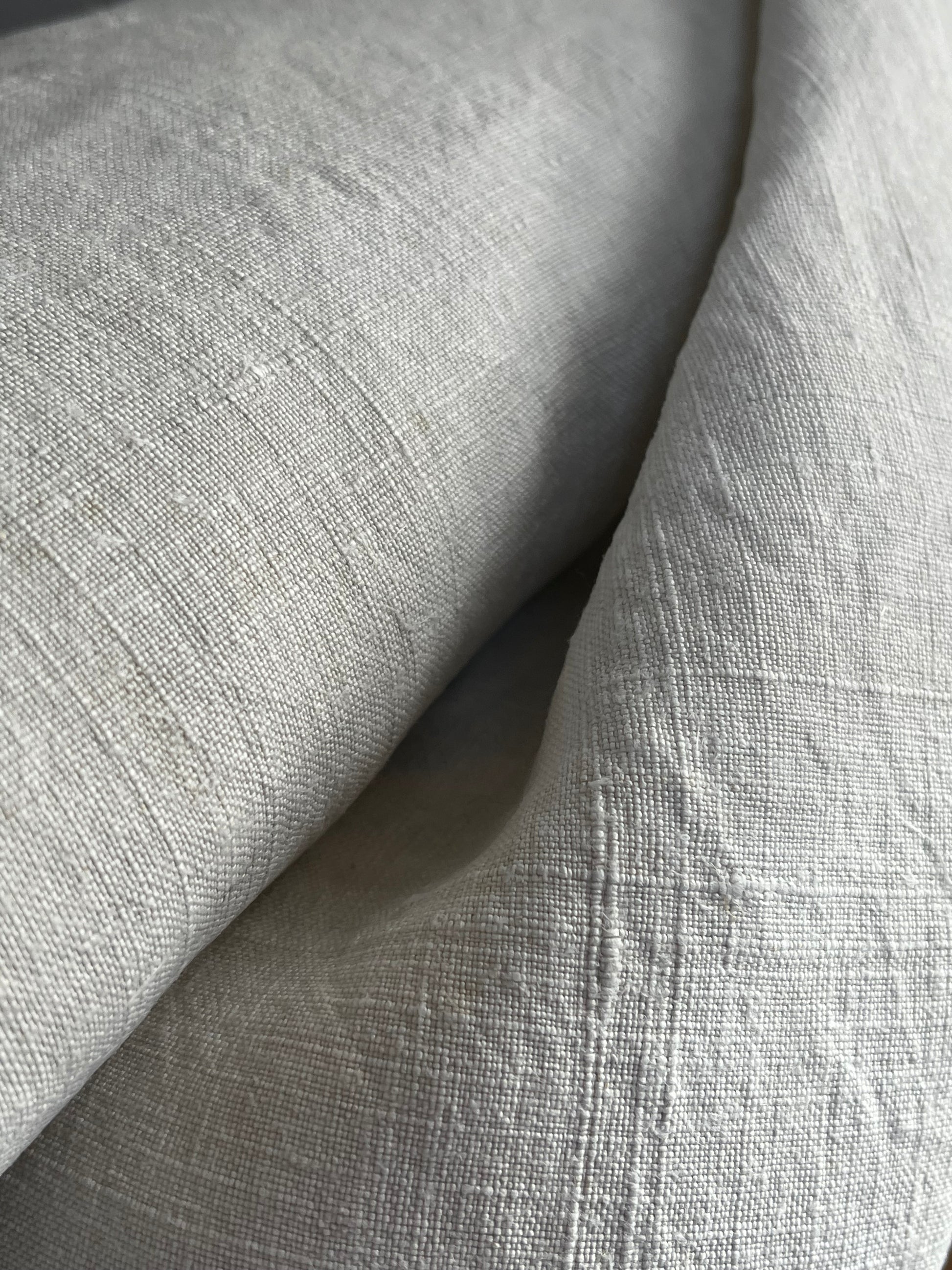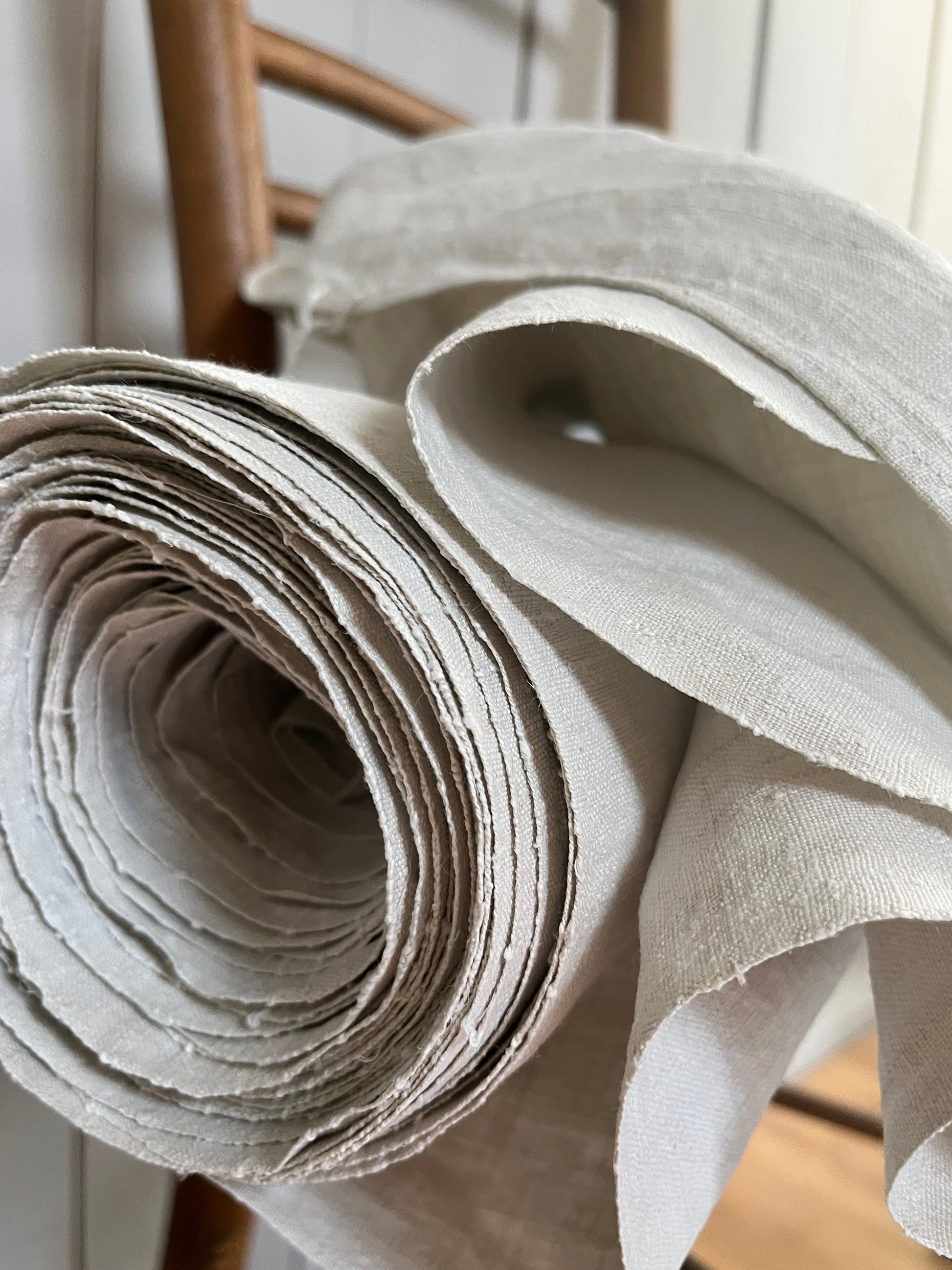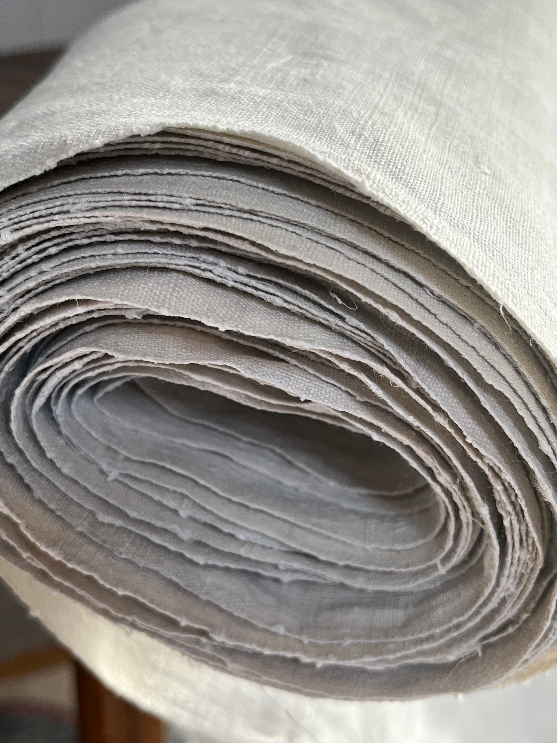 Richtig schönes, sattes Leinen. Relativ glatt gewebt. Man erkennt die Flachsfaser, aber der Stoff fühlt sich schön eben und kühl an. Gewebt Anfang 1900. Es sind 5 Meter tolles, fast sauberes Leinen. Die letzten miniminimalen Lagerspuren verschwinden mit den nächsten Waschgängen. Es ist ein dicht gewebtes Leinen, fällt schön schwer, eignet sich für alle Näharbeiten. Kleidung wie Haushaltstextilien. Und der Farbton ist ein Greige. Die Breite beträgt 72 cm.