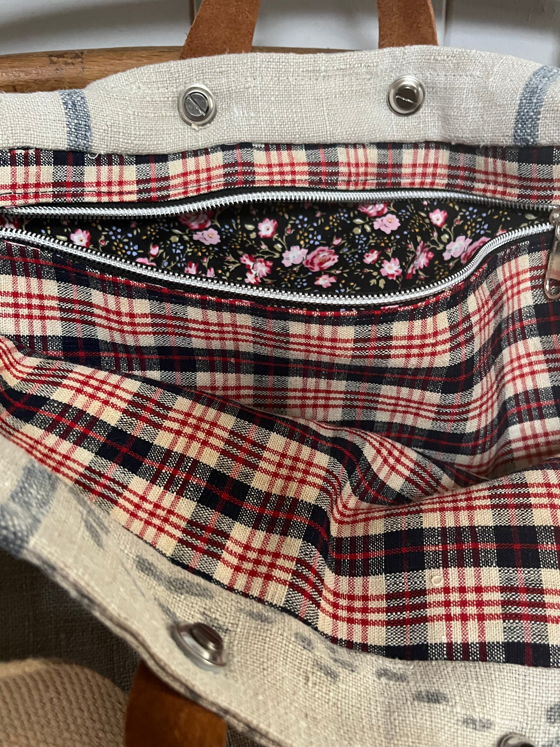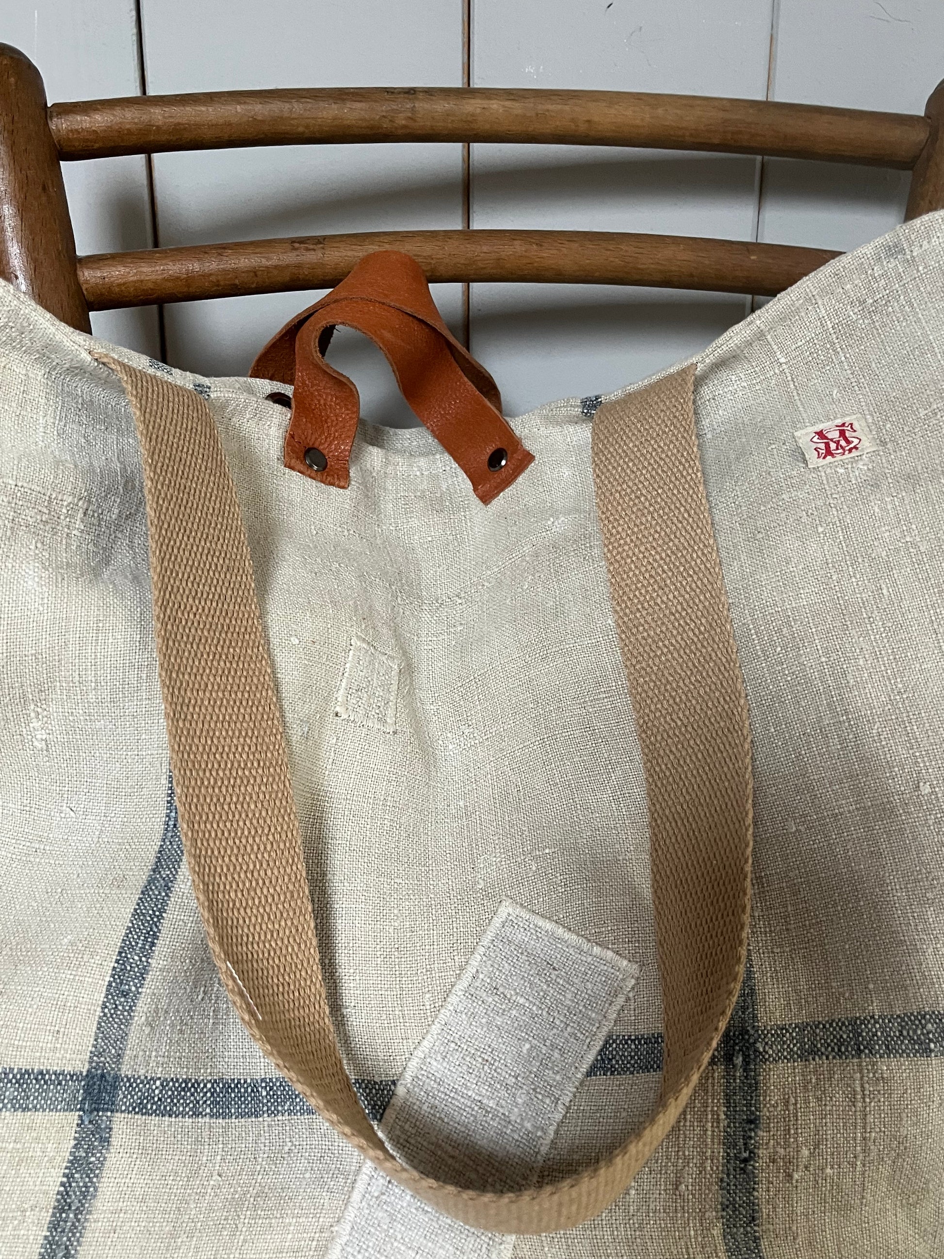 Große Tasche aus einem alten, kräftigen Kornsack - 124 Jahre altes, kräftiges Leinen! Der Sack ist gut erhalten, wurde gewaschen. Und hat eine wunderbare Aufschrift auf der gesamten Vorderseite. Auf der Rückseite blaue Streifen, Flicken. Innen gefüttert mit altem Leinen, handgewebt aus Bayern. Es gibt lange Schulterhenkel aus Canvas und Ledergriffe. Reißverschluss-Innentasche. Jede Tasche ist handgefertigt und ein Unikat. Das Leinen wurde gewaschen, ist sauber. Wenn man in ihr nicht gerade Ziegelsteine transportiert, macht die Tasche jedes Shopping tapfer mit! Maße: Breite etwa 50 cm. Höhe ohne Henkel ca. 42 cm.