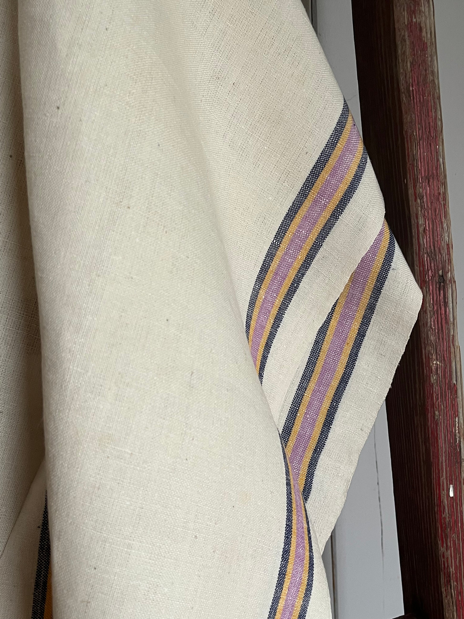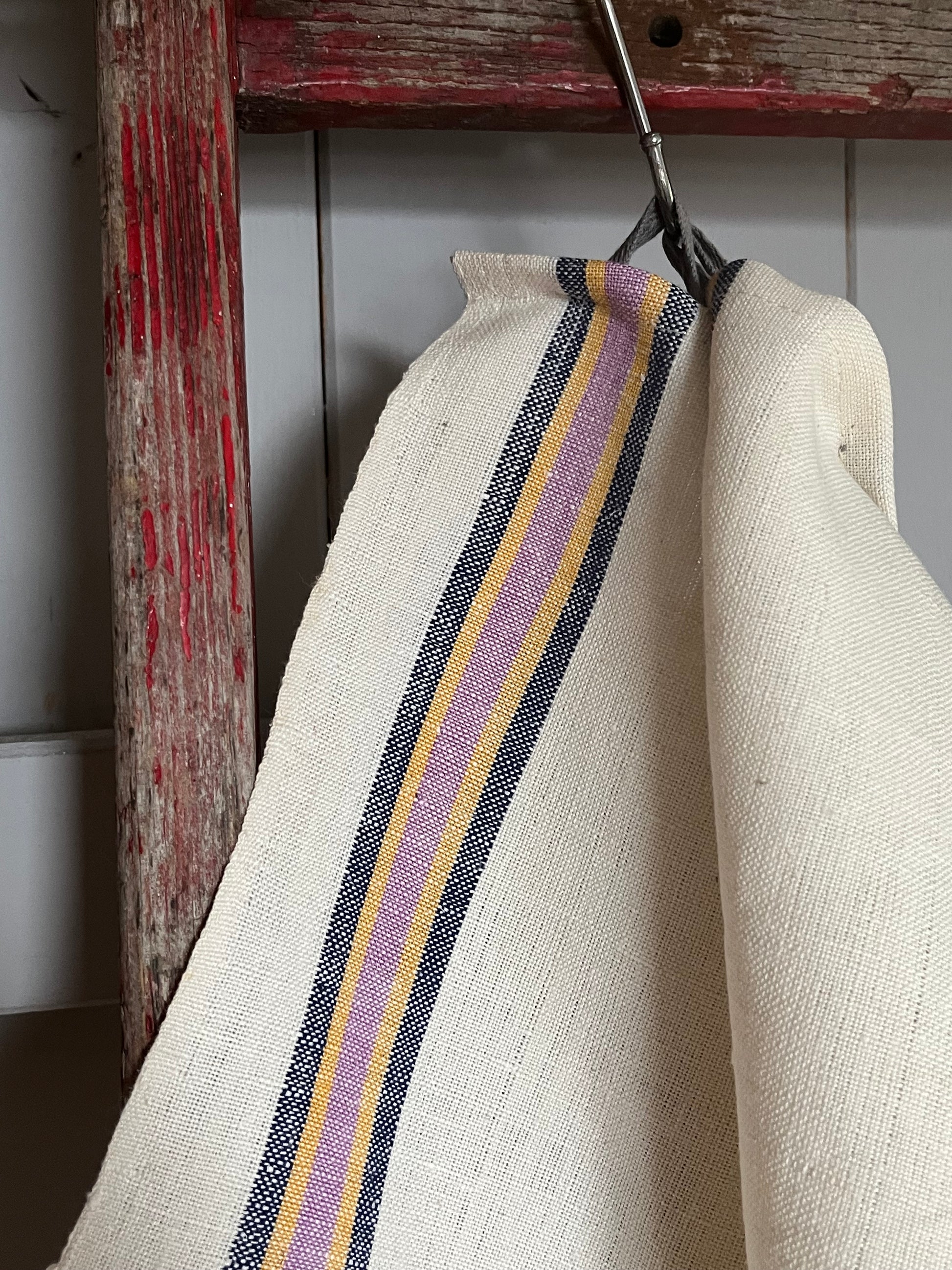 Aus altem Leinen genähtes Tuch mit Streifen in Blau/Curry/Lavendel seitlich. Maße: ca. 67 × 40 cm. Leinenfarbe: ein helles Beige. Das Tuch ist wunderbar erhalten, unbenutzt. Schön für die Küche oder das Bad. Auch als Tischläufer zu verwenden. Aufhänger vorhanden.