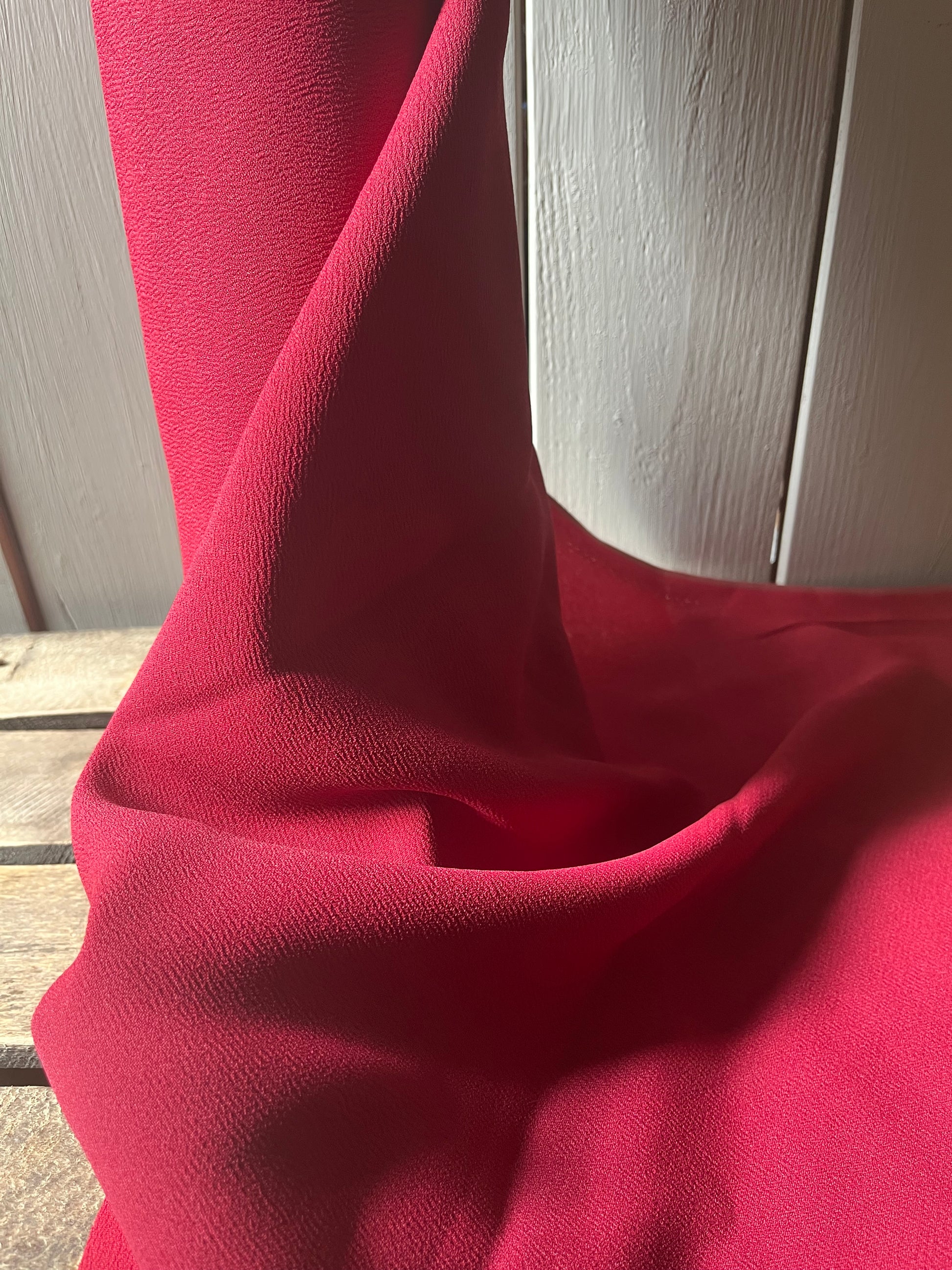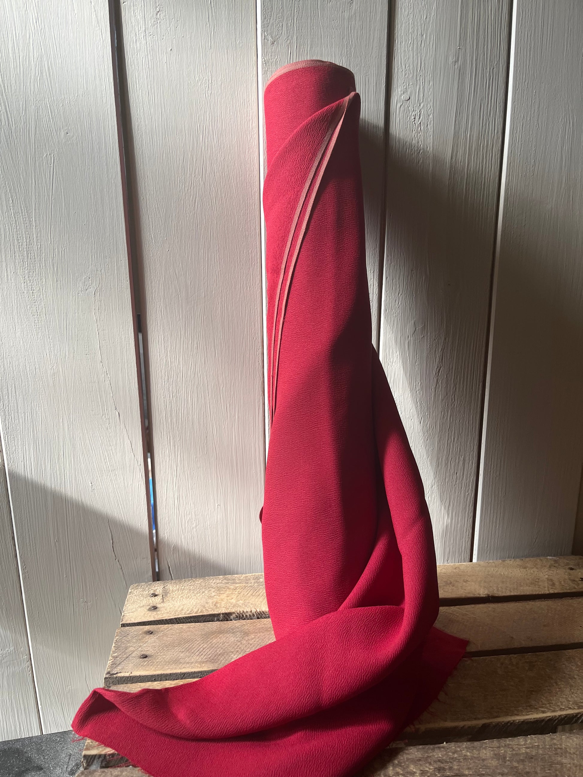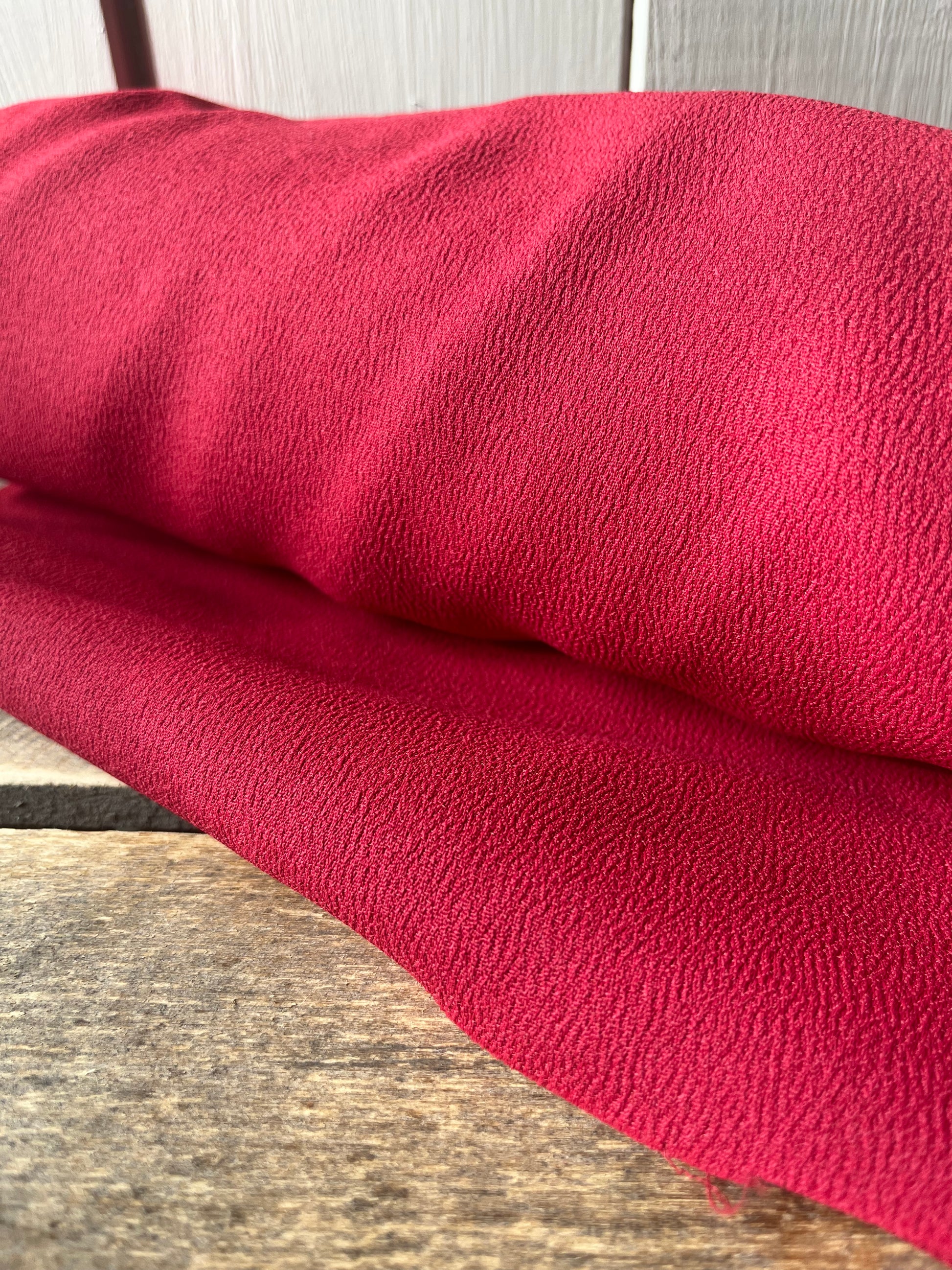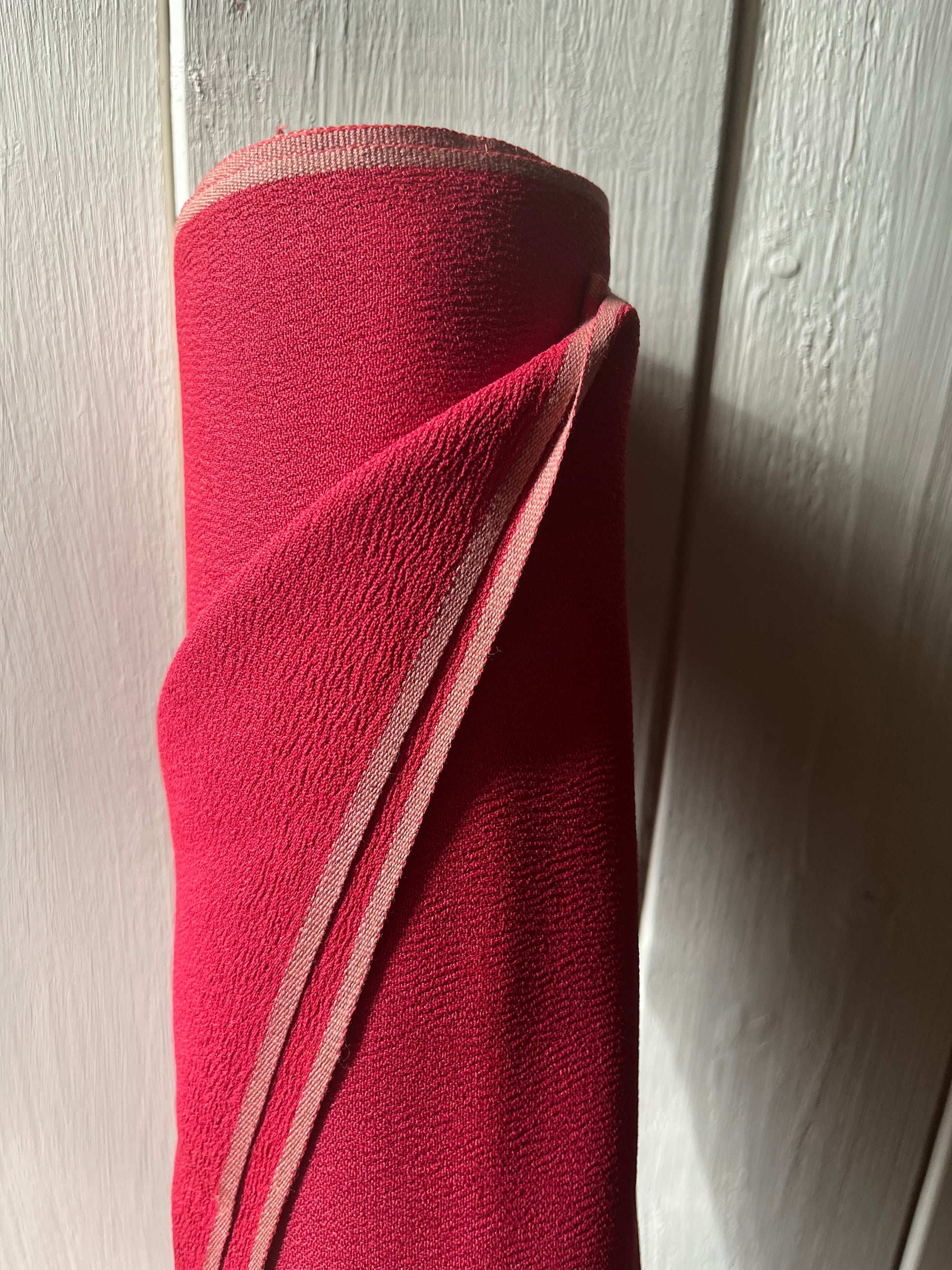 Aus dem Fundus eines alten Textilhandels: 4,1 Meter glatter, feiner Crepe. Die Breite beträgt etwa 96 cm. Der Stoff ist leicht, fällt geschmeidig. Farbe ist ein sattes Weinrot. Die Seide ist unbenutzt und wunderschön erhalten.