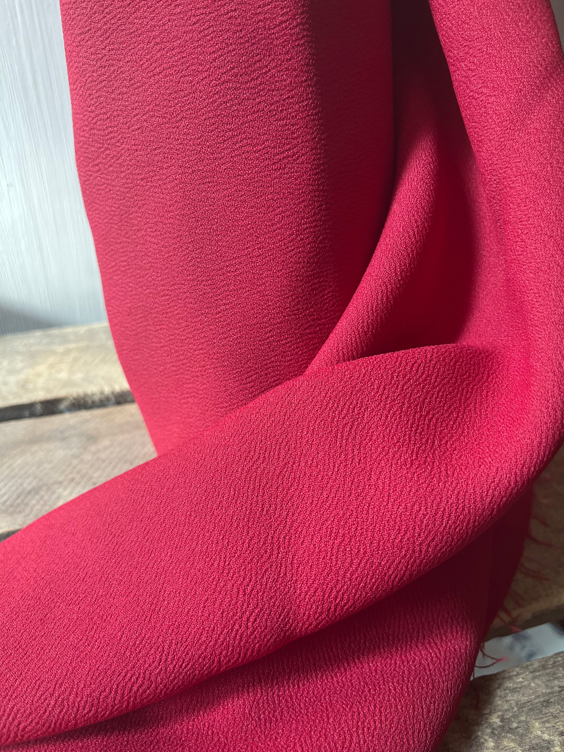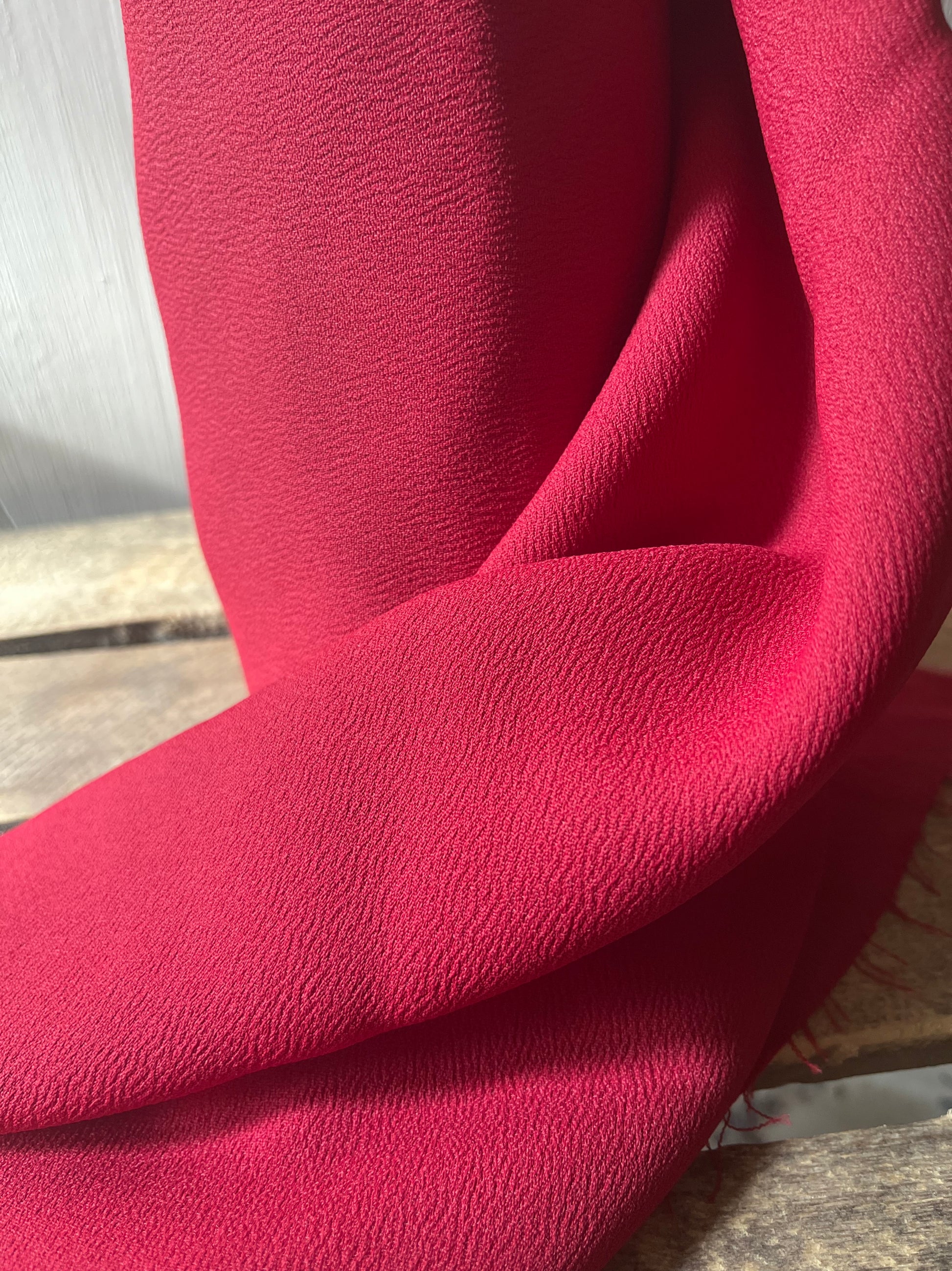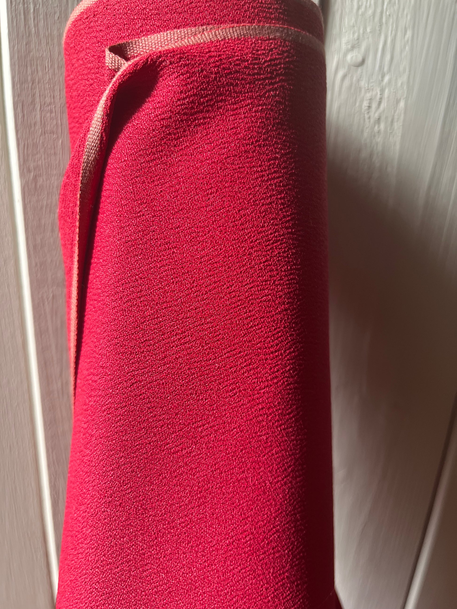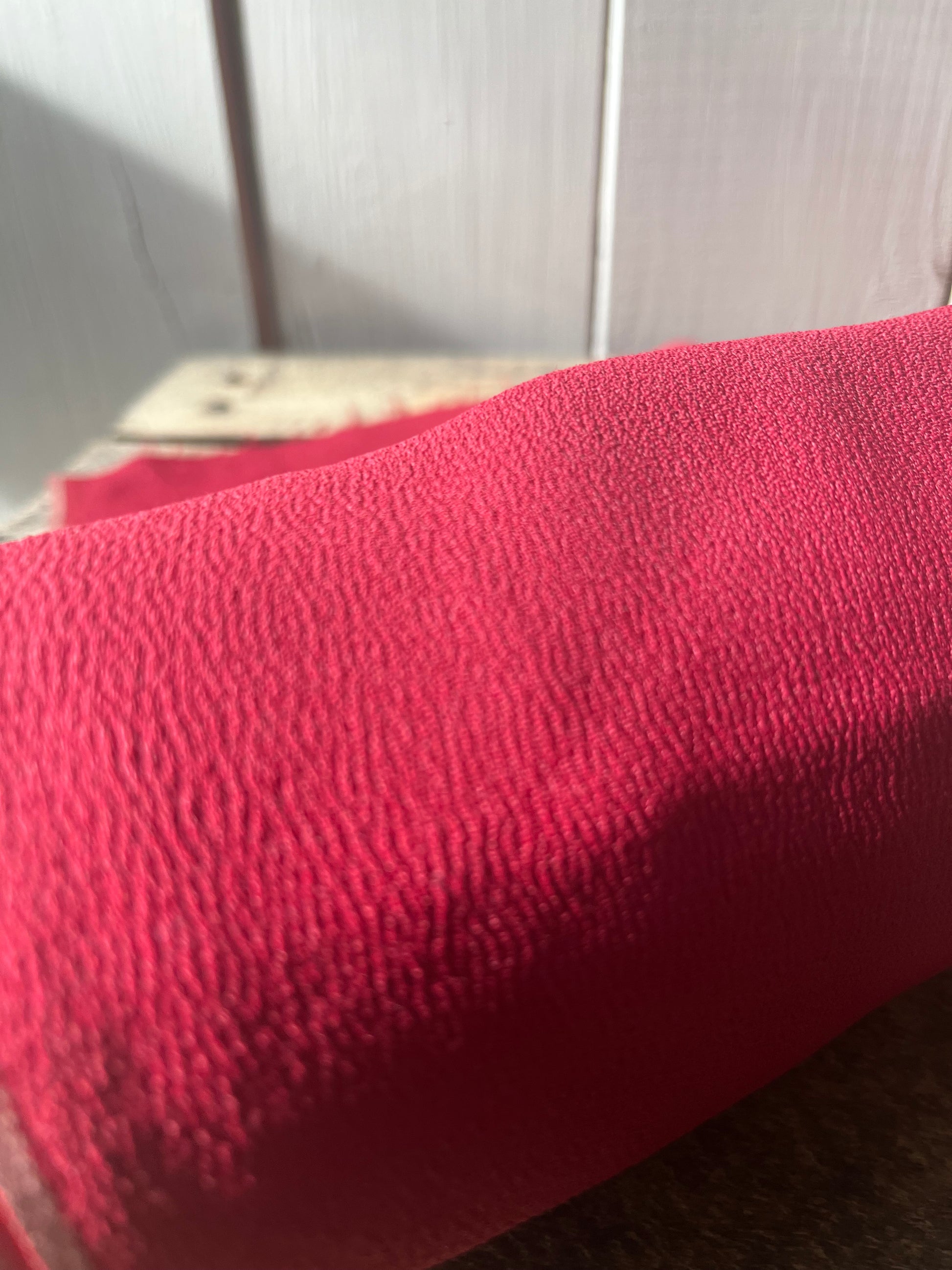 Aus dem Fundus eines alten Textilhandels: 4,1 Meter glatter, feiner Crepe. Die Breite beträgt etwa 96 cm. Der Stoff ist leicht, fällt geschmeidig. Farbe ist ein sattes Weinrot. Die Seide ist unbenutzt und wunderschön erhalten.