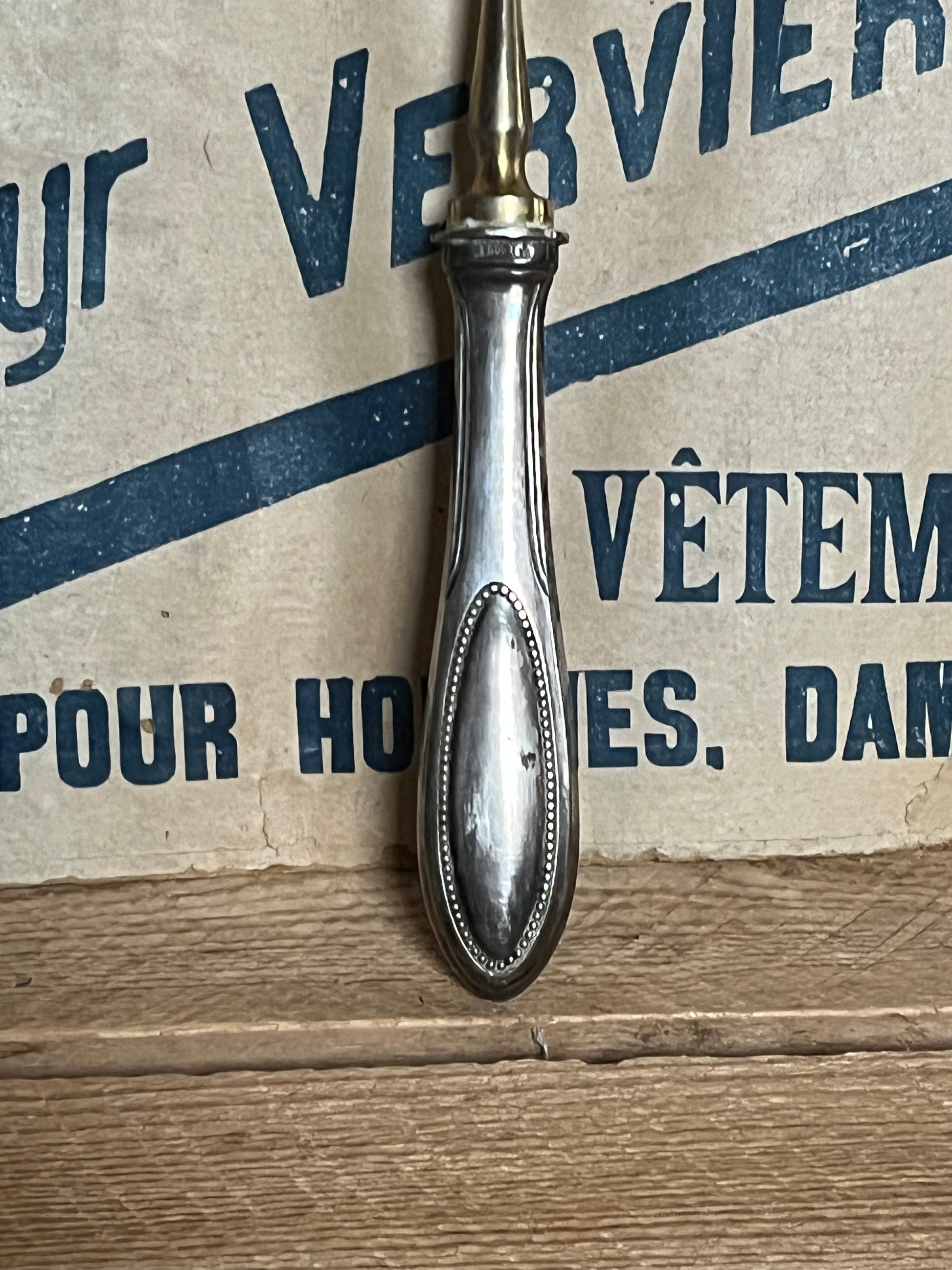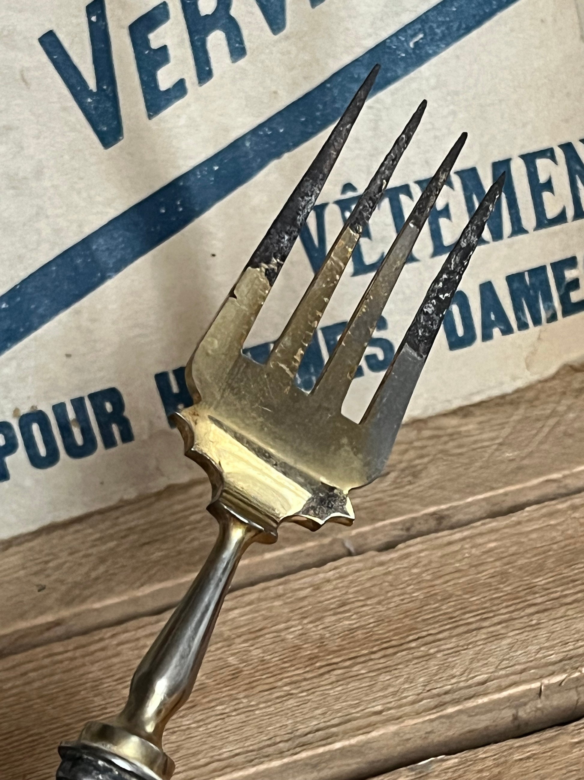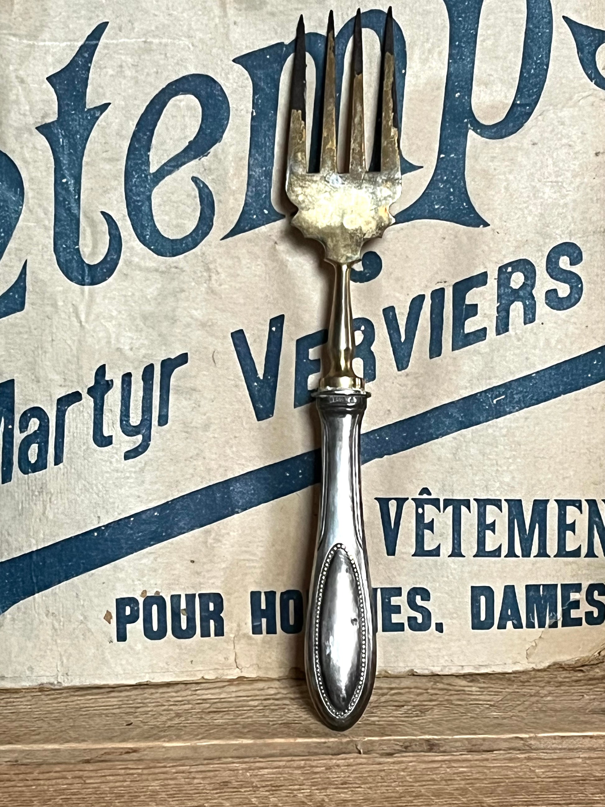 Imposante Bratengabel aus Frankreich. Sie ist groß, der Griff versilbert, die Zinken könnten eine Messingauflage haben? Sie hat gelebt, was man ihr an den Zinken ansieht. Der Griff ist nach wie vor wunderschön und auch verziert. Das schöne Stück macht sich toll auf dem Tisch, natürlich nicht nur für Braten geeignet. Wer mag, kann den ZInken vielleicht neues Leben einhauchen. In Form einer neuen Auflage. Länge, circa 25 cm, vorne Breite: 4 cm.