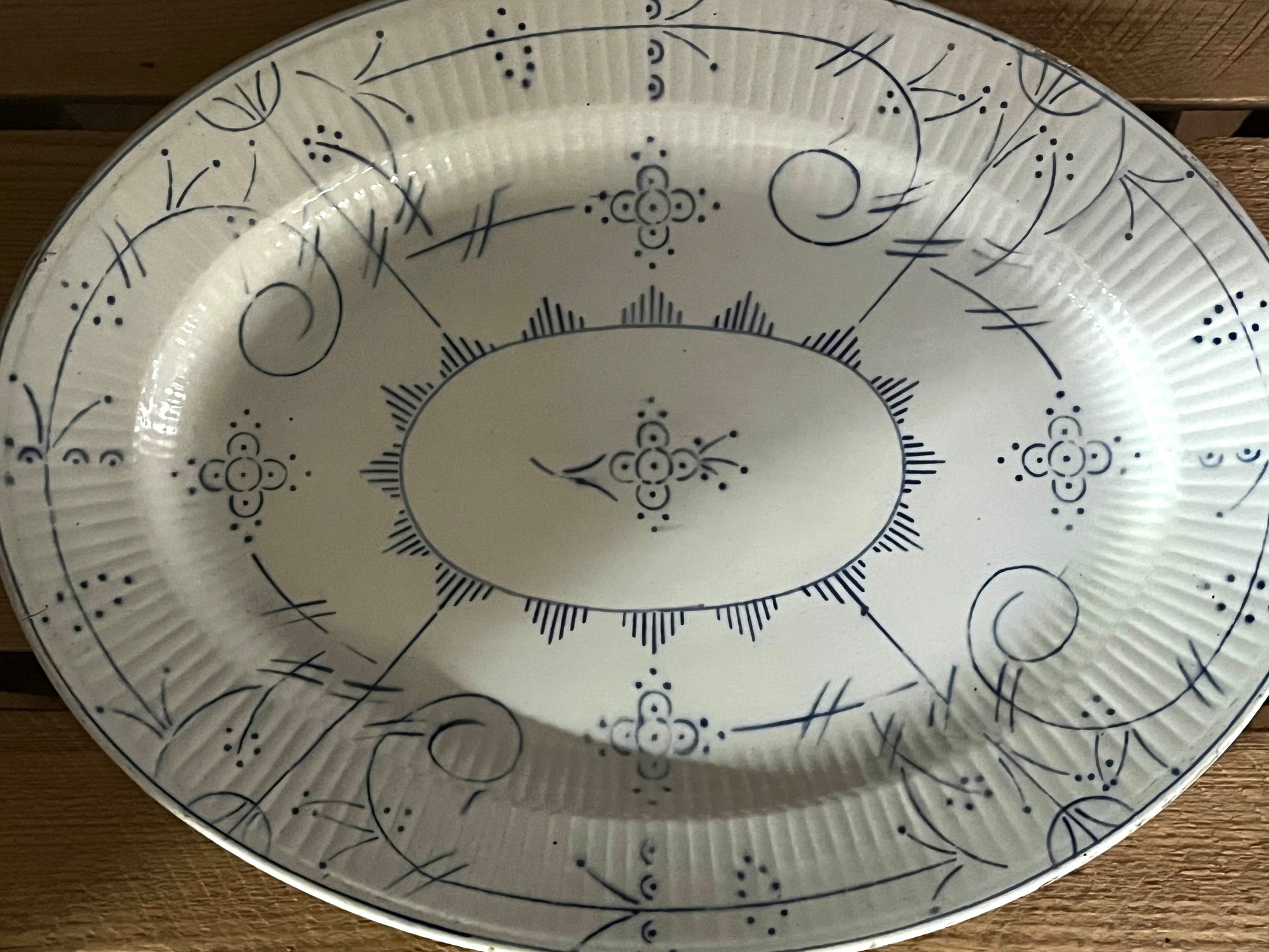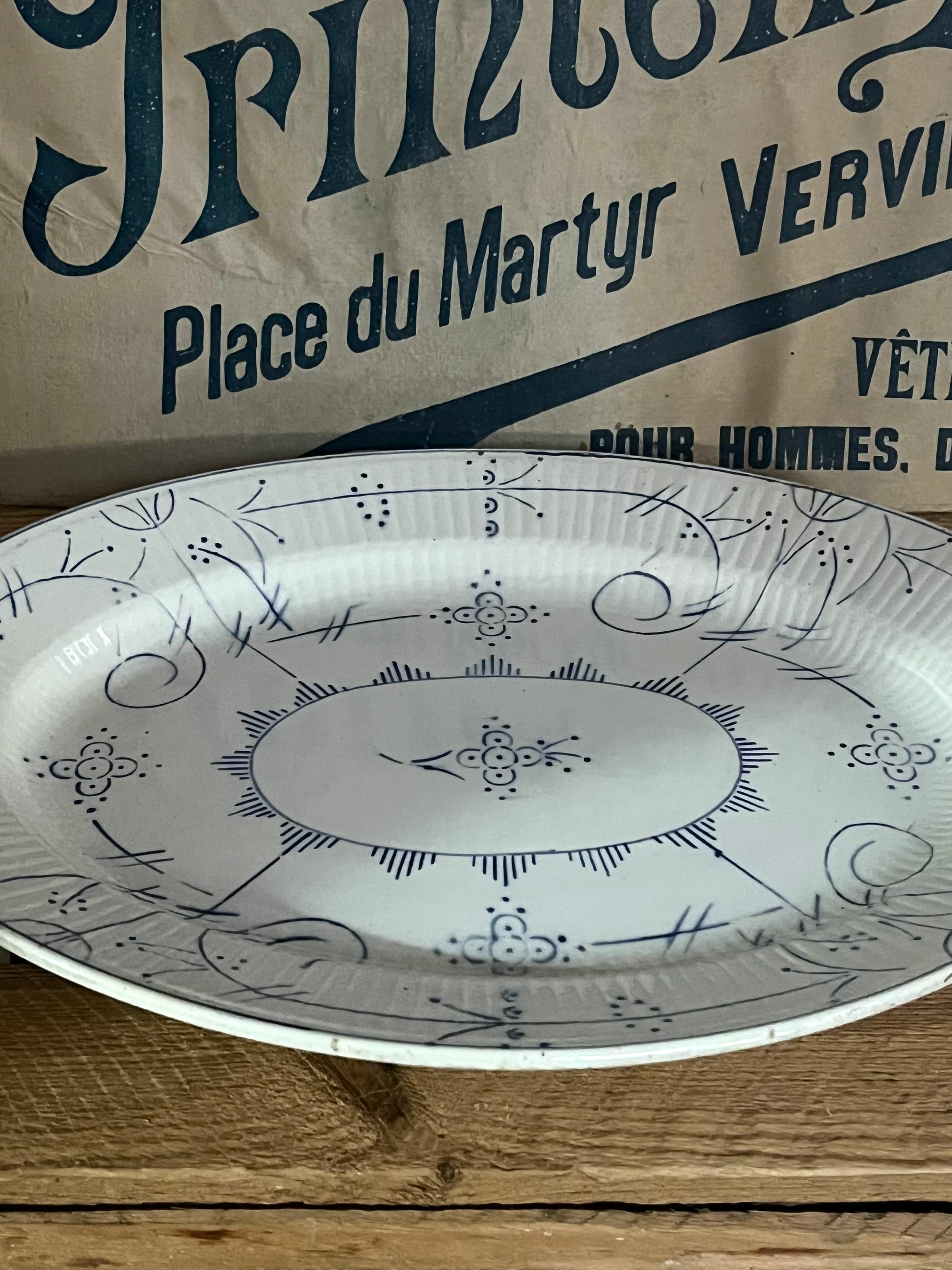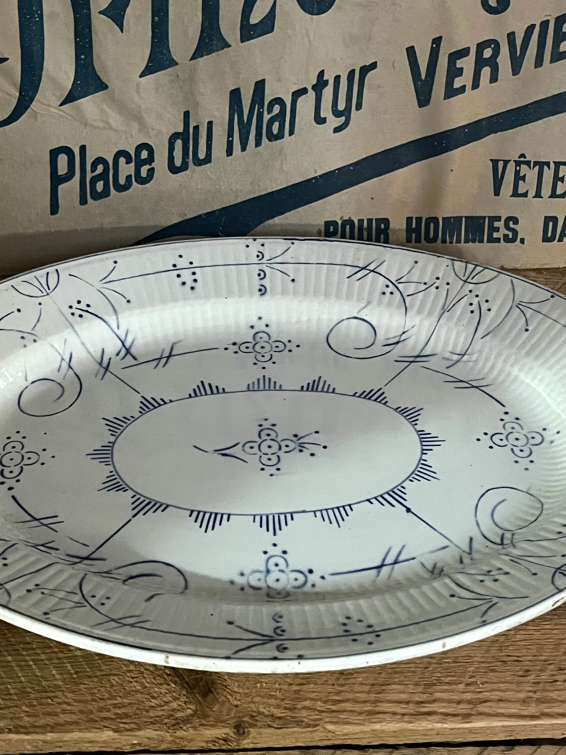 Eine belgische Servierplatte mit blauem Streublumen-Dekor. Das alte Stück ist intakt und klassisch gearbeitet. Die Platte hat einen vintage Weiß-Ton, glasierte Keramik, sieht fantastisch aus. Und sie ist sehr groß. Super geeignet für Gemüse, Beilagen, Antipasti oder Dessert.
