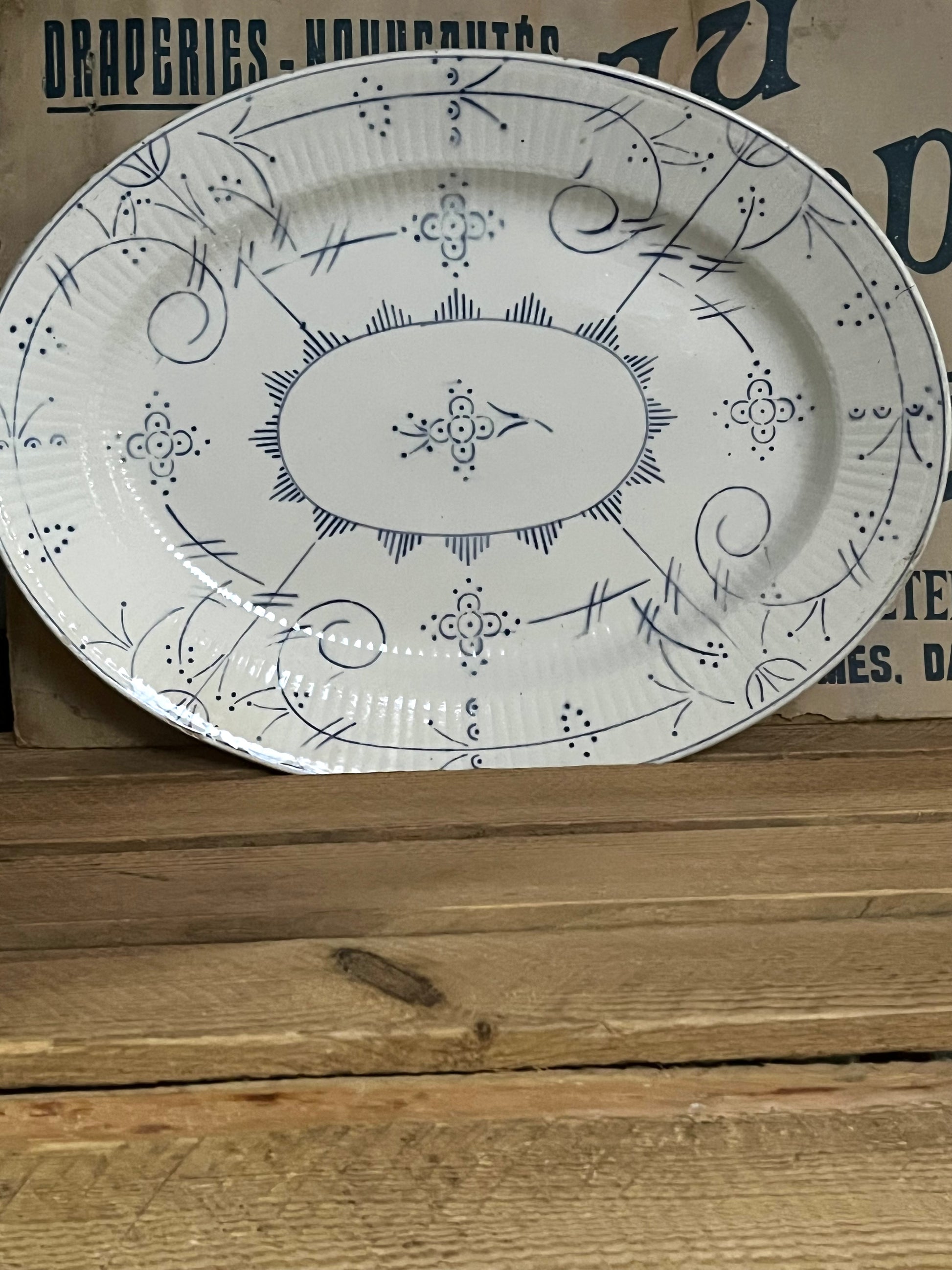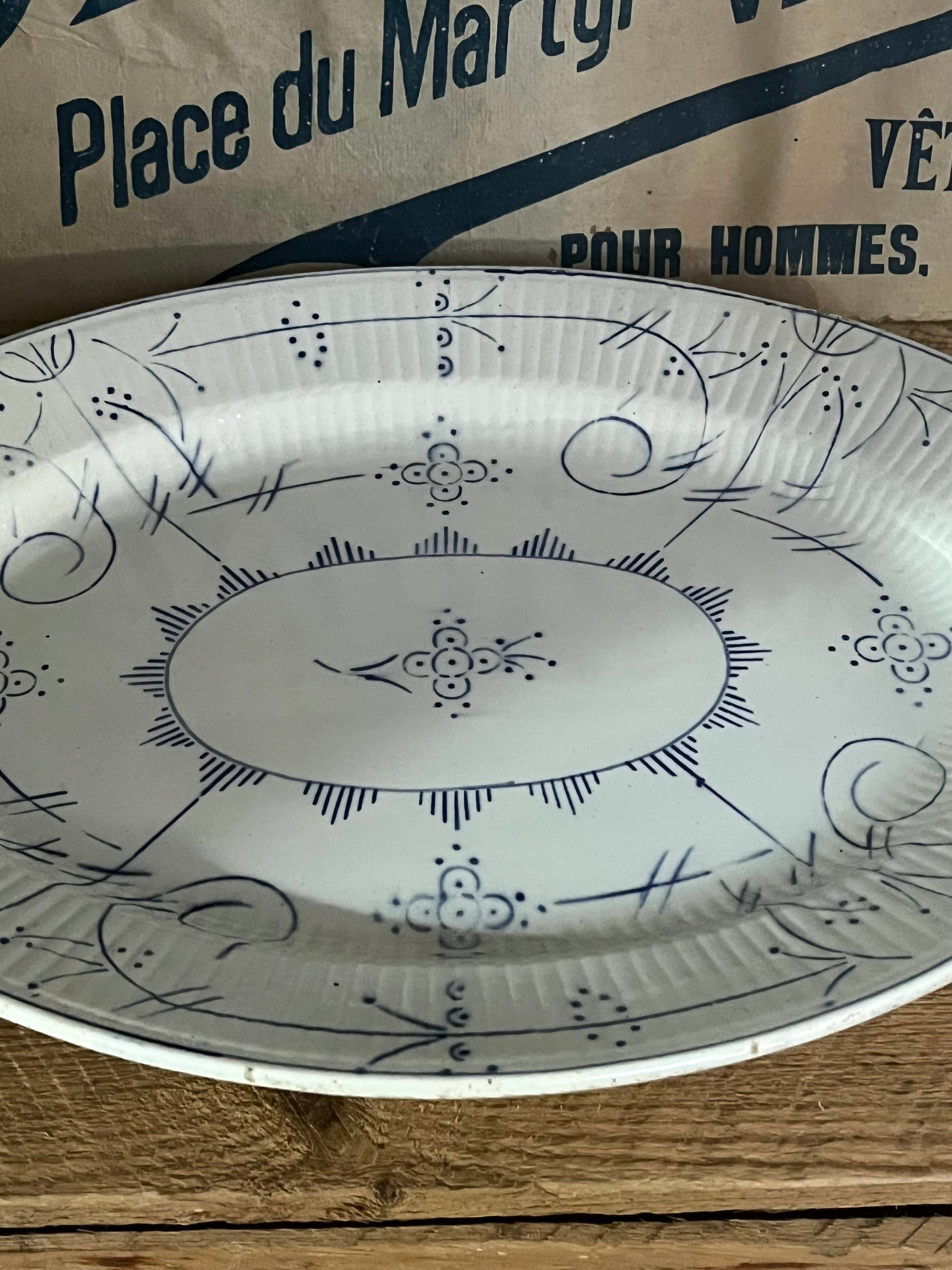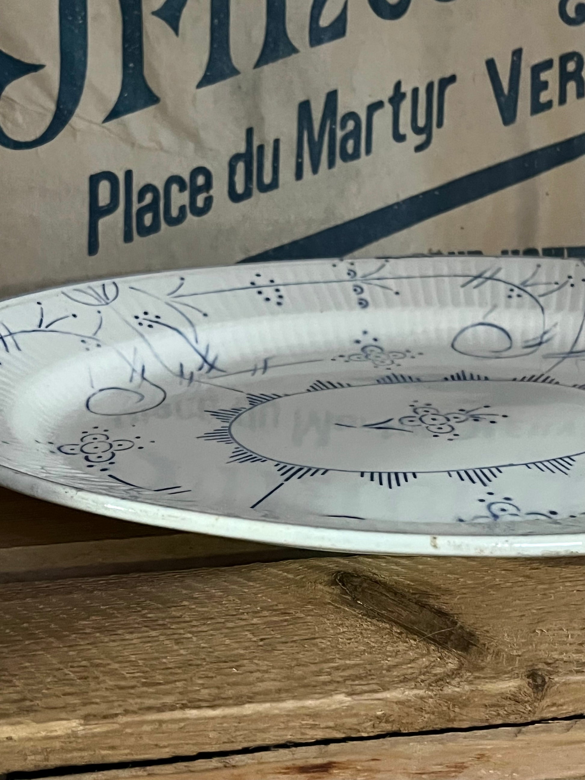 Eine belgische Servierplatte mit blauem Streublumen-Dekor. Das alte Stück ist intakt und klassisch gearbeitet. Die Platte hat einen vintage Weiß-Ton, glasierte Keramik, sieht fantastisch aus. Und sie ist sehr groß. Super geeignet für Gemüse, Beilagen, Antipasti oder Dessert.