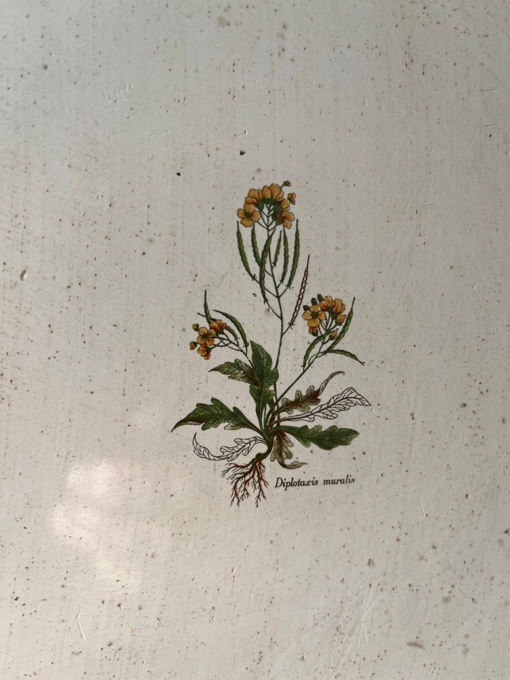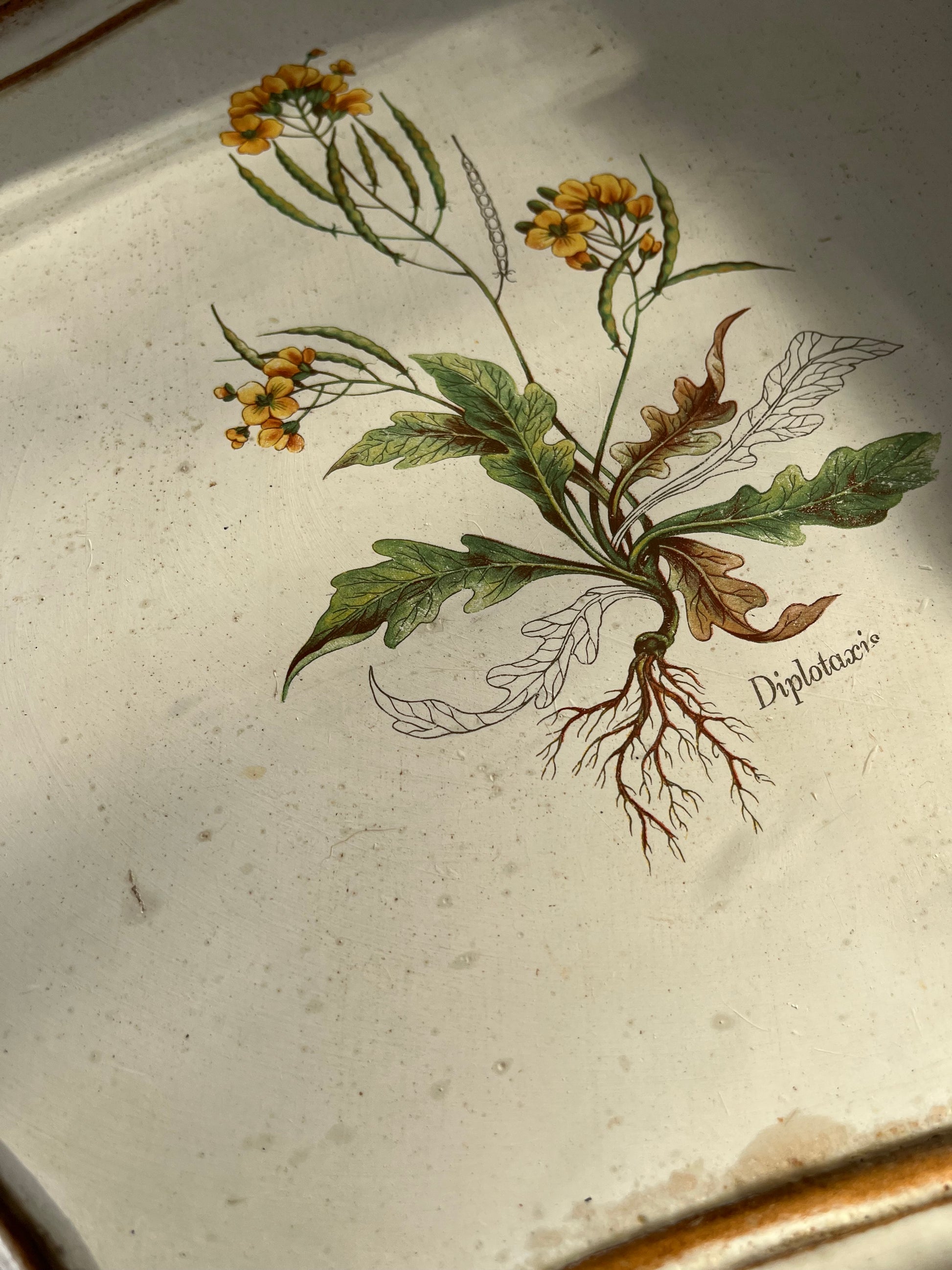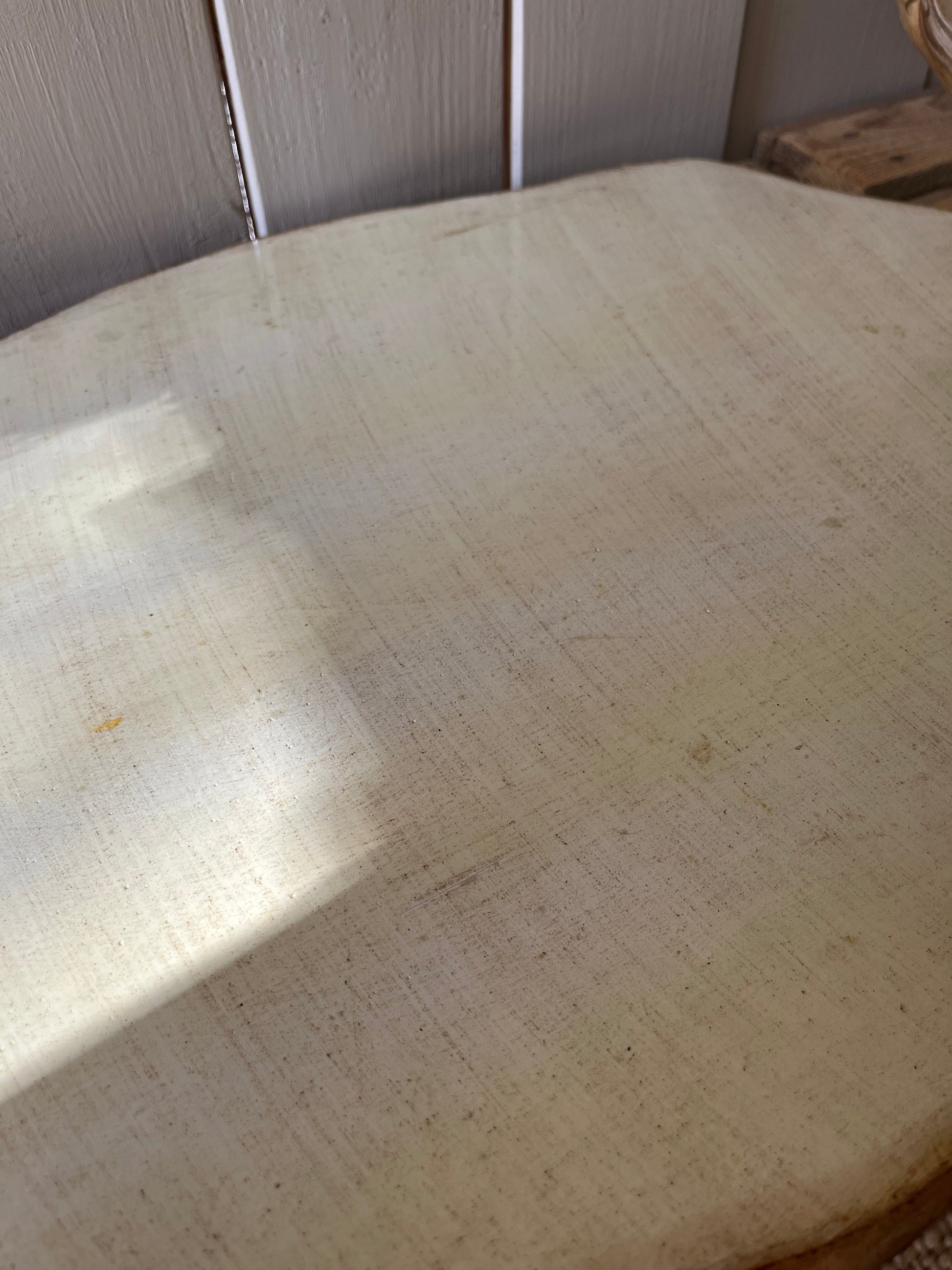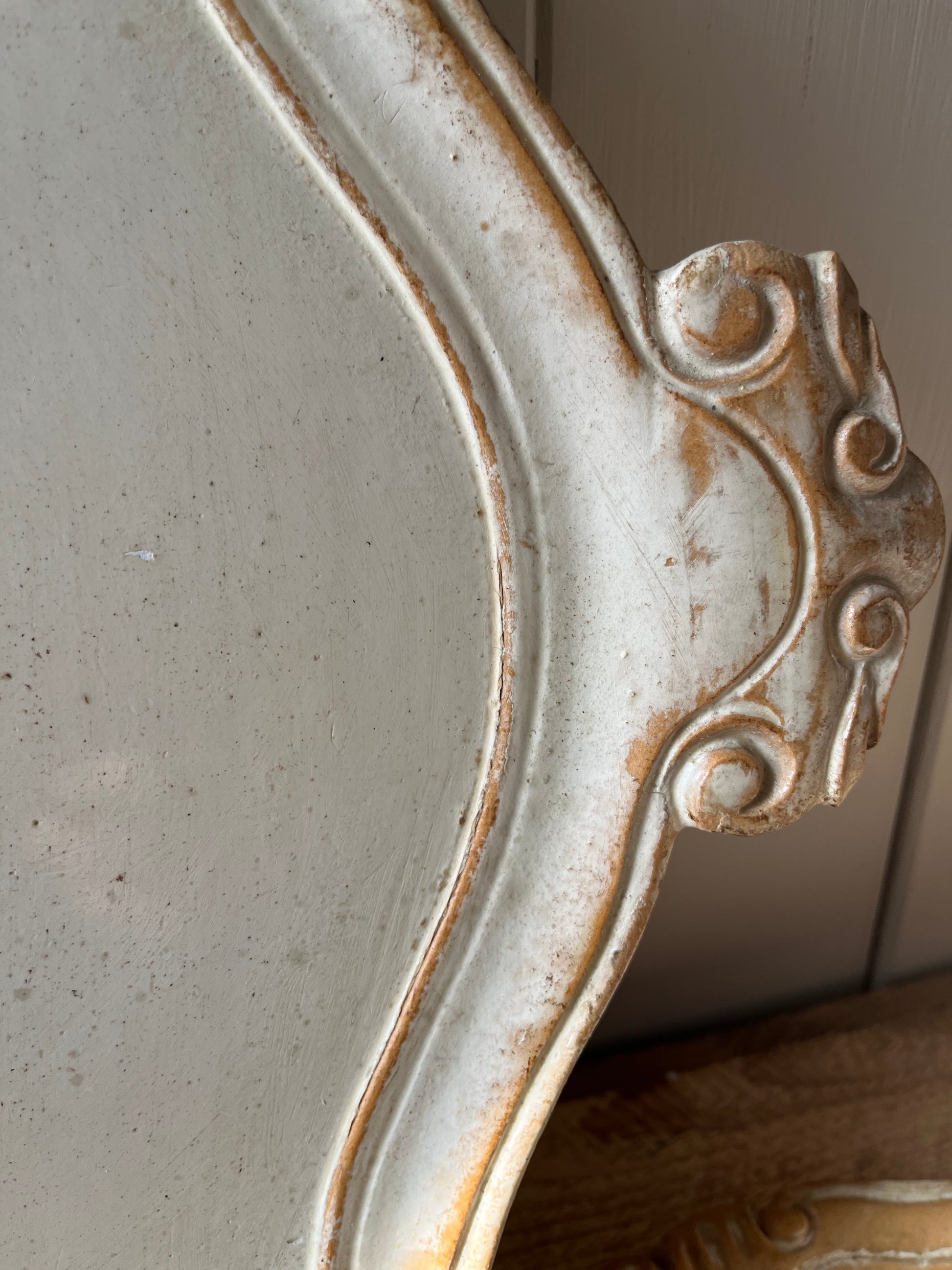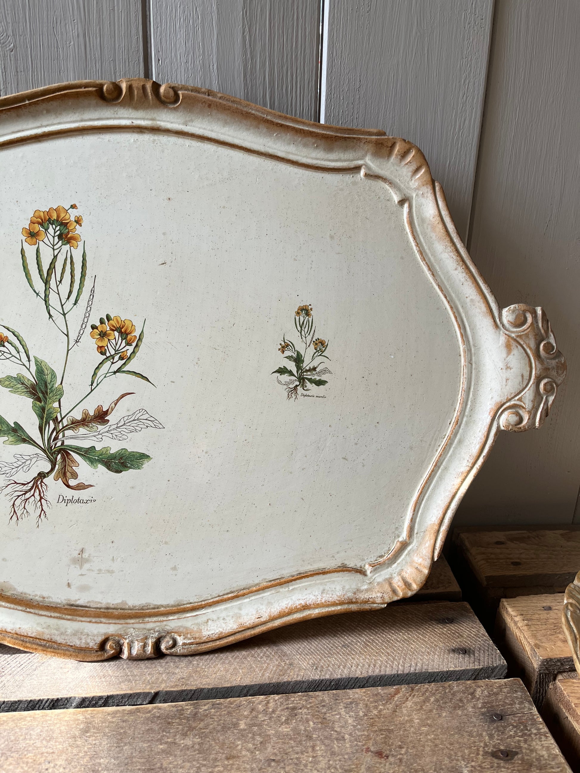 Florentinisches Holztablett, schön vintage. Es ist leicht, zart bemalt. Das Tablett ist intakt, hat aber Patina. Cremeweiß ist die Hauptfarbe, darauf zarte Blumenmalerei. Maße: 60 × 38 cm.