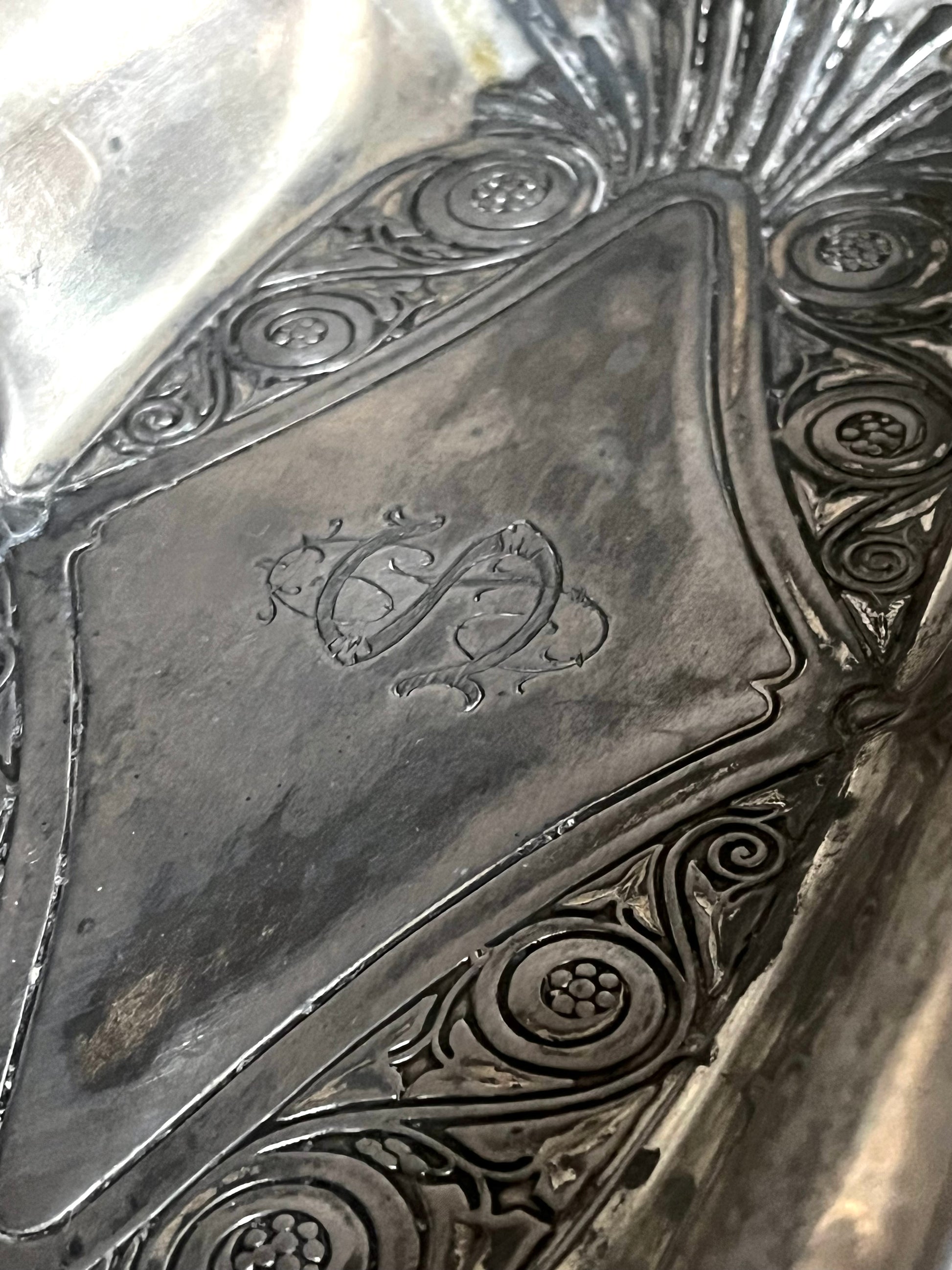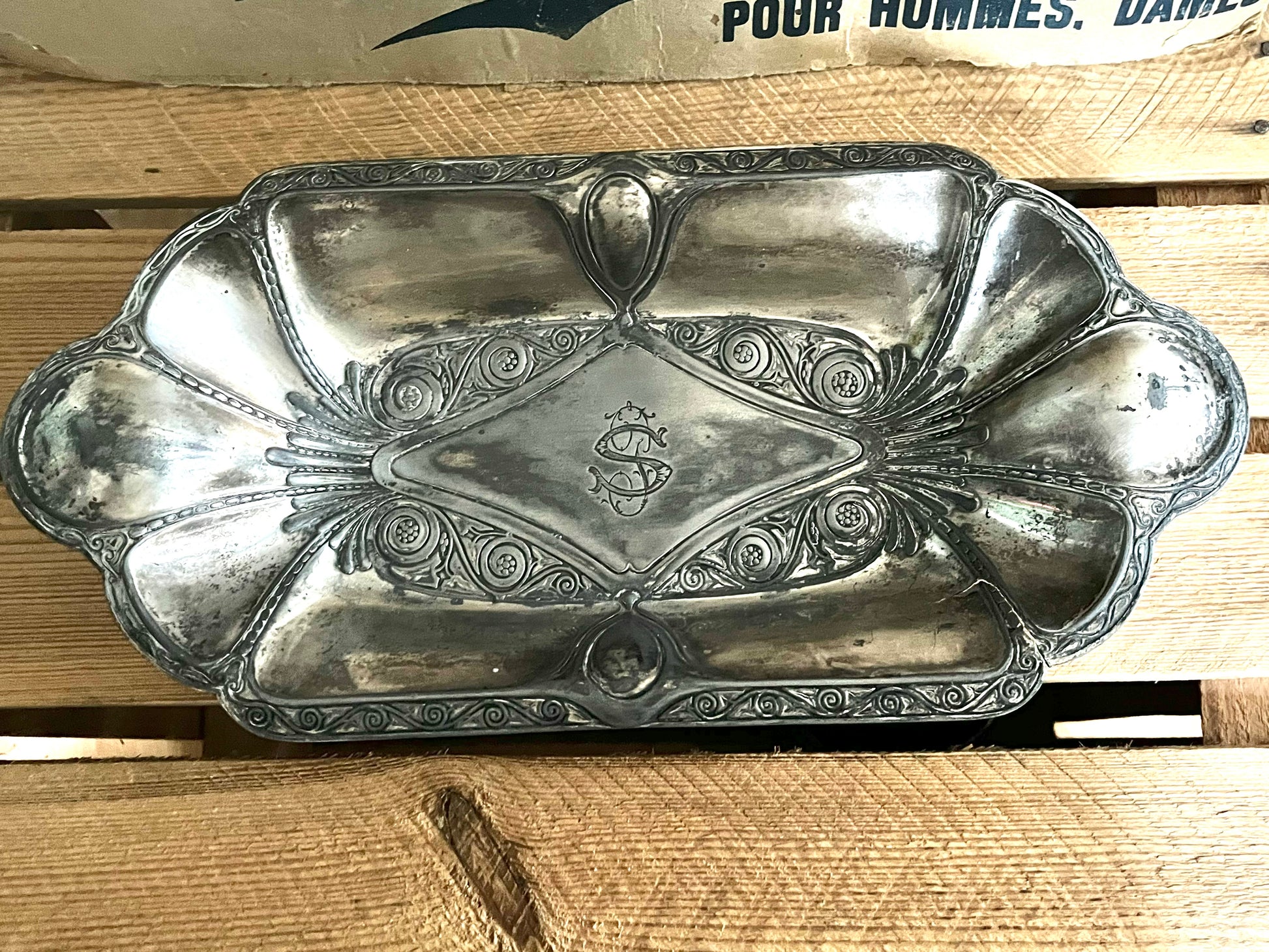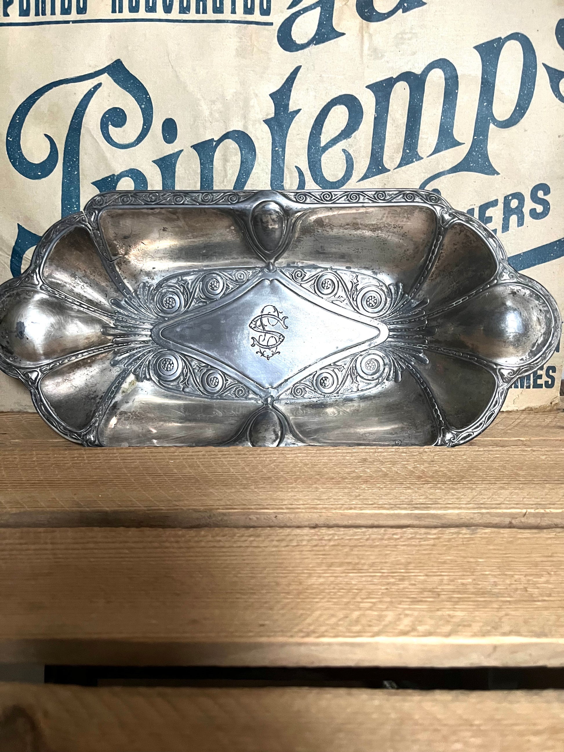Eine sehr alte, geliebte Schale aus Zinn. Sie ist schwer, stammt aus Frankreich. Mittig ein eingraviertes Monogramm. Länge: 35 cm, Breite 17 cm, Höhe 5 cm. Es gibt einen Riss am Rand, im Foto zu sehen. Das kann man wieder reparieren, es fällt aber auch nicht weiter auf. Die schöne Schale hat insgesamt Patina, Abnutzungserscheinungen. Aber das macht ihren Charme aus.