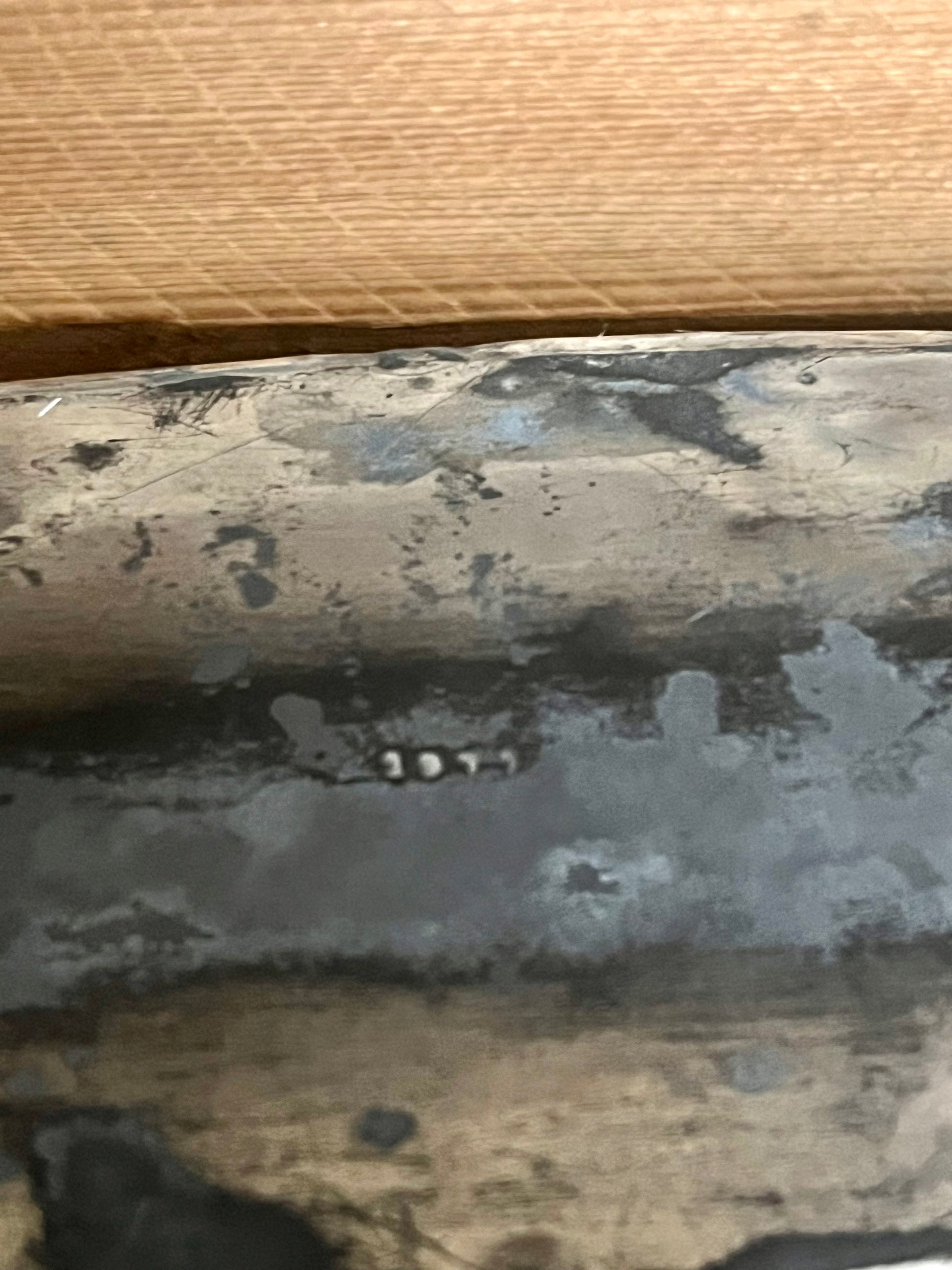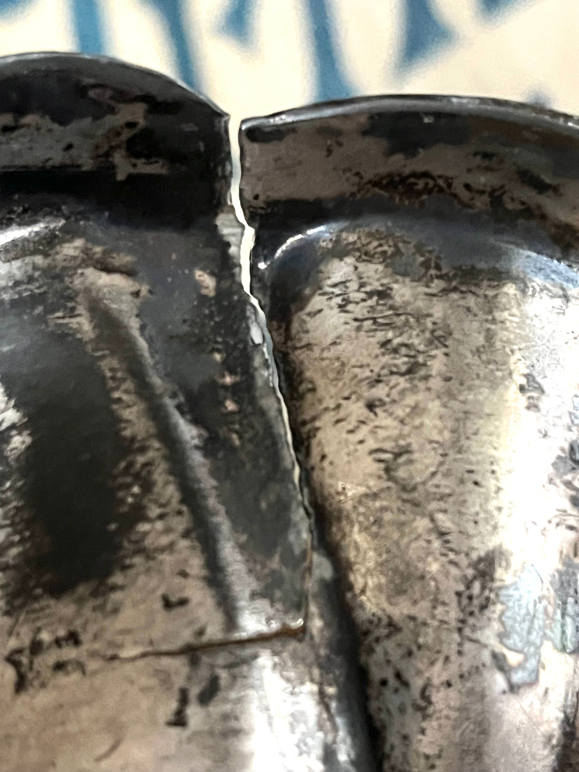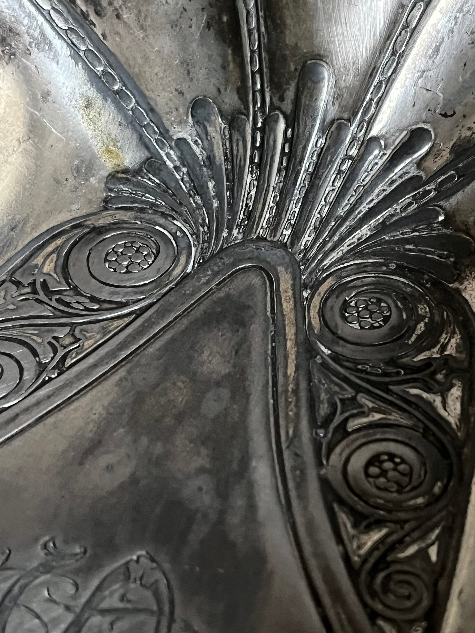 Eine sehr alte, geliebte Schale aus Zinn. Sie ist schwer, stammt aus Frankreich. Mittig ein eingraviertes Monogramm. Länge: 35 cm, Breite 17 cm, Höhe 5 cm. Es gibt einen Riss am Rand, im Foto zu sehen. Das kann man wieder reparieren, es fällt aber auch nicht weiter auf. Die schöne Schale hat insgesamt Patina, Abnutzungserscheinungen. Aber das macht ihren Charme aus.