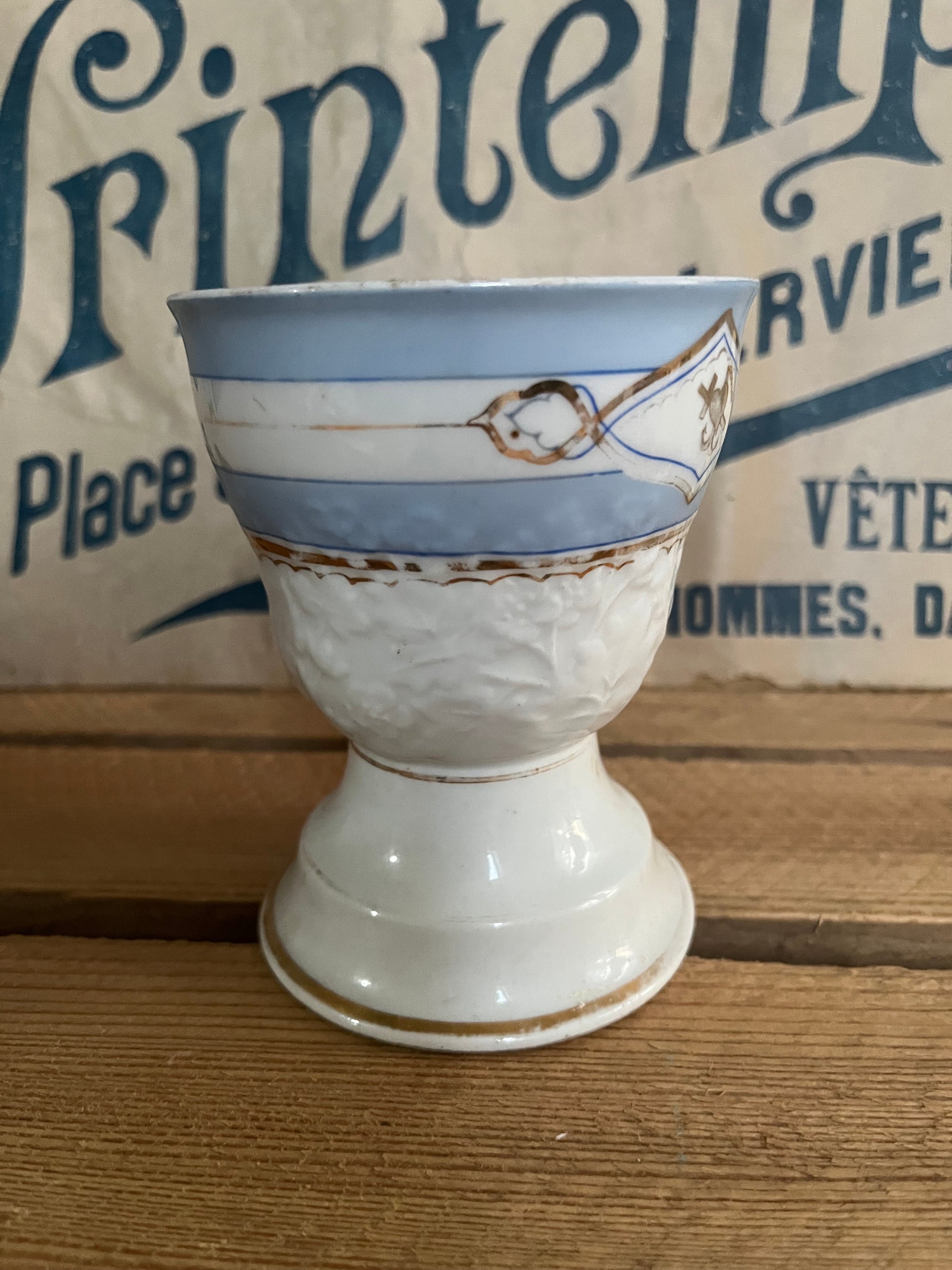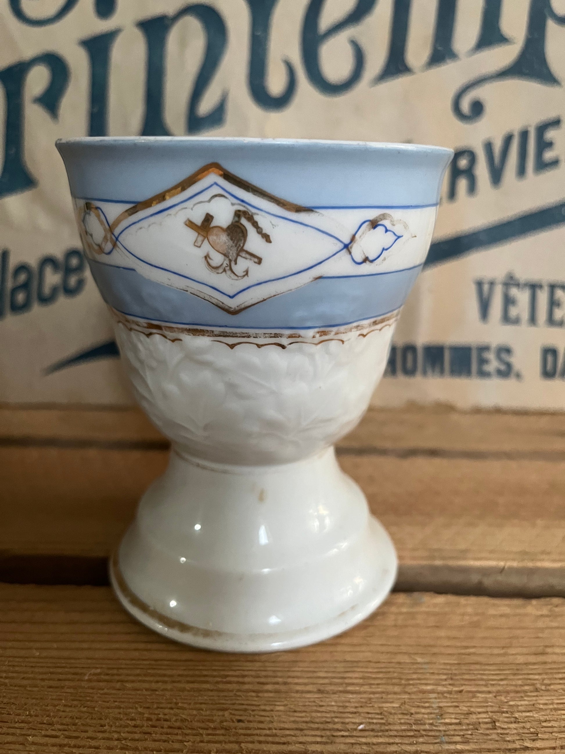 Aus solchen alten Bechern wurde früher Kakao getrunken. Kakao war etwas Besonderes, die Becher ebenfalls. Sie dienten auch als Andenken-Becher. Dieses alte Exemplar stammt aus der Biedermeierzeit, es war innen vollkommen mit Gold verziert, außen trägt es das Zeichen für Liebe, Glaube, Hoffnung. Innendrin Goldabrieb, außen ebenfalls etwas. Keine Verletzungen, Patina, aber das macht den Charme dieses alten Stücks aus.