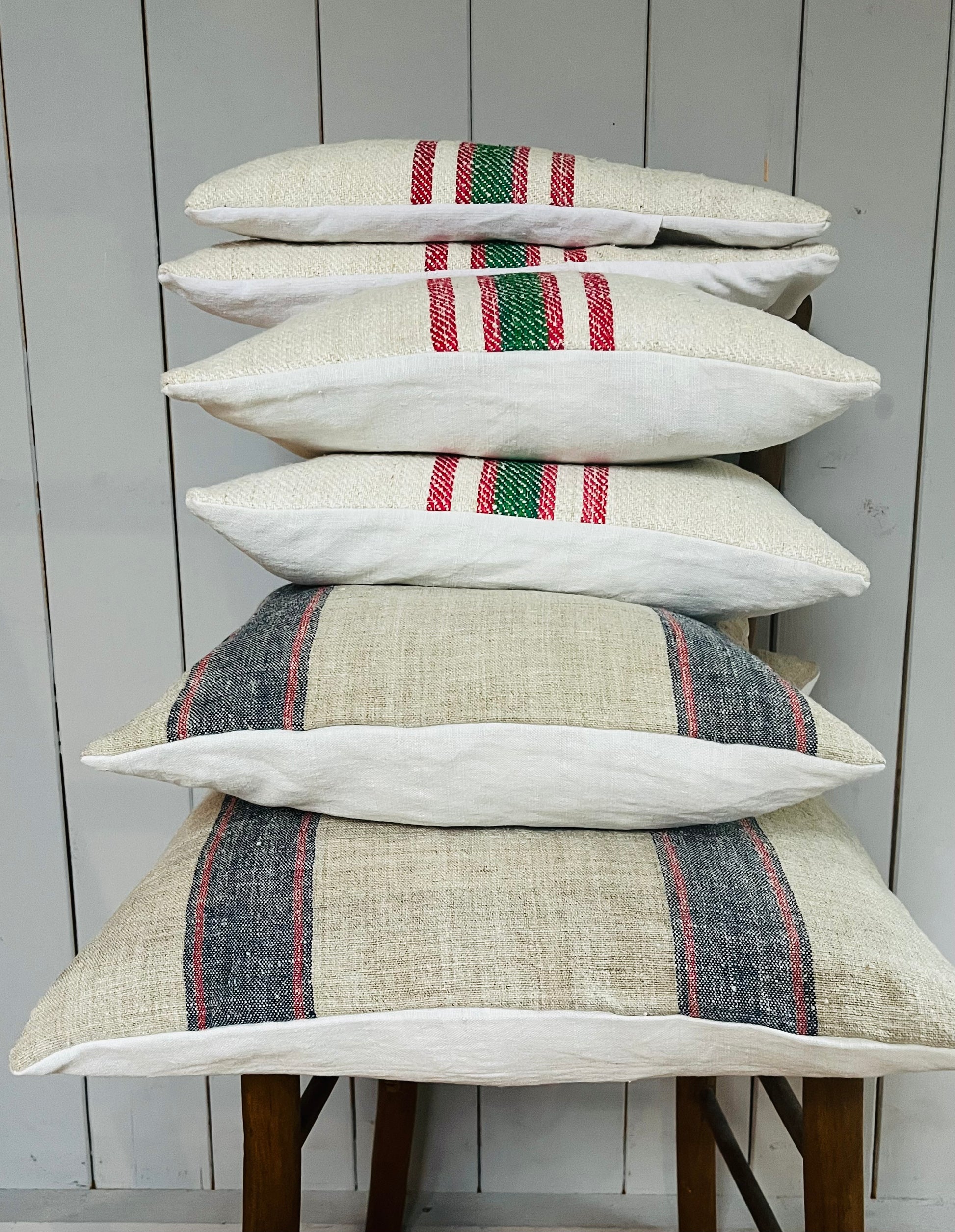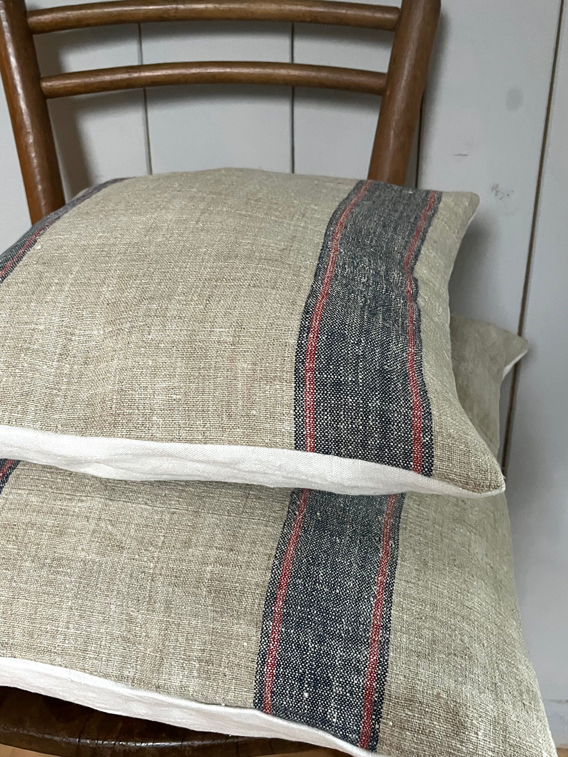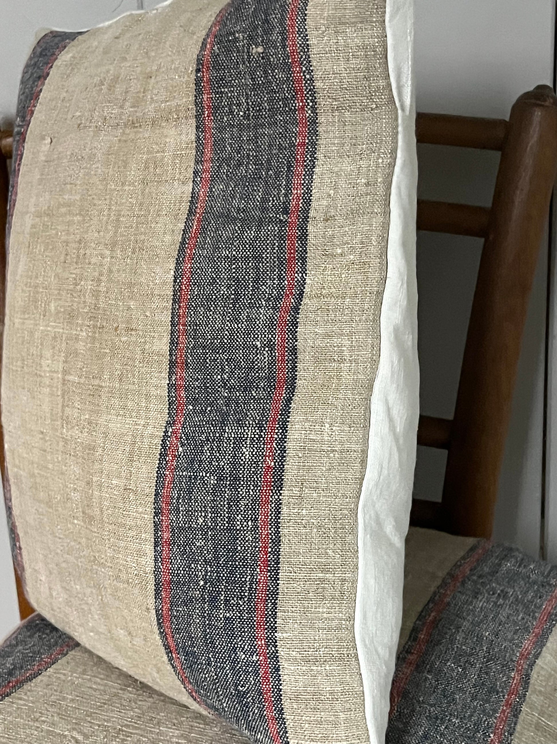 Blau/Rot gestreift: Vintage Kissen aus altem Leinensack 50 x 50