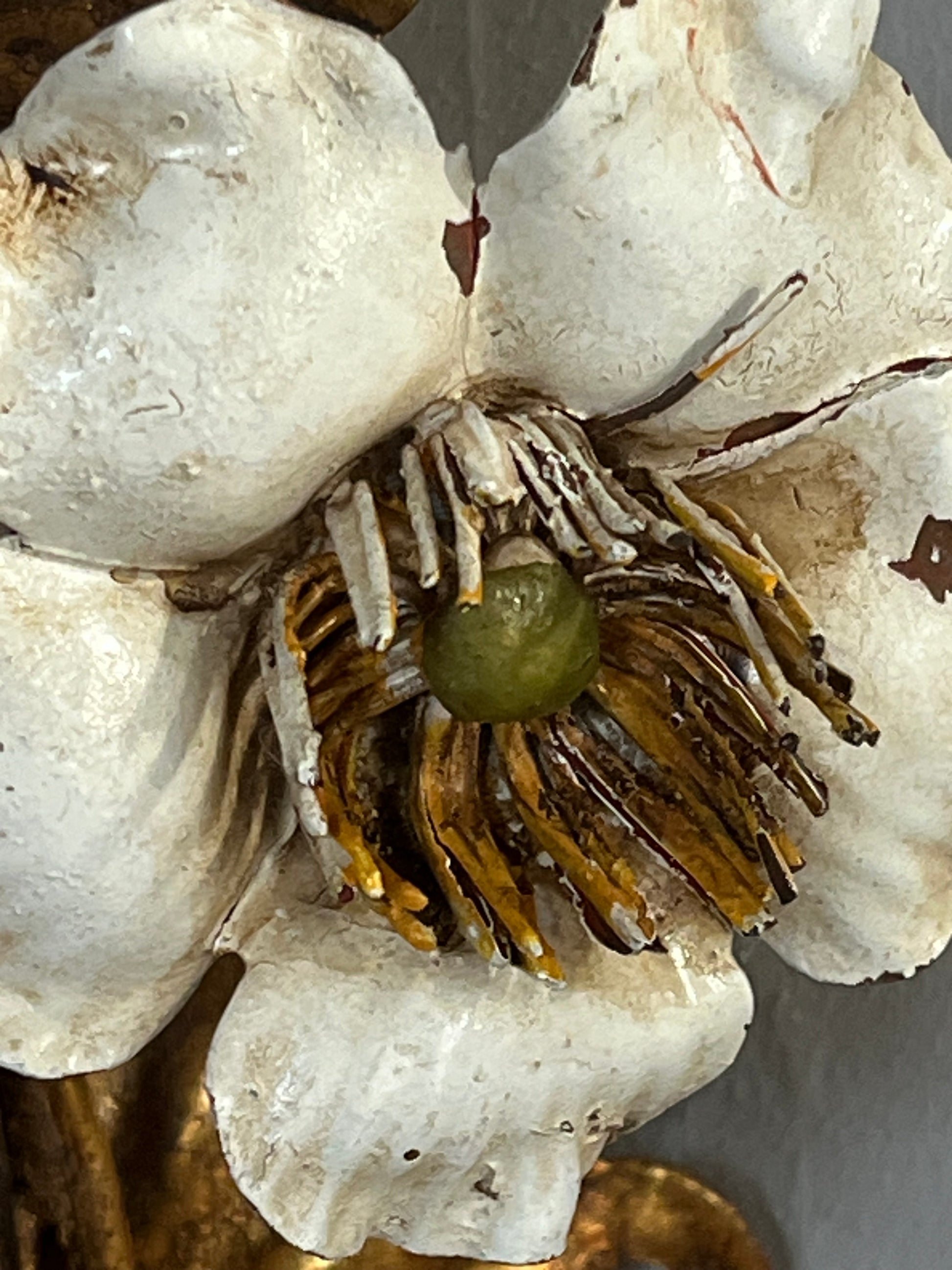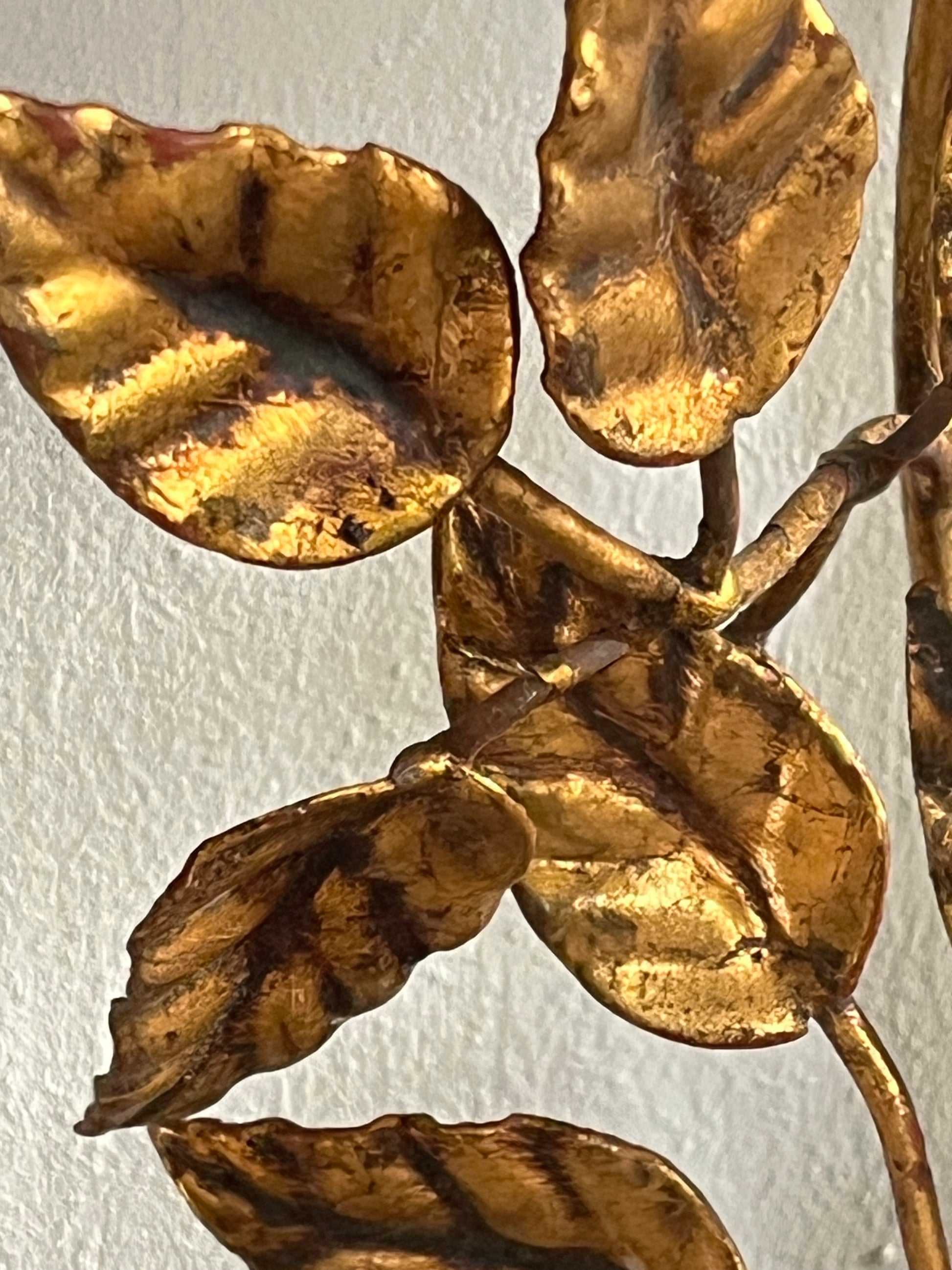 Wunderschönes, altes Schmuckstück für die Wand: Eine Lampe im florentinischen Stil. Sie ist für Glühbirnen gefertigt, lässt sich aber auch für Kerzen umarbeiten. Sie besteht aus vielen Metallblättern in Antik-Gold, dazu zwei Blüten. Die Blütenblätter sind weiß lackiertes Metall, im Inneren ein Jade-grüner Stein. Halterung für das Anbringen an der Wand vorhanden. Wunderbar erhalten, sie müsste noch mal etwas detaillierter sauber gemacht werden. Insgesamt 33 cm hoch, 23 cm breit.