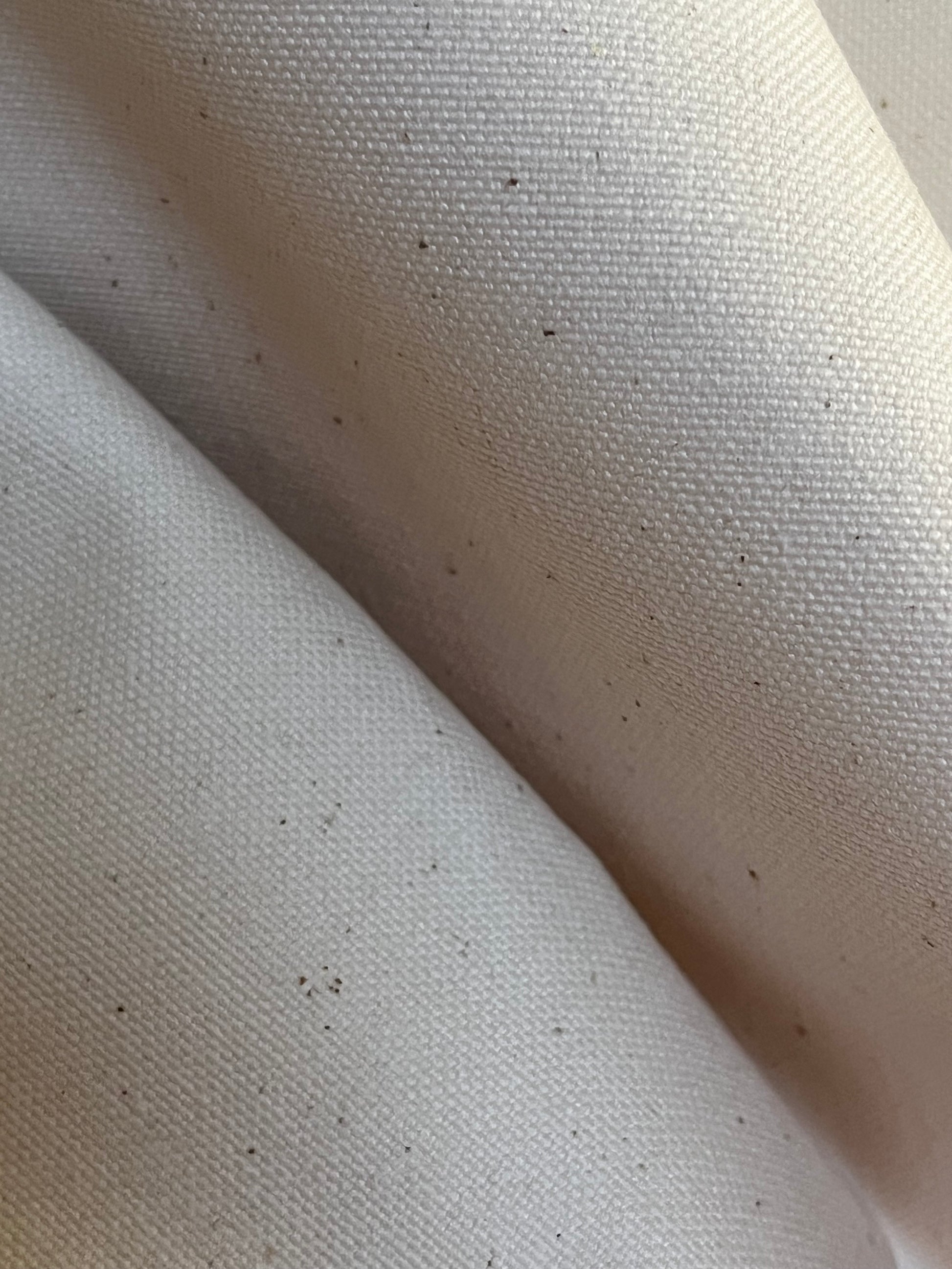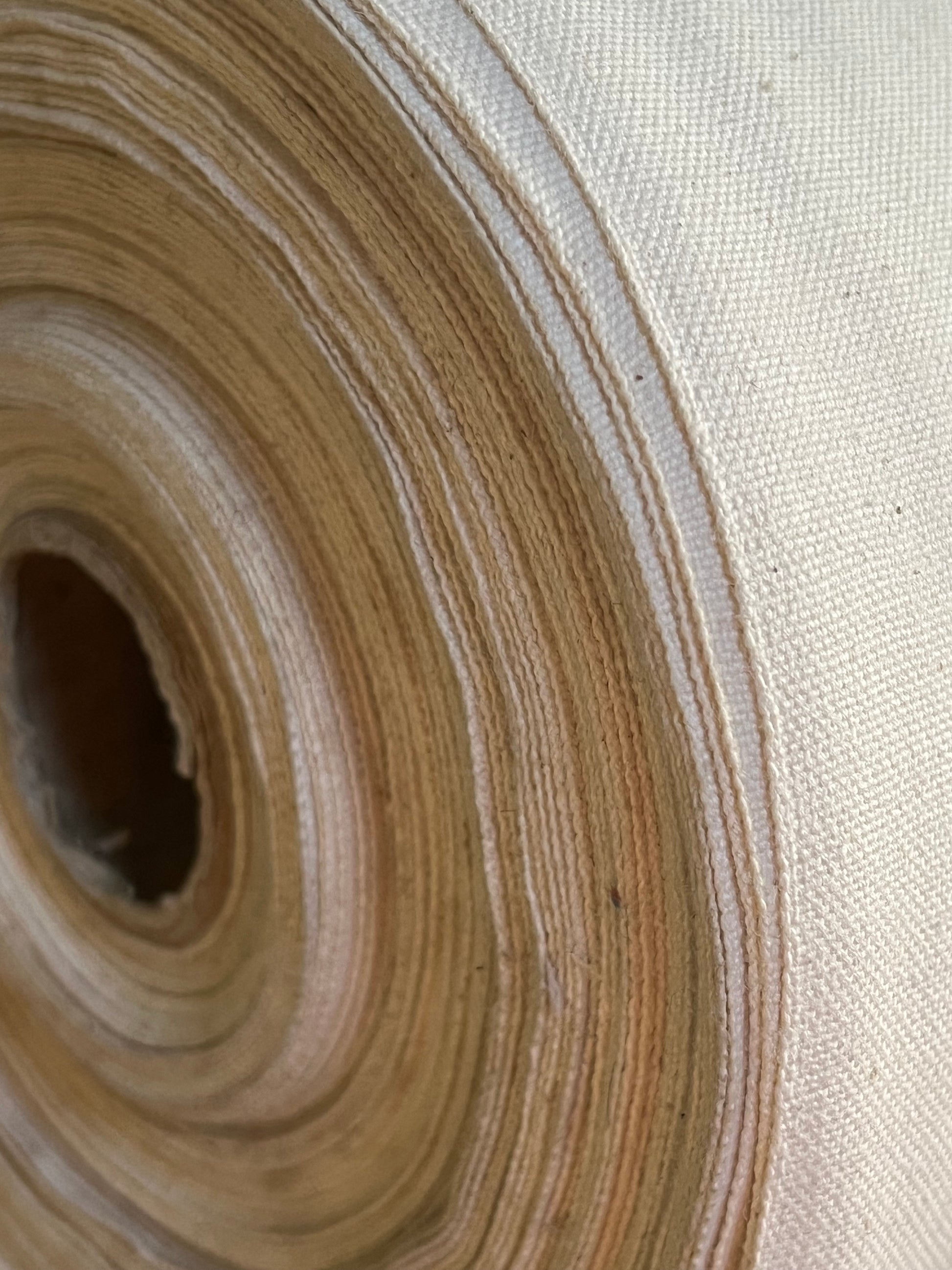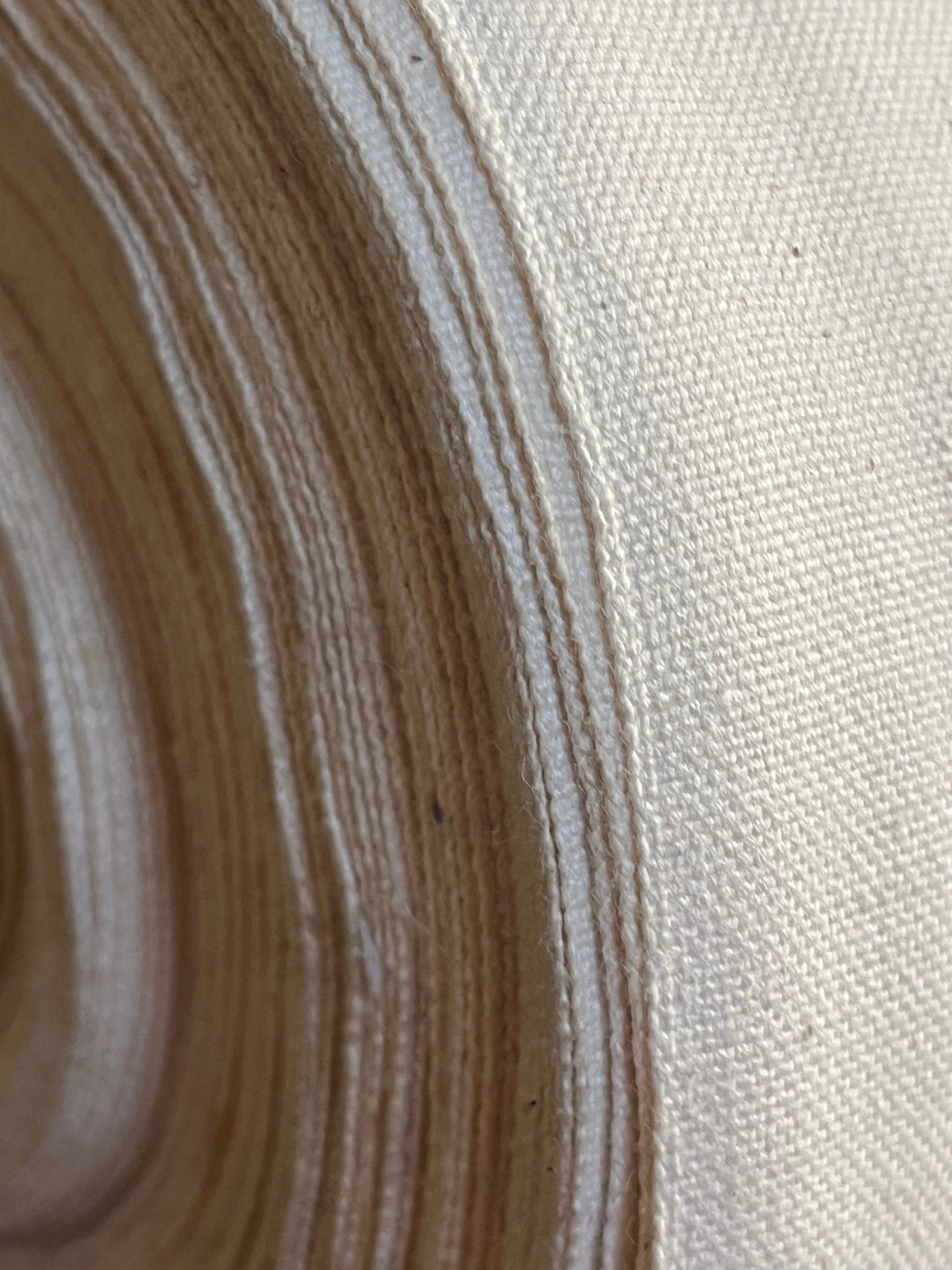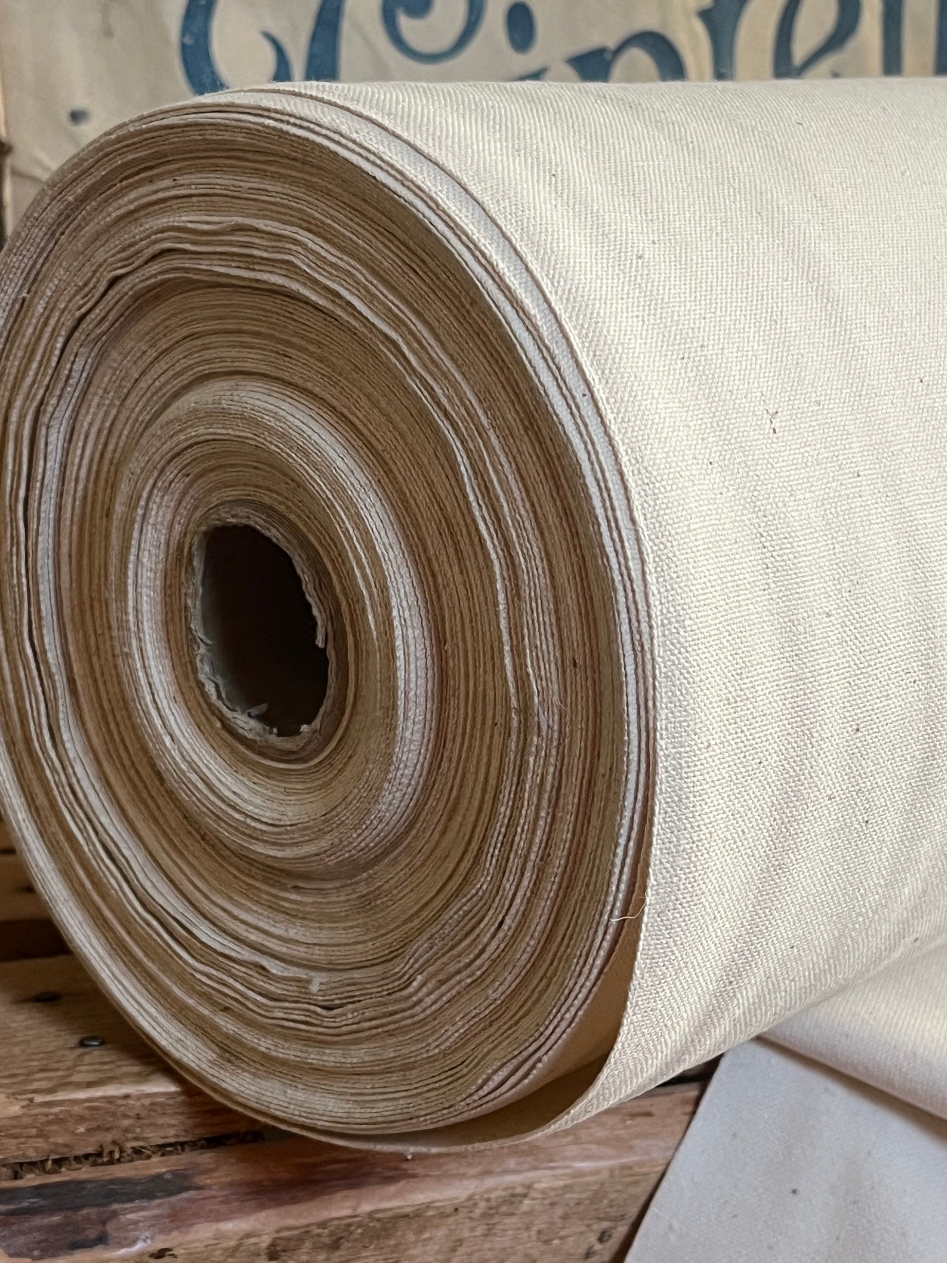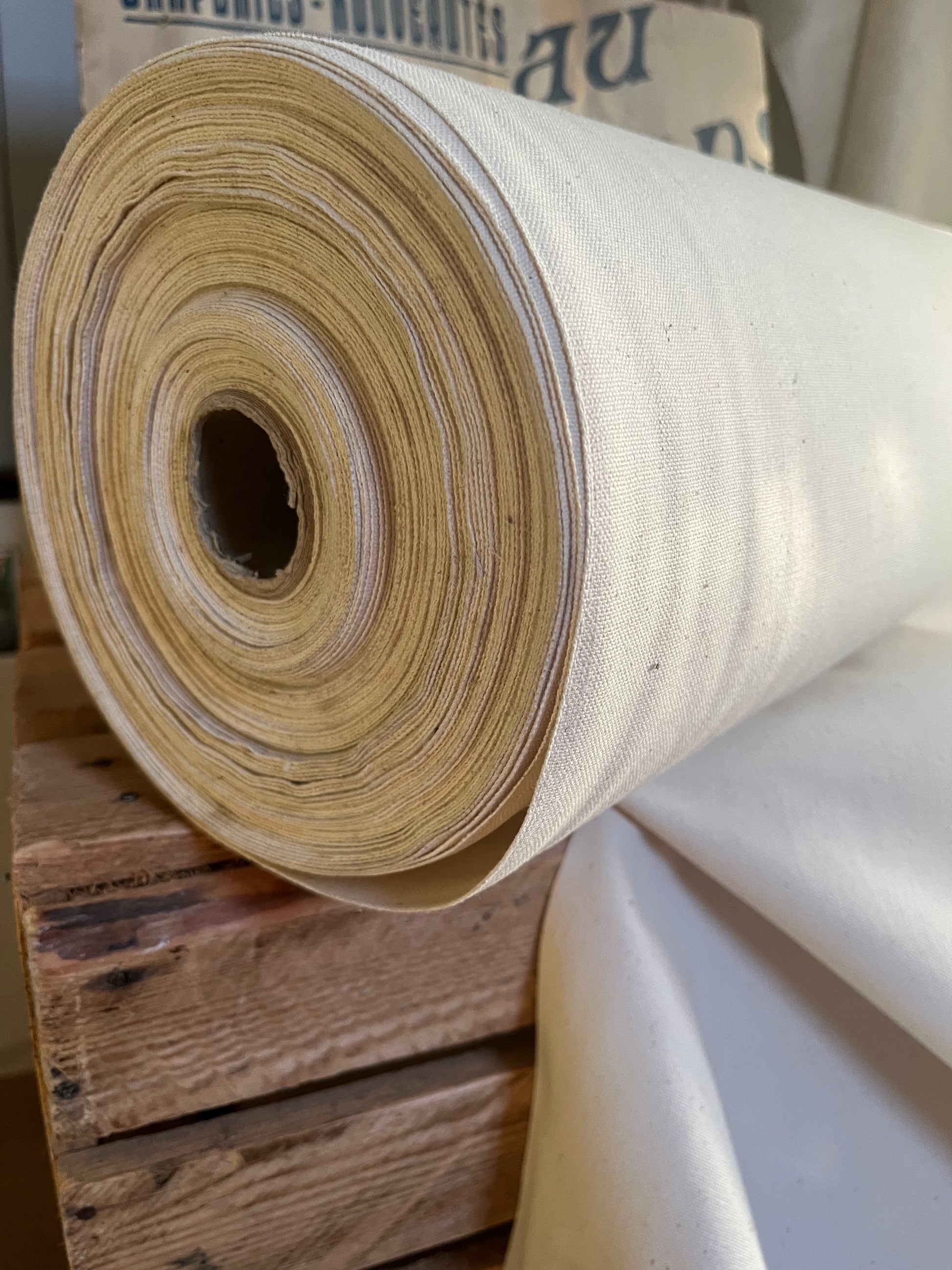 Bäckerleinen oder Gärtuch kommt dann zum Einsatz, wenn besonders Hefeteig ruhen soll. Das Tuch schützt den Teig davor auszutrocknen und vor Zugluft. Es ist dicht gewebt, so dicht, dass der Teig nicht durch das Gewebe quillt oder haften bleibt. Das Leinen wird, bevor der Teig darauf kommt, mit etwas Mehl bestäubt. Es nimmt Feuchtigkeit gut auf und gibt sie wieder ab. Bäckerleinen ist außerdem wunderbar geeignet, um darauf zu malen. Man kann es also auch als Leinwand verwenden, es muss aber vorher behandelt werden. Dieses Leinen stammt von einem Bäcker, ist etwa 50 Jahre alt, unbehandelt. Es misst in der Breite circa 56 cm. Man kann es ganz normal in der Waschmaschine waschen, aber nicht mit Bleiche oder chemischen Fleckenreinigern behandeln. Der Stoff wird pro Meter verkauft.