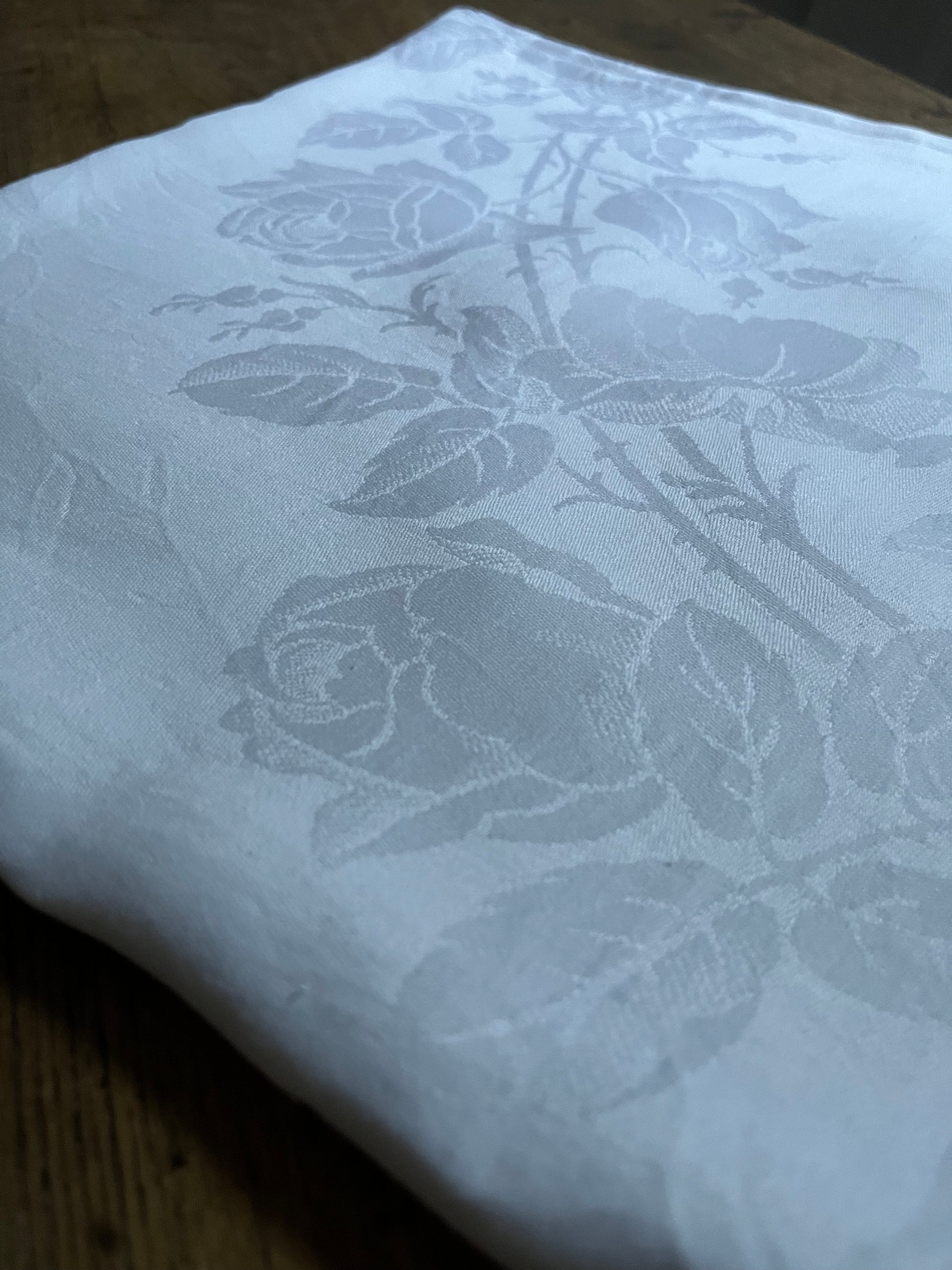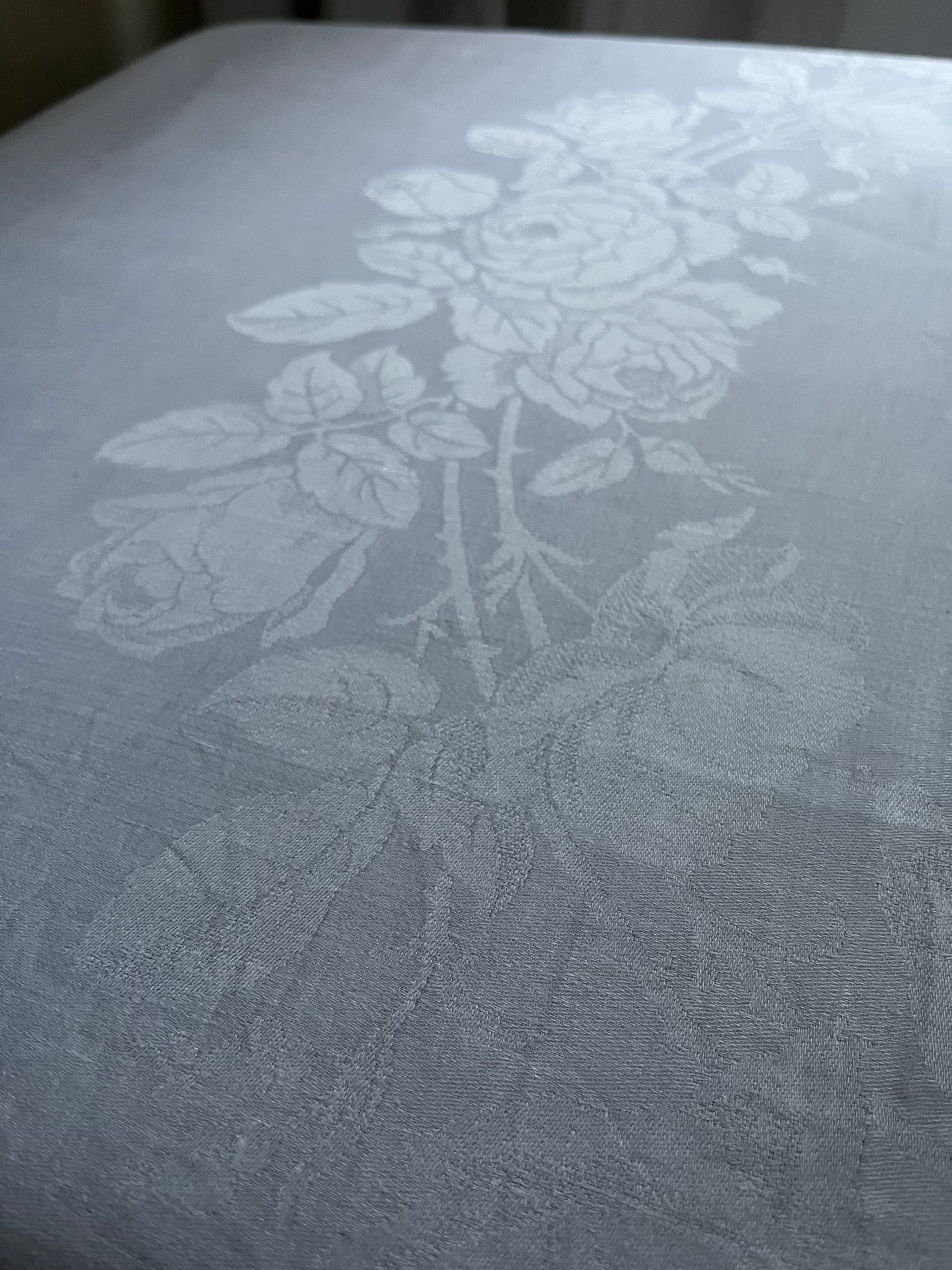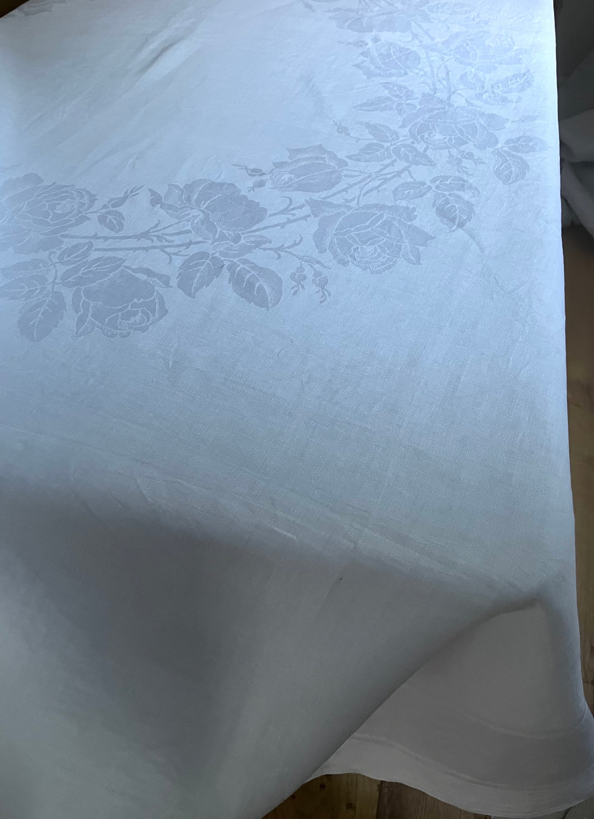 Mit Damast-Decken liegt man niemals falsch. Es ist eine große Tischdecke, sie passt über einen mittleren Tisch und hat die Maße 160 × 150, dazu ein besonders schönes eingewebtes Muster, das sich in der Mitte der Decke befindet. Es handelt sich um einen breiten Rosenkranz. In einer Ecke befindet sich ein gesticktes Monogramm. Die Decke Ist toll erhalten, kann sofort benutzt werden. Feines Leinen, etwa aus den späten 1940er Jahren.