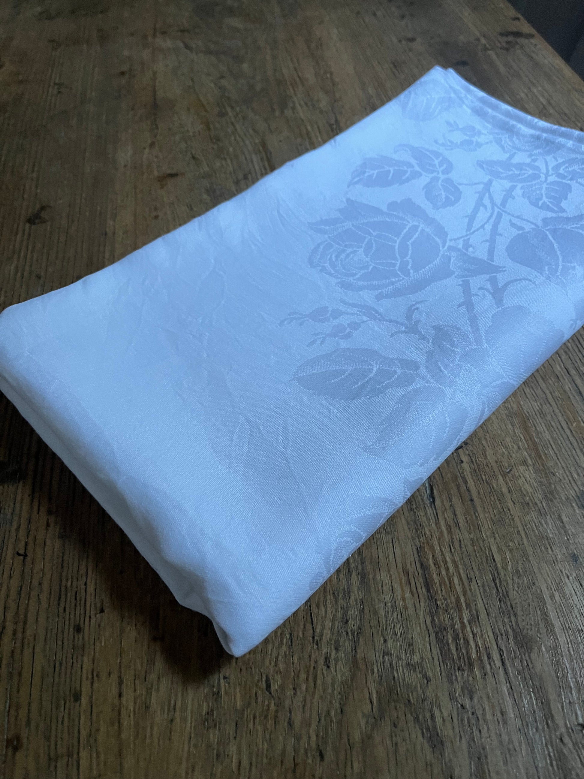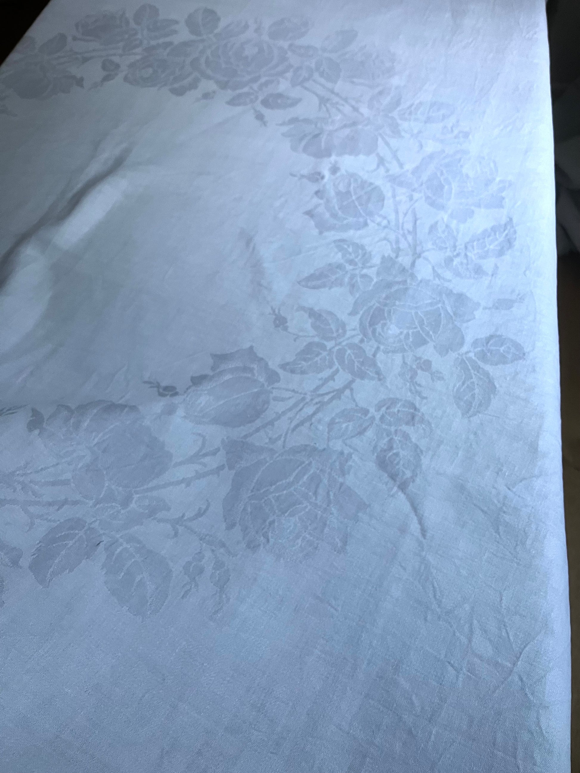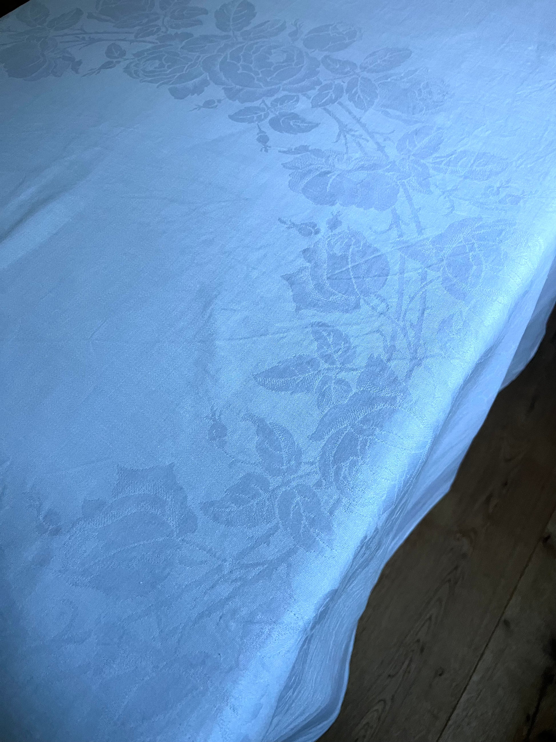 Mit Damast-Decken liegt man niemals falsch. Es ist eine große Tischdecke, sie passt über einen mittleren Tisch und hat die Maße 160 × 150, dazu ein besonders schönes eingewebtes Muster, das sich in der Mitte der Decke befindet. Es handelt sich um einen breiten Rosenkranz. In einer Ecke befindet sich ein gesticktes Monogramm. Die Decke Ist toll erhalten, kann sofort benutzt werden. Feines Leinen, etwa aus den späten 1940er Jahren.