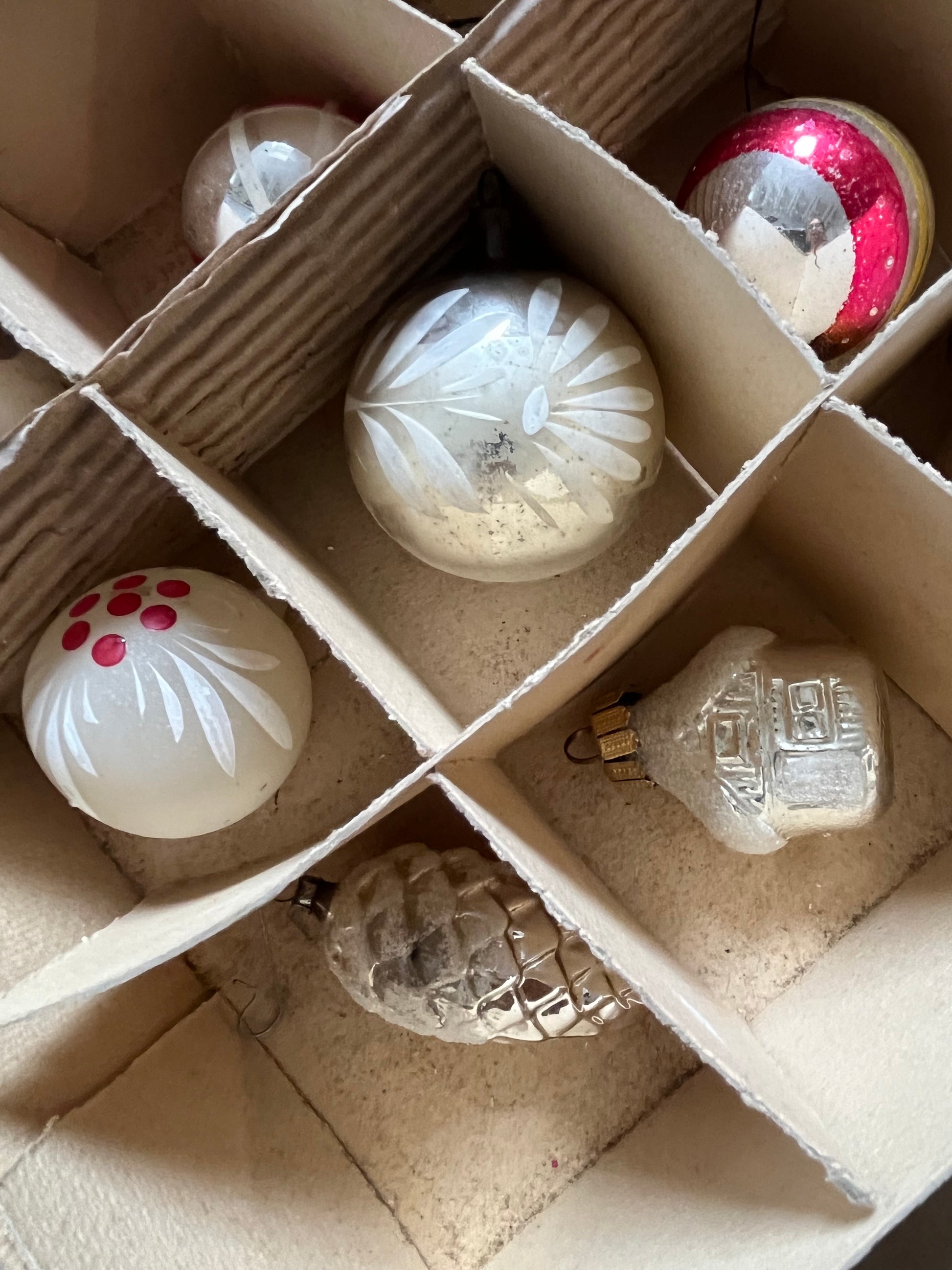 Ist schon wieder soweit? Für Weihnachtsschmuck ist doch eigentlich immer Zeit. In diesem Karton liegt alter Baumschmuck: Insgesamt 12 Formteile - Weihnachtskugeln, Zapfen, Pilz, Haus und Glocke. Sie sind intakt, haben ein bisschen Patina. Und freuen sich auf den Tannenbaum. Da sie nicht schlecht werden, kann man sie auch jetzt schon einlagern.