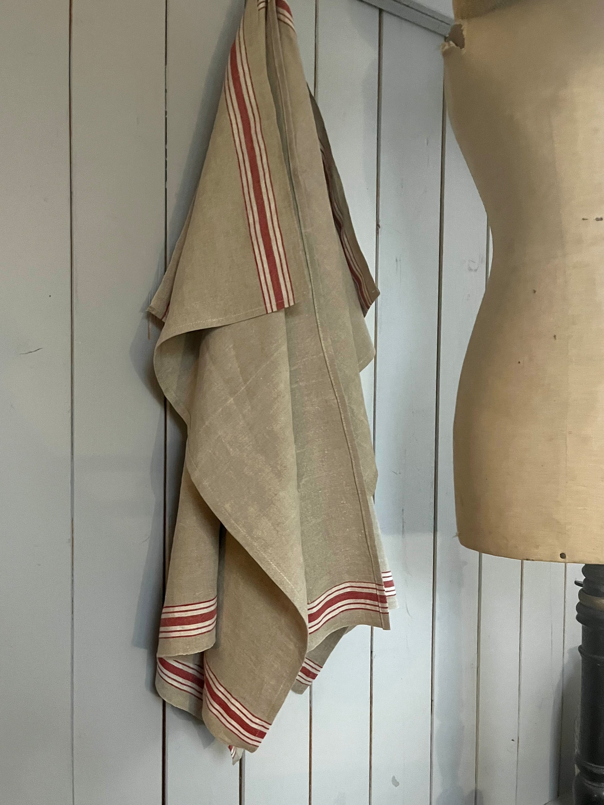 Aus altem Leinen genähtes Tuch mit tiefroten und weißen Streifen oben und unten. Maße: ca. 86 × 48 cm. Leinenfarbe: ein dunkles Beige. Das Tuch ist schön erhalten. Aber immer bedenken: es ist antikes, altes Leinen, Lagerspuren können immer mal irgendwo auftauchen. Sie machen den Charme der alten Stücke aus. Unbenutzt. Auch als Tischläufer zu verwenden. Aufhänger vorhanden.
