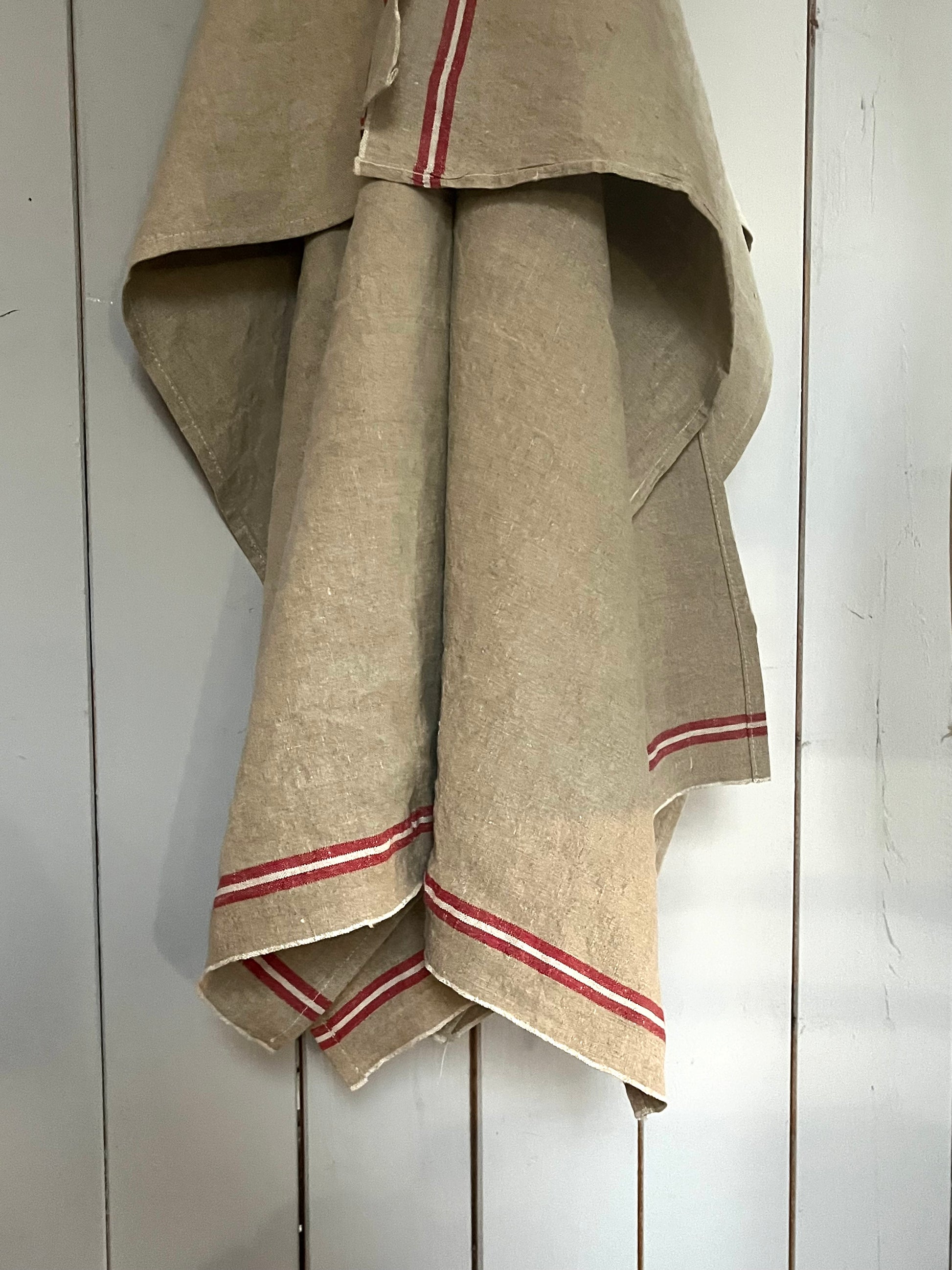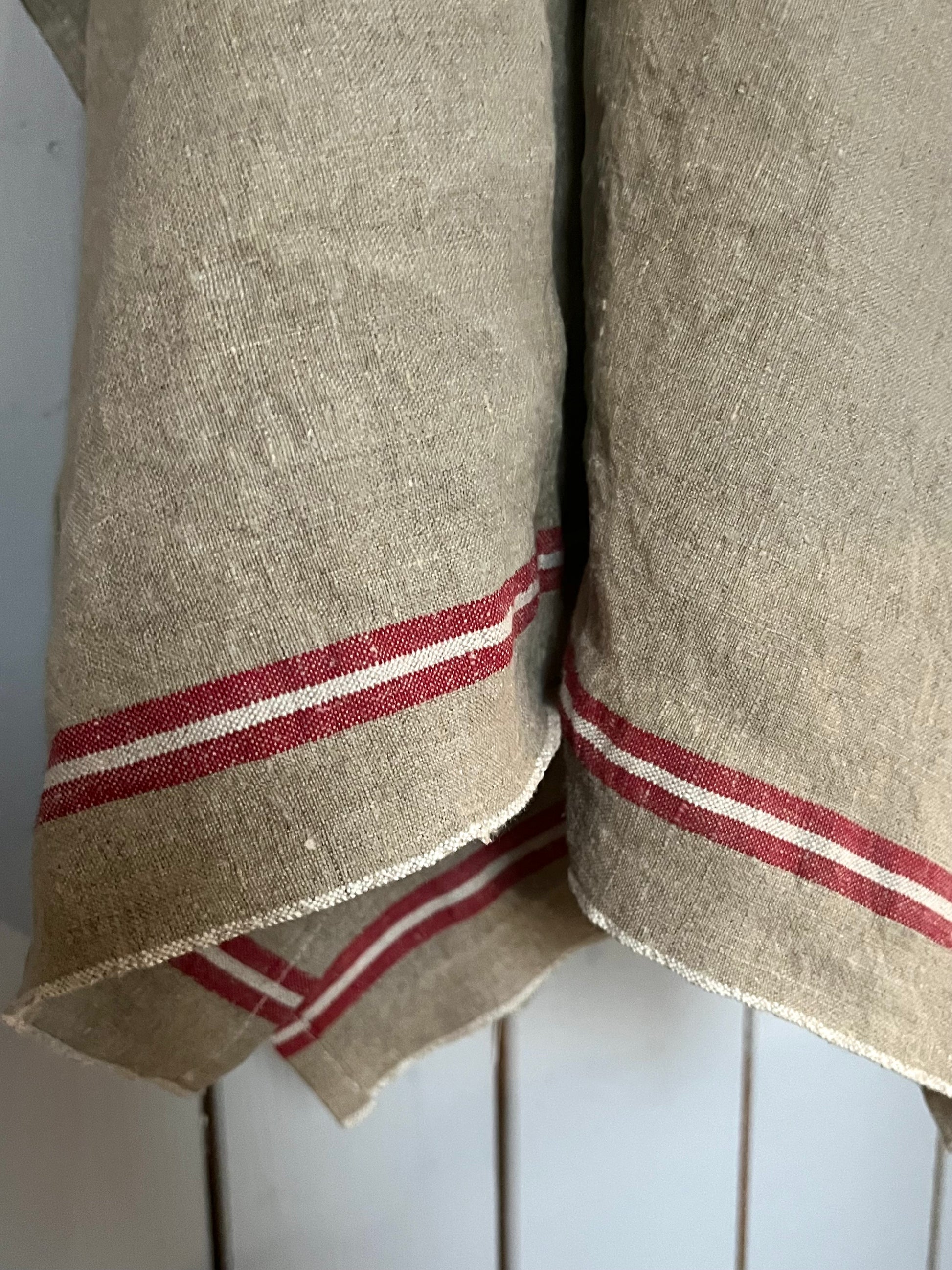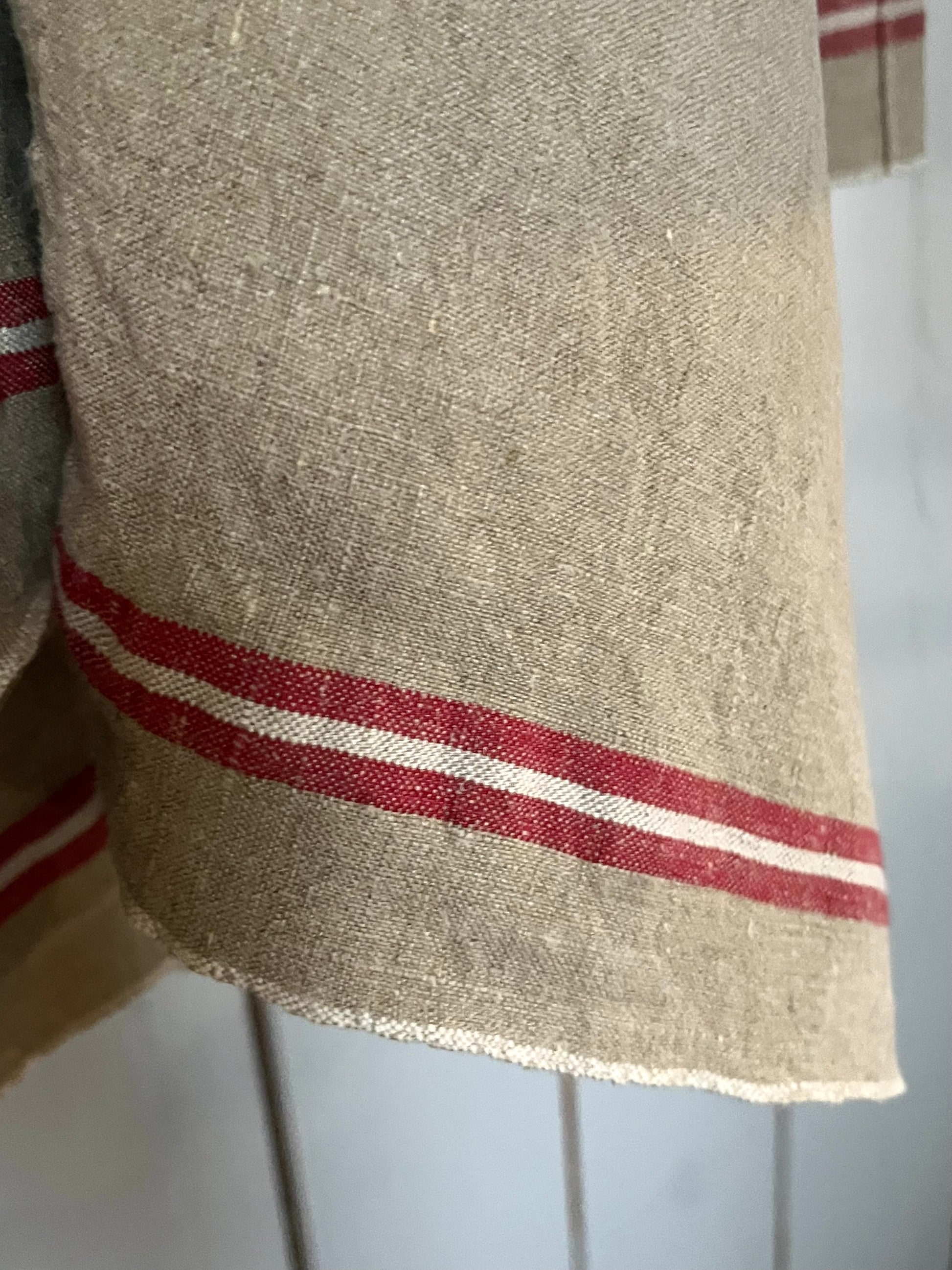 Aus altem Leinen genähtes Tuch mit tiefroten Streifen oben und unten. Maße: ca. 76 × 45 cm. Leinenfarbe: ein dunkles Beige. Das Tuch ist schön erhalten. Unbenutzt. Auch als Tischläufer zu verwenden. Aufhänger vorhanden.