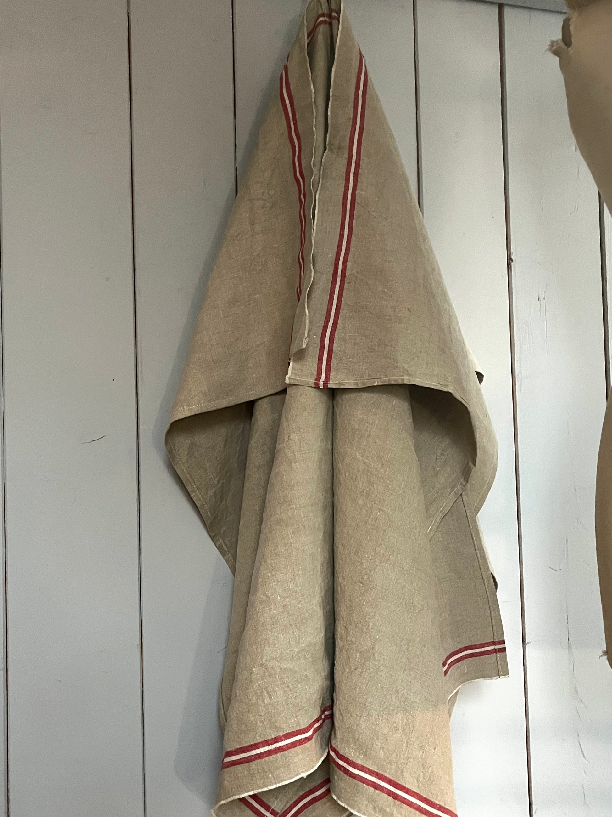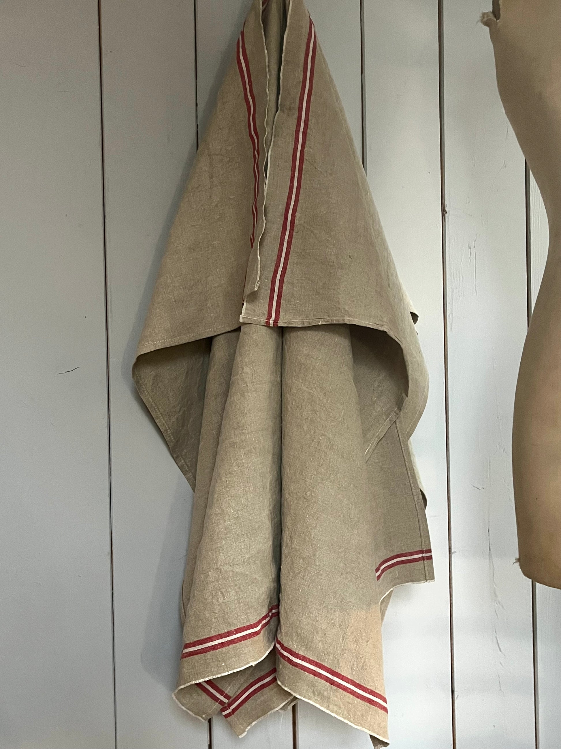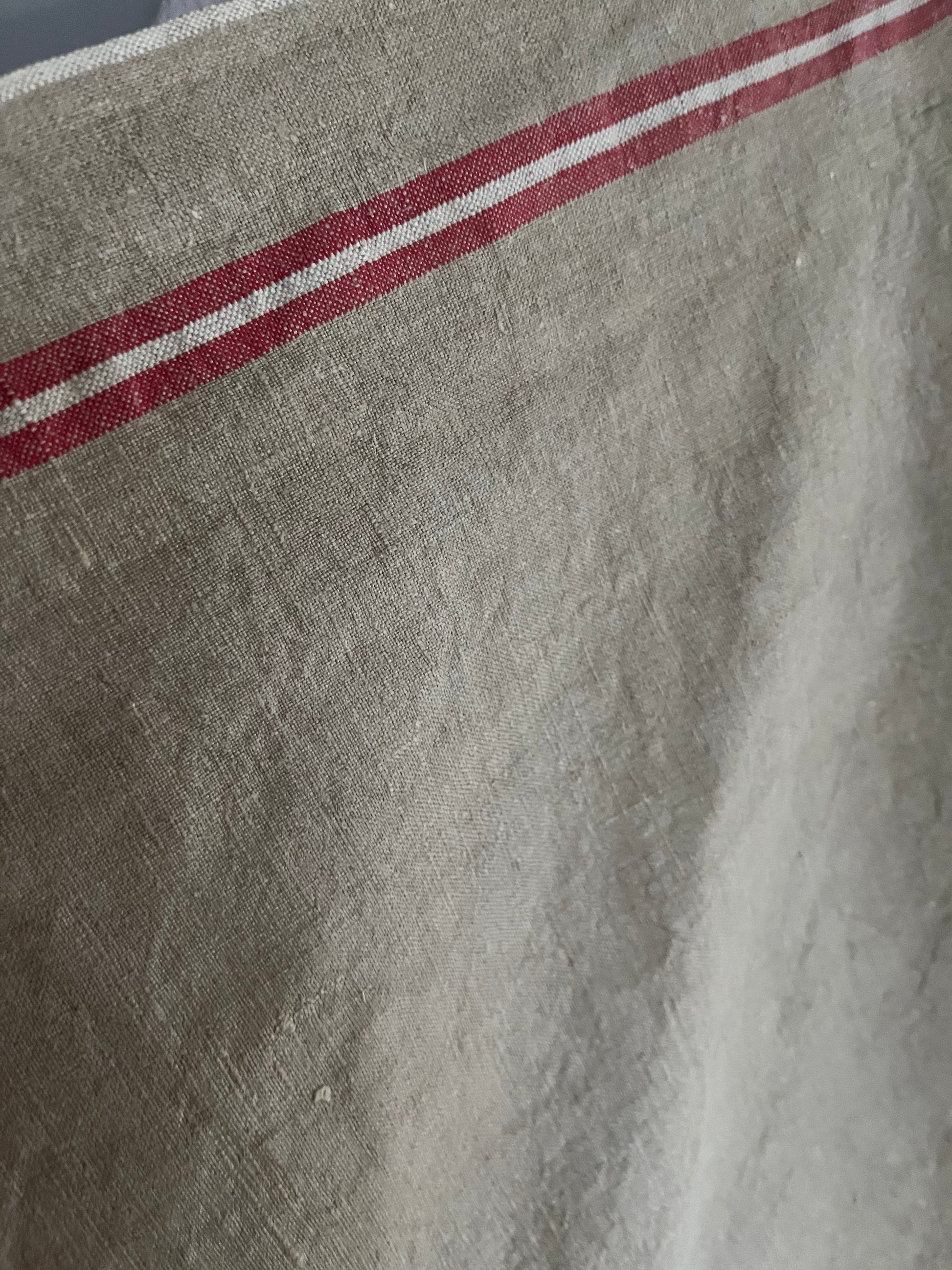 Aus altem Leinen genähtes Tuch mit tiefroten Streifen oben und unten. Maße: ca. 76 × 45 cm. Leinenfarbe: ein dunkles Beige. Das Tuch ist schön erhalten. Unbenutzt. Auch als Tischläufer zu verwenden. Aufhänger vorhanden.